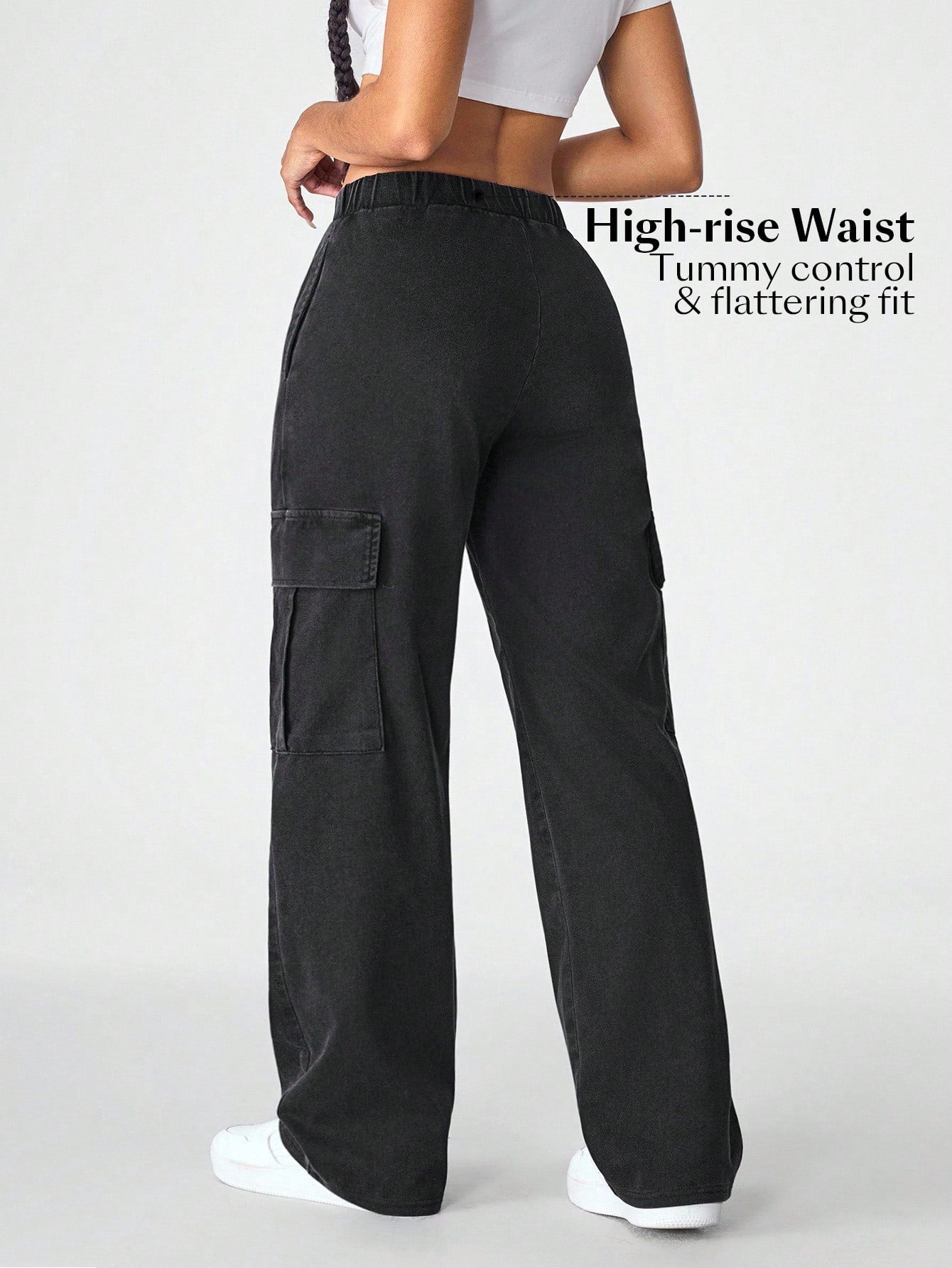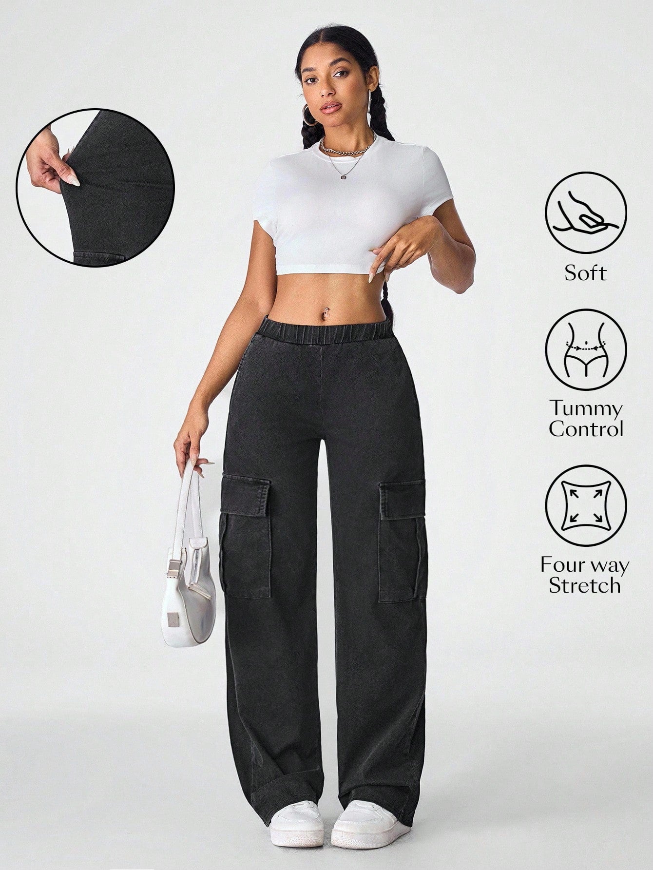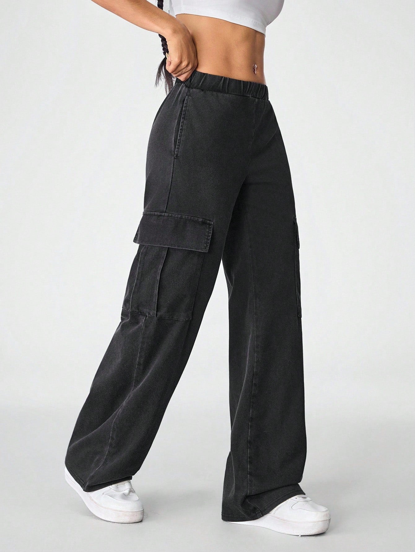 Jeans casual larghi con vita elastica e tasche cargo per donna