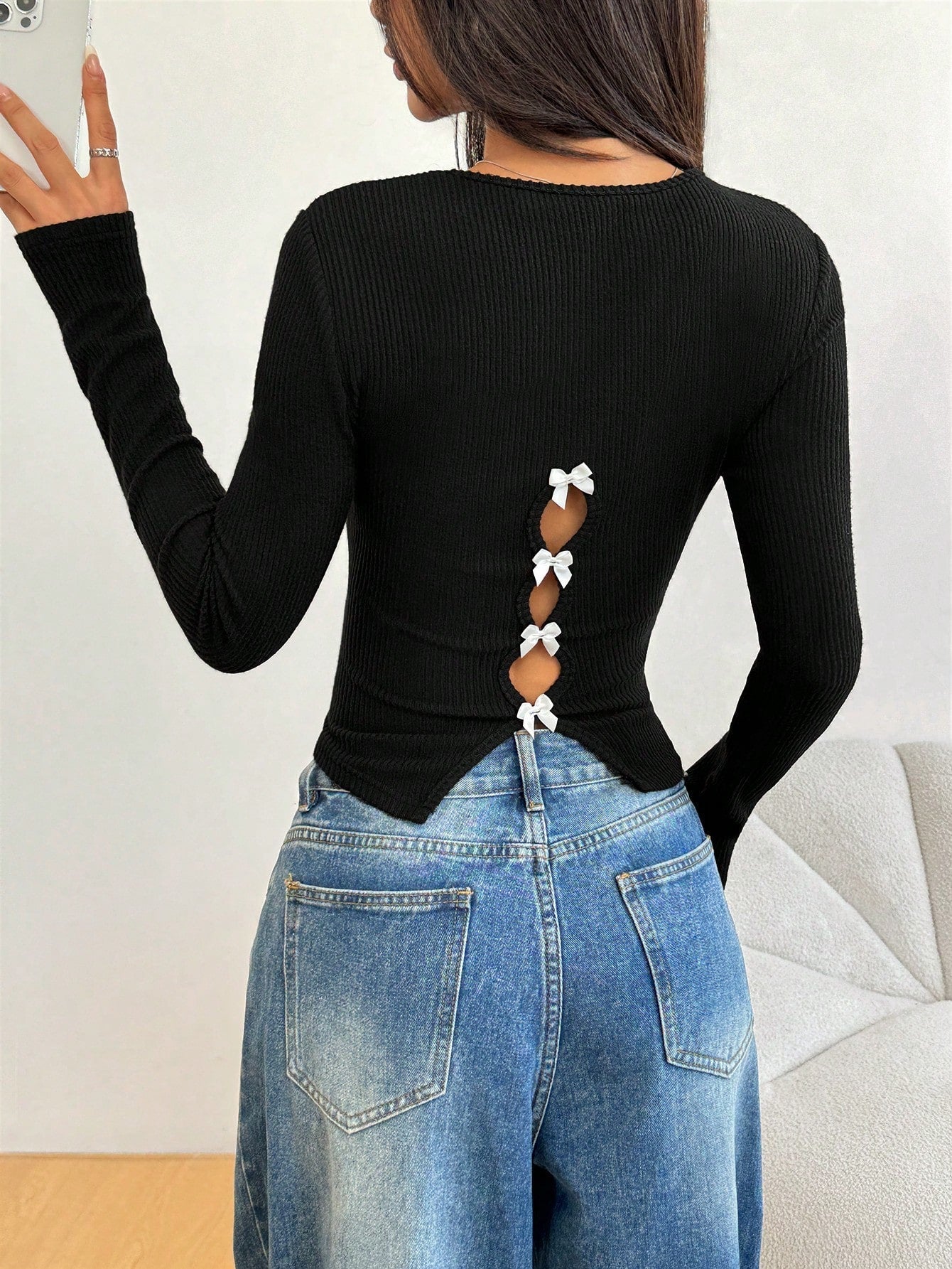 Maglia casual e dolce da donna con schiena a fiocco vuoto, colletto tondo