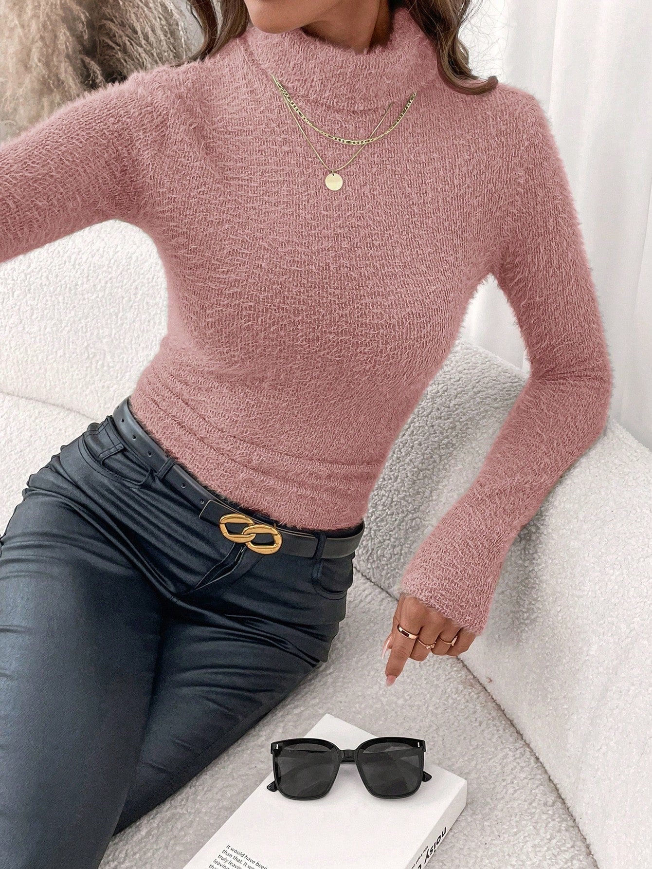 Maglia elegante e confortevole da donna per l'inverno, collo alto, maniche lunghe, in maglia garzata, top termico sottile ed elastico