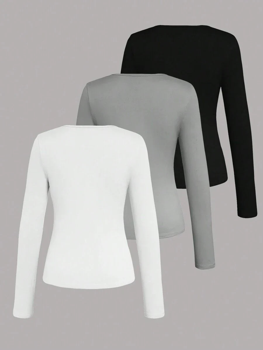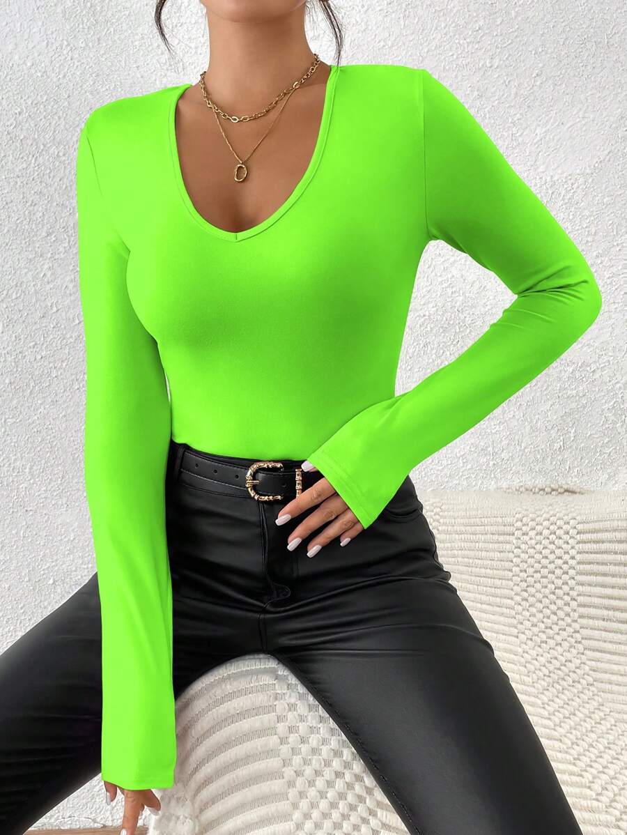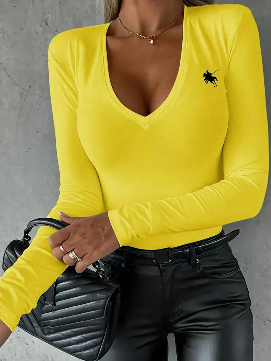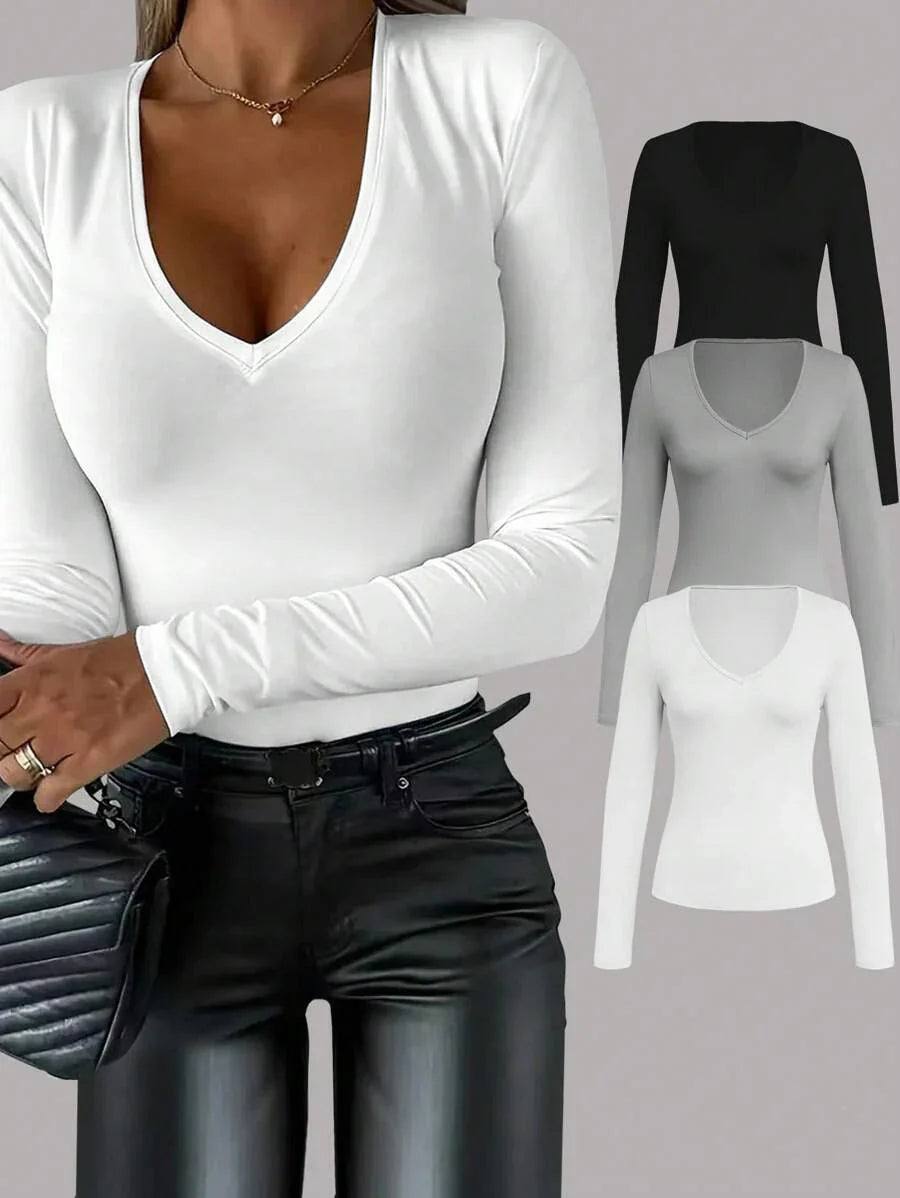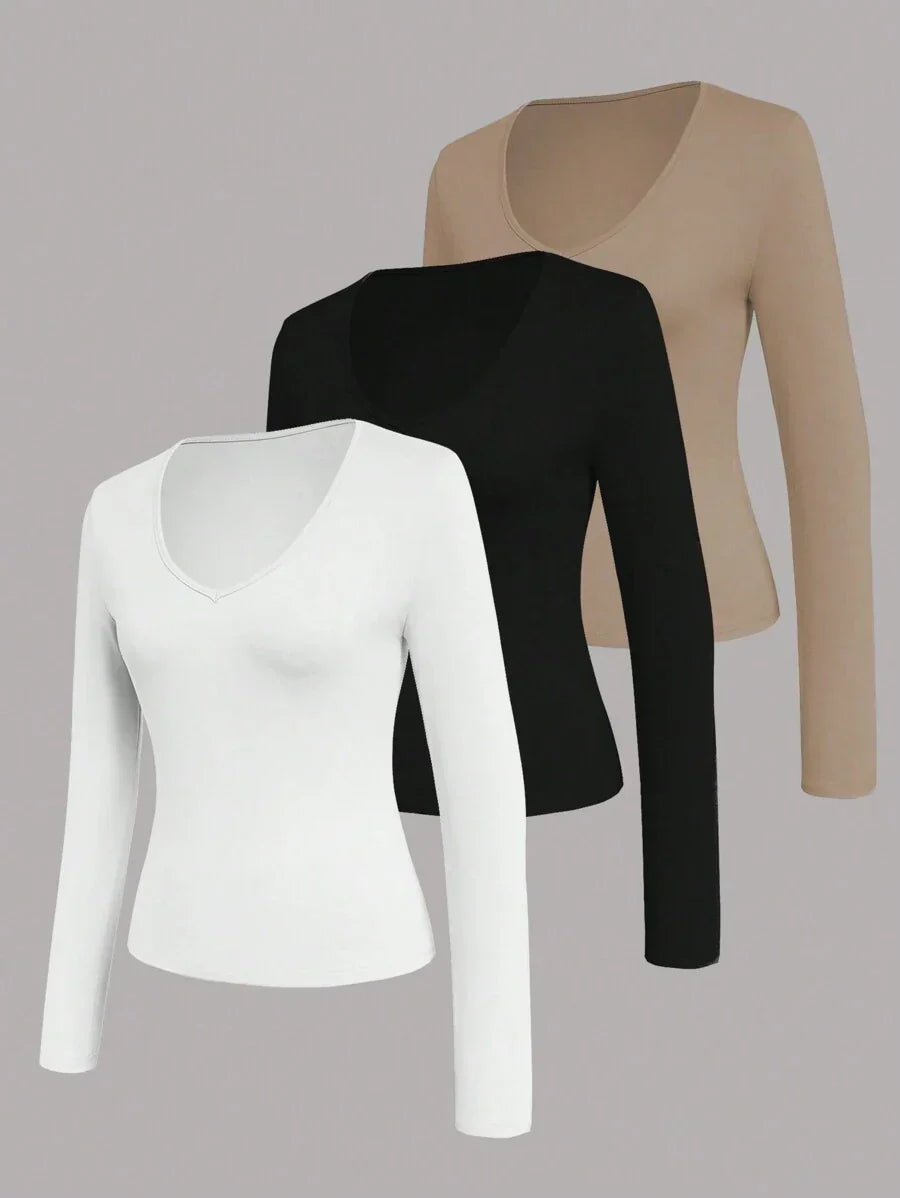 Maglietta a maniche lunghe con scollo a V, colore tinta unita, casual