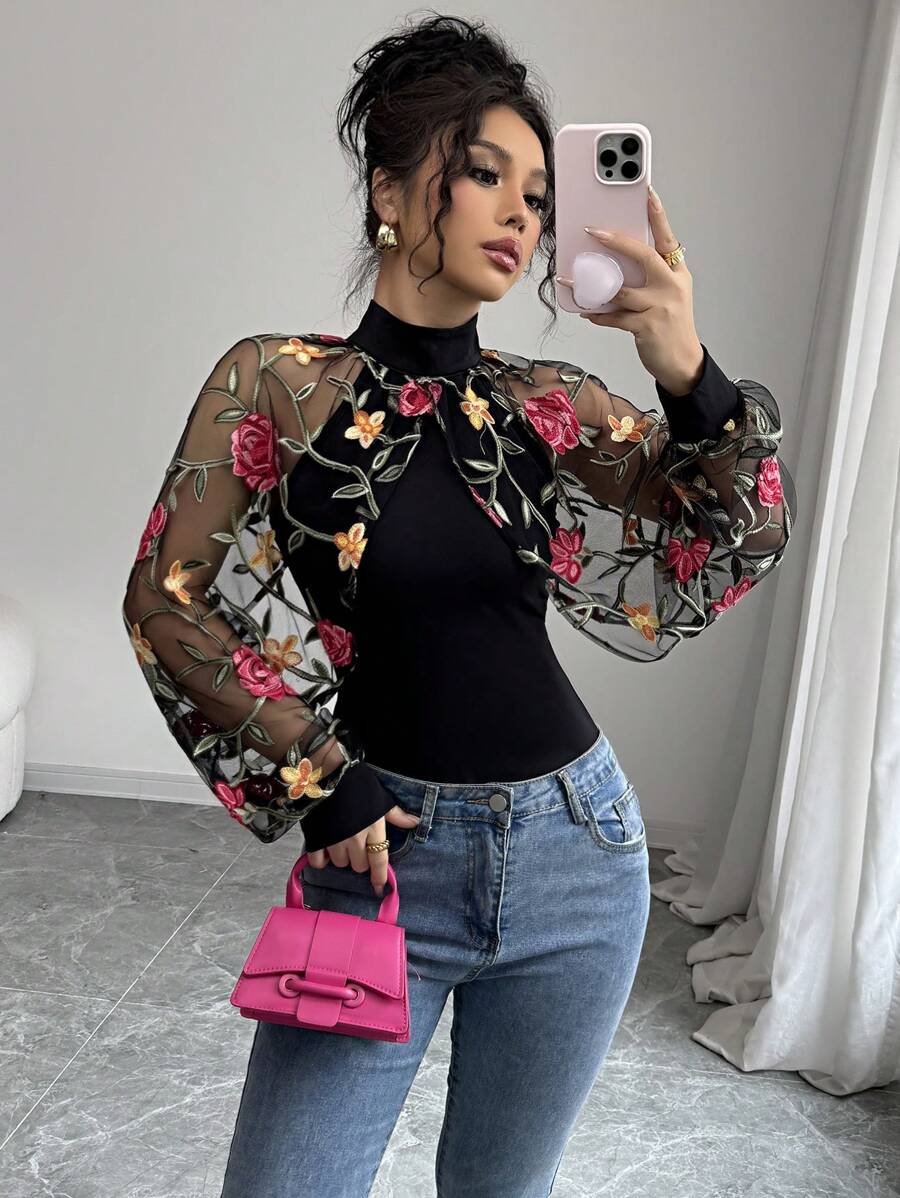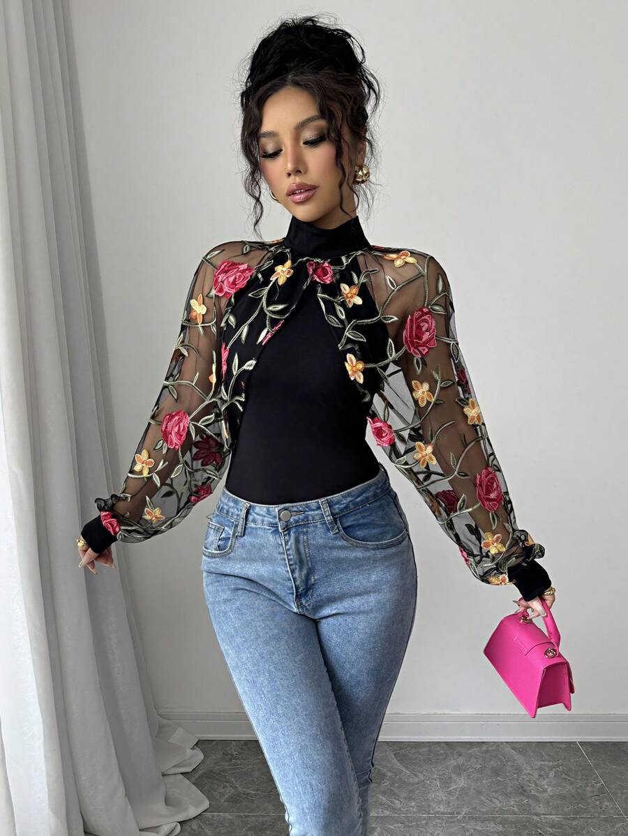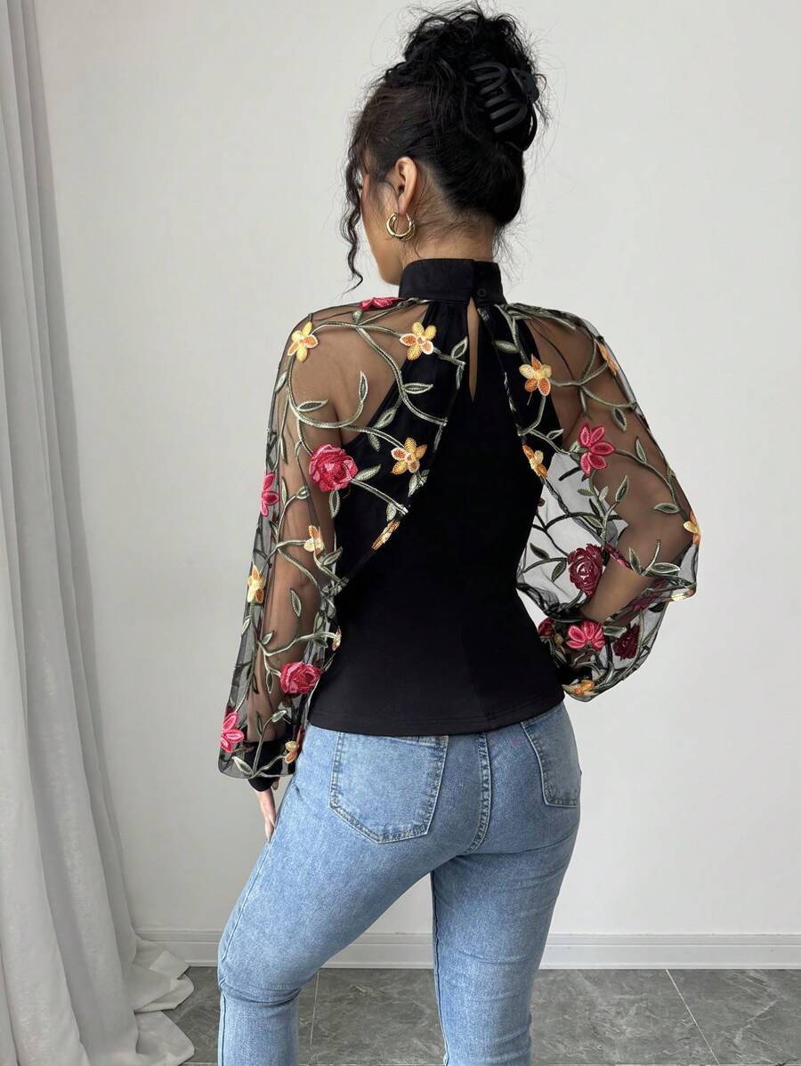 Maglietta da donna in maglia con contrasti in rete e ricami