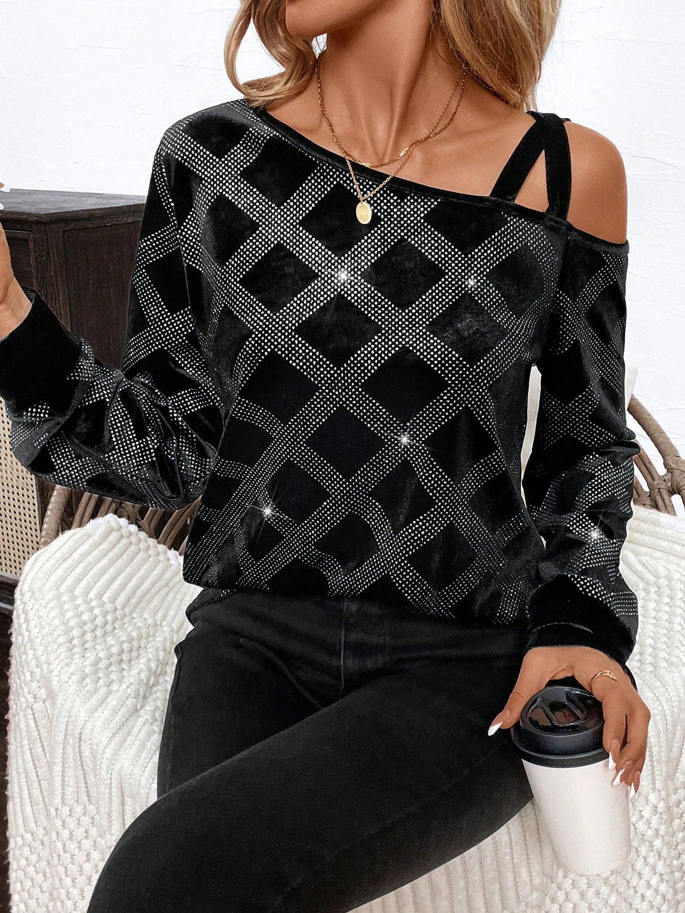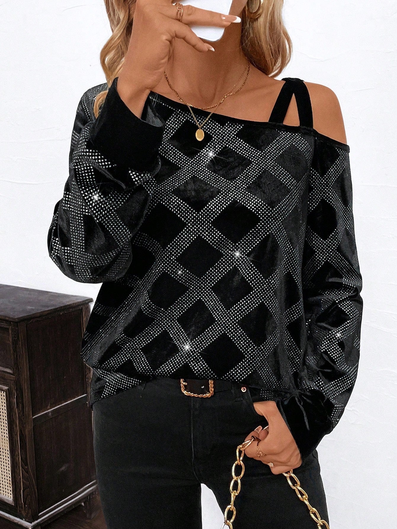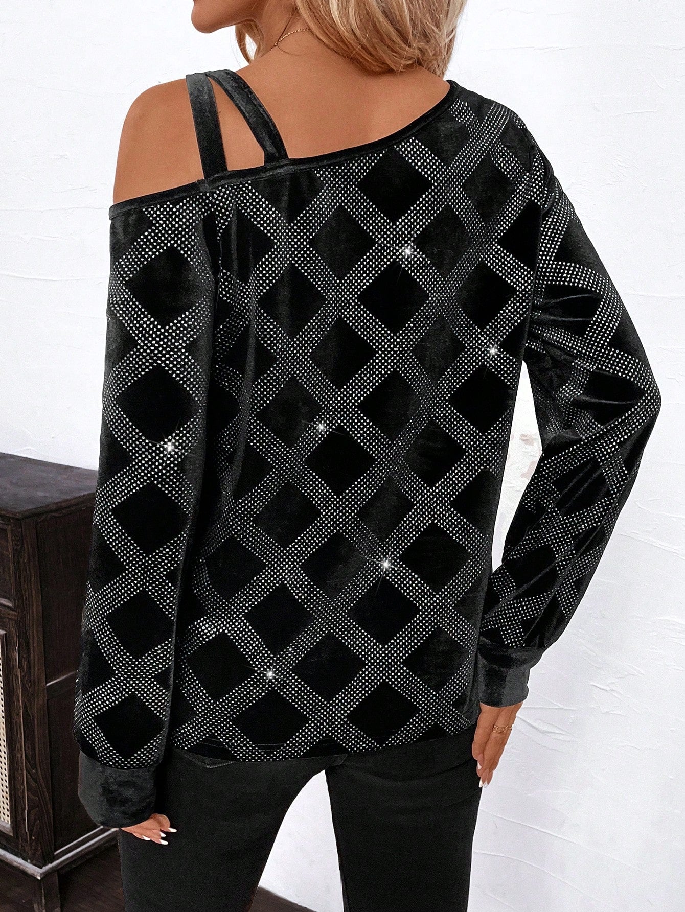 Maglietta di velluto con decorazioni di strass alla moda e versatile