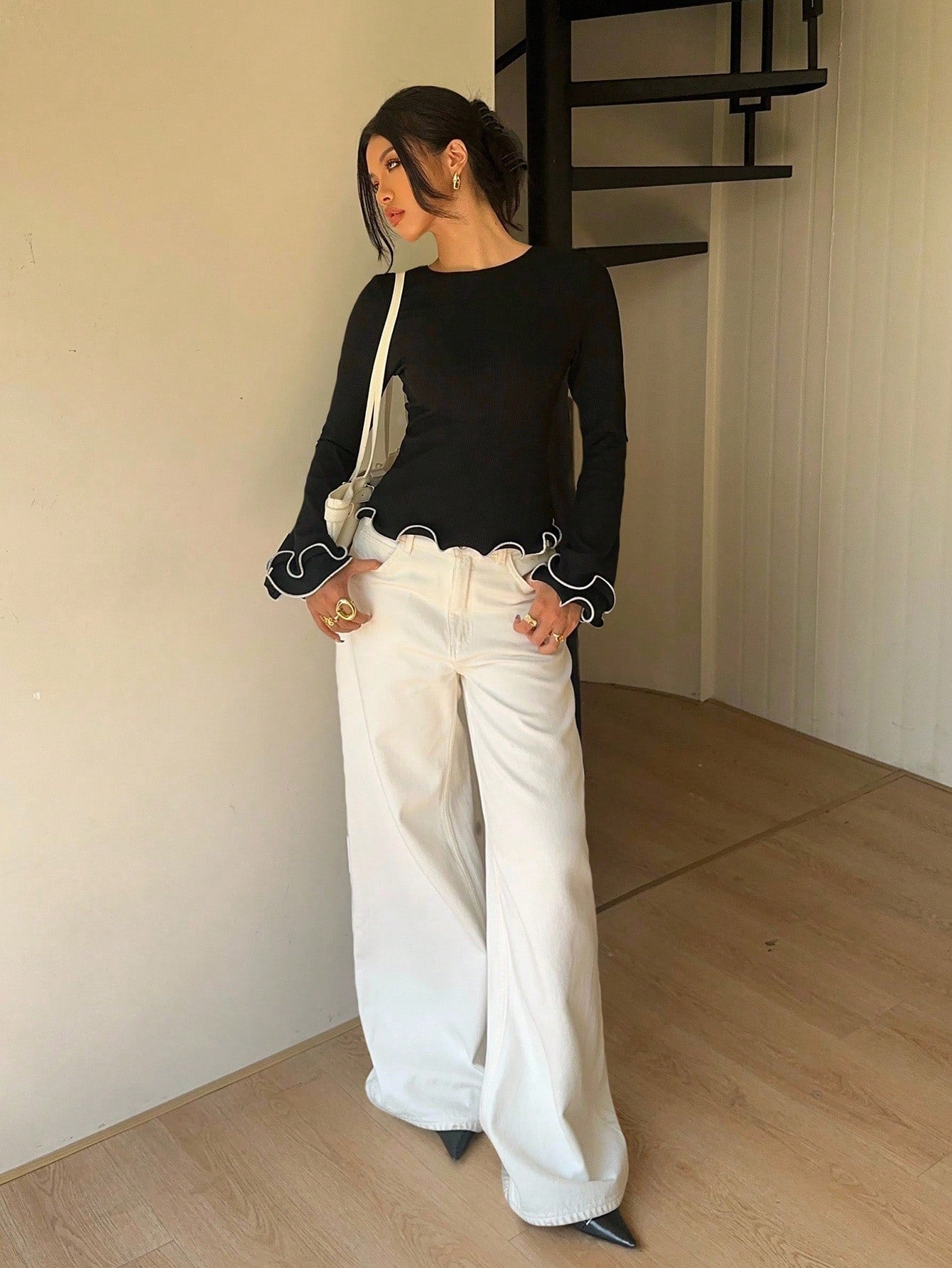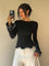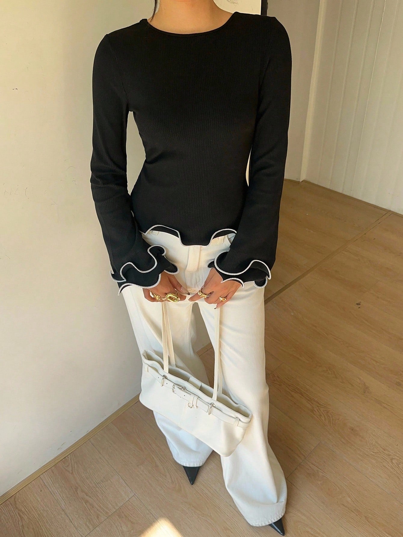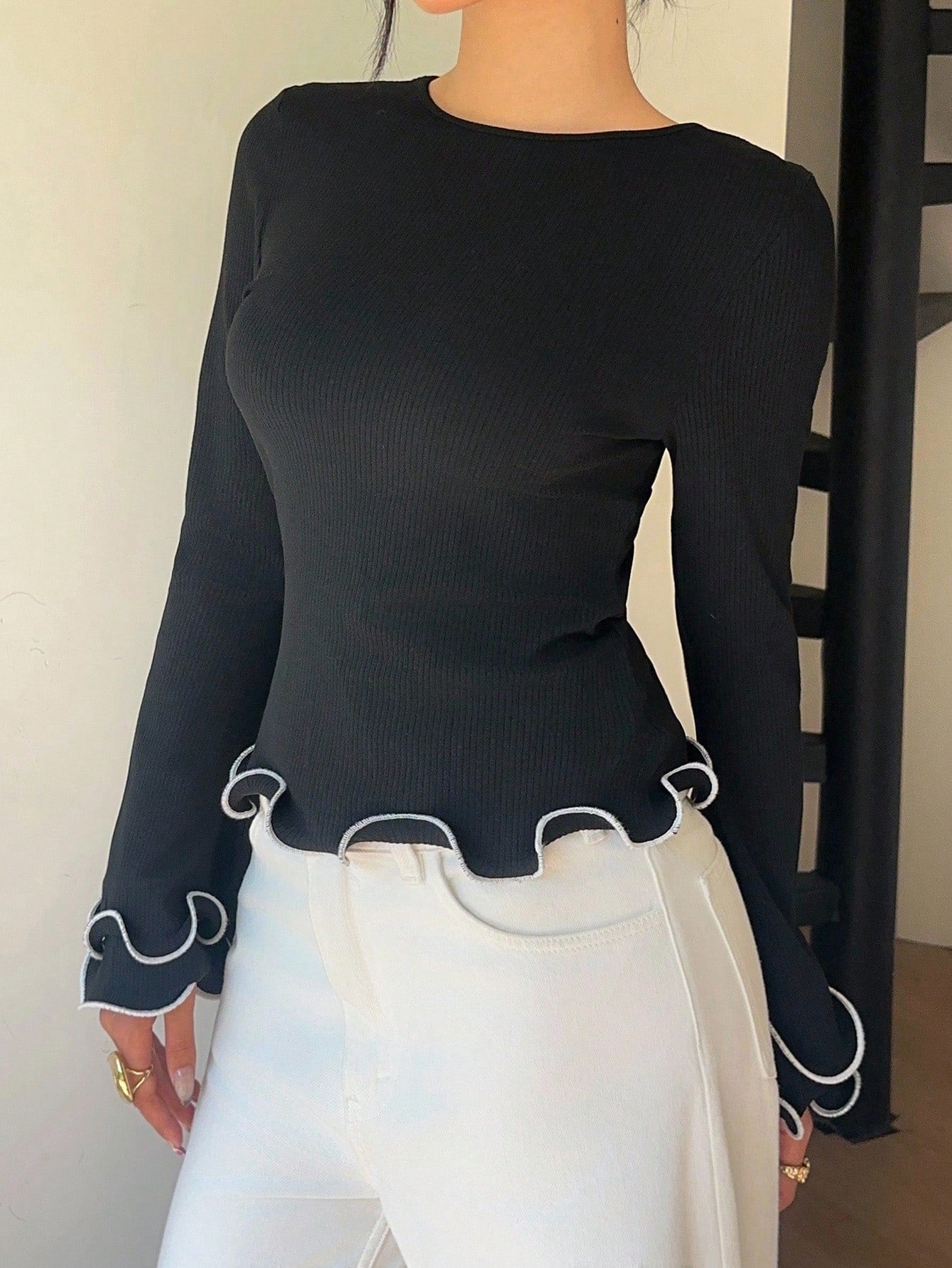 Maglietta elegante da donna con collo rotondo e balza sul fondo