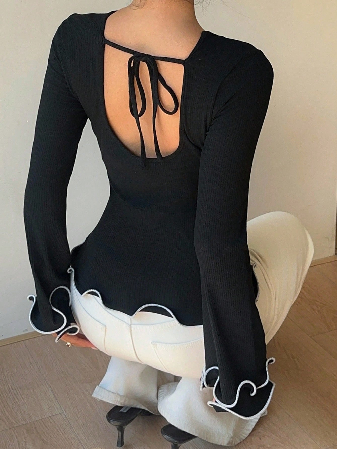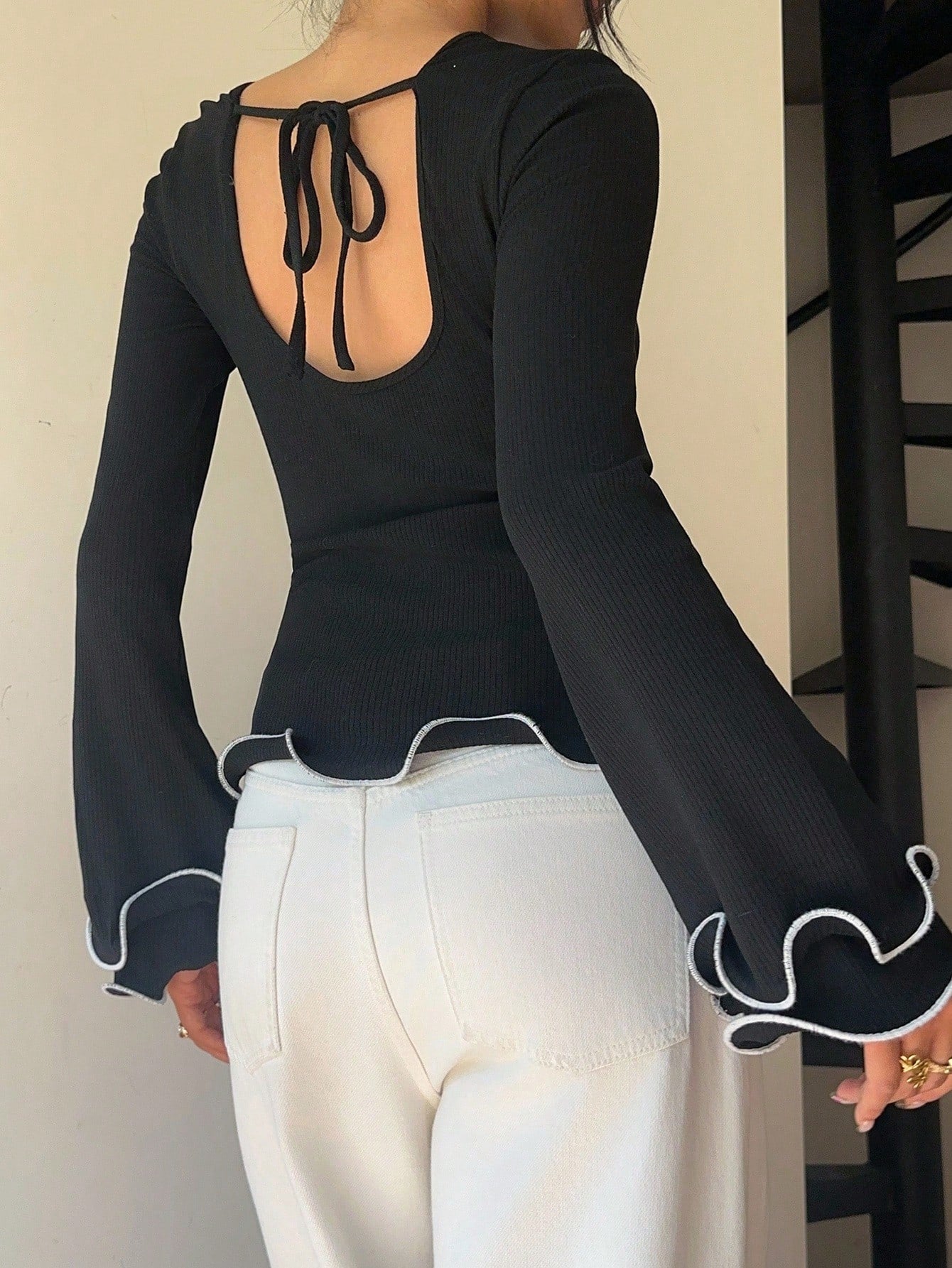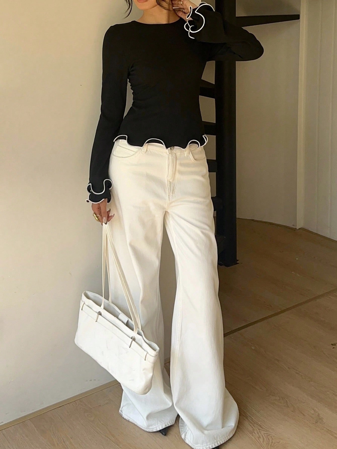 Maglietta elegante da donna con collo rotondo e balza sul fondo