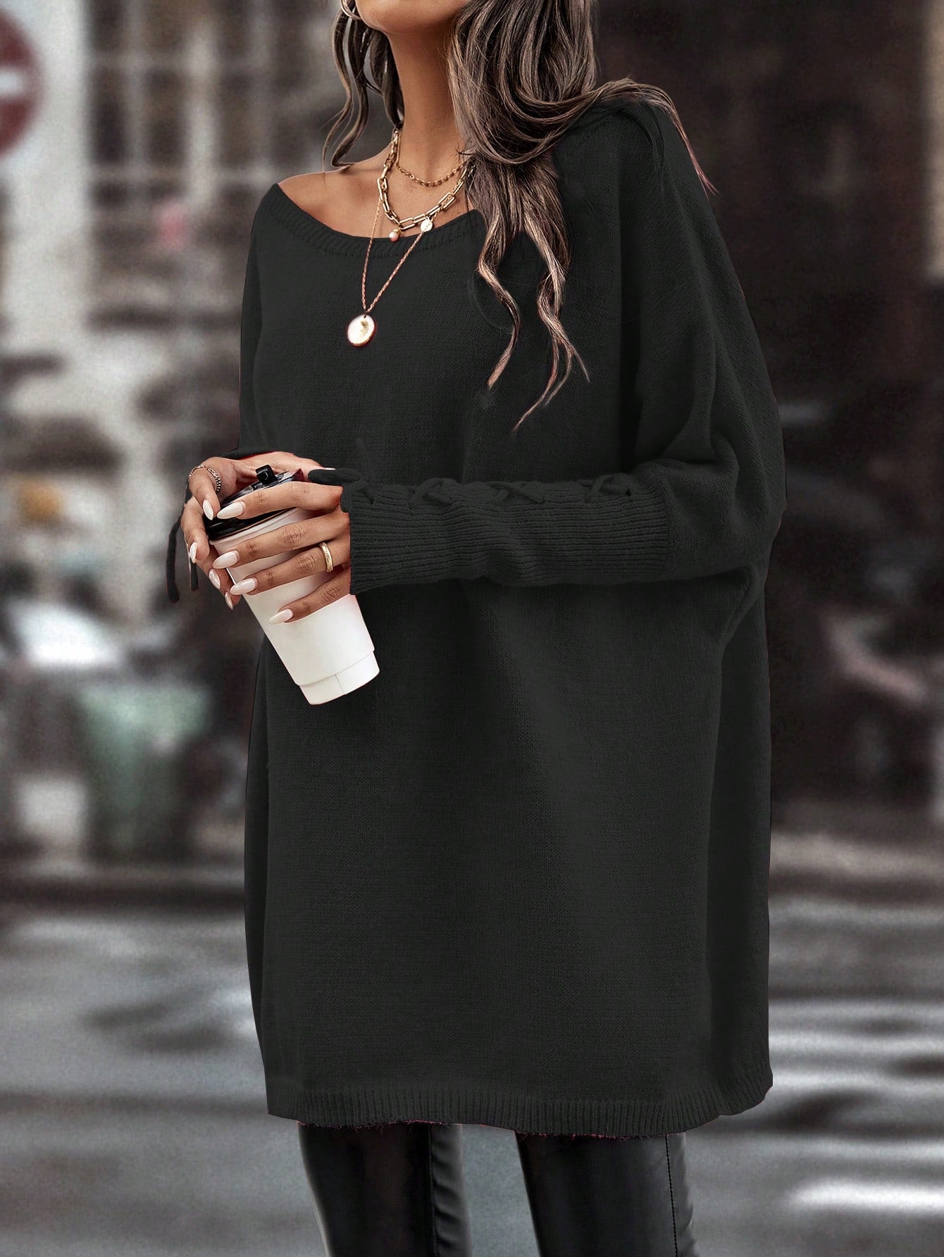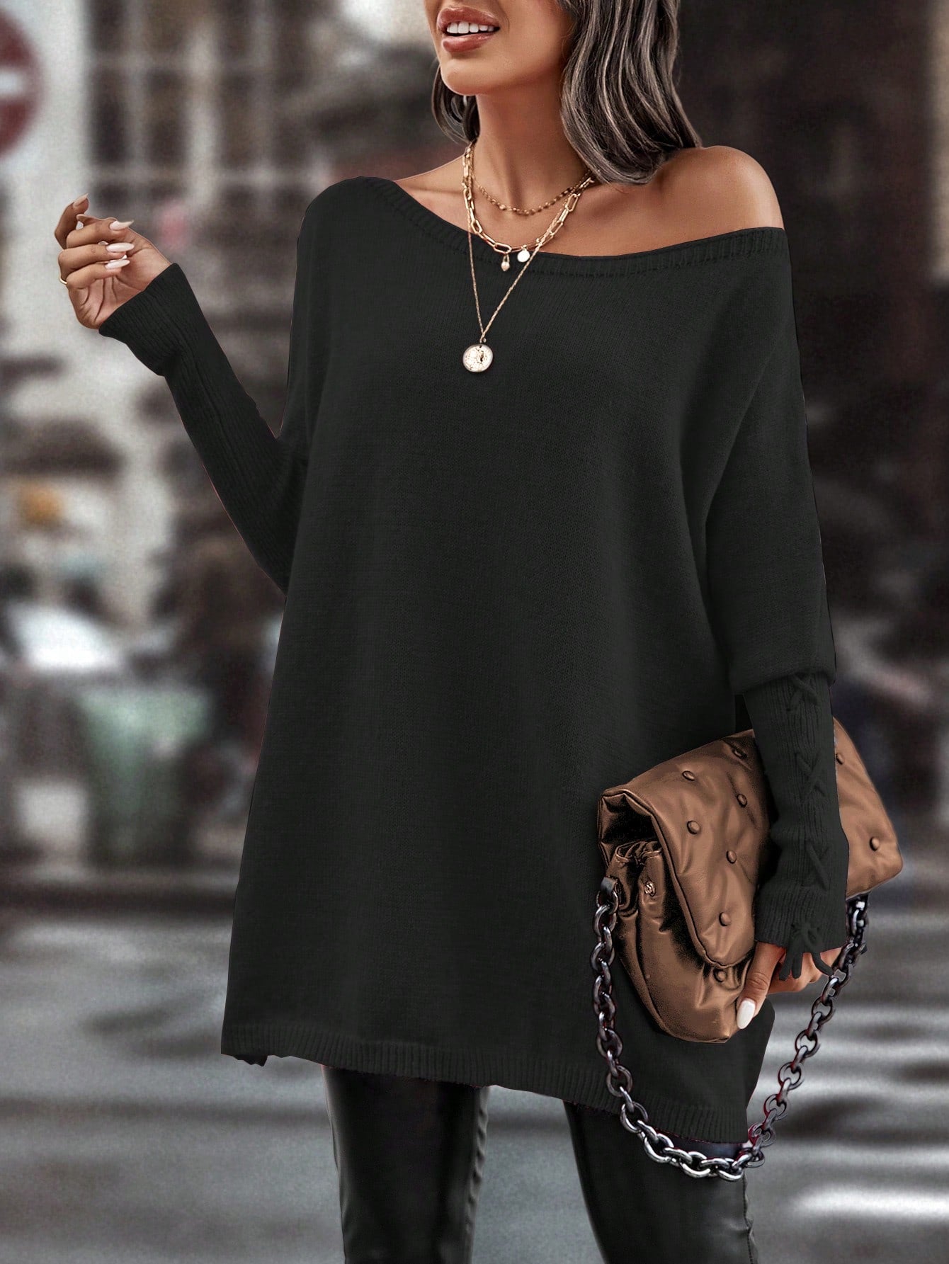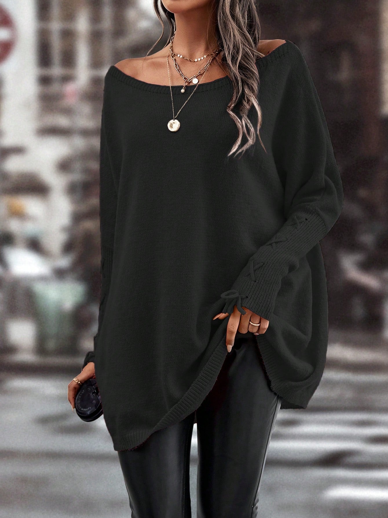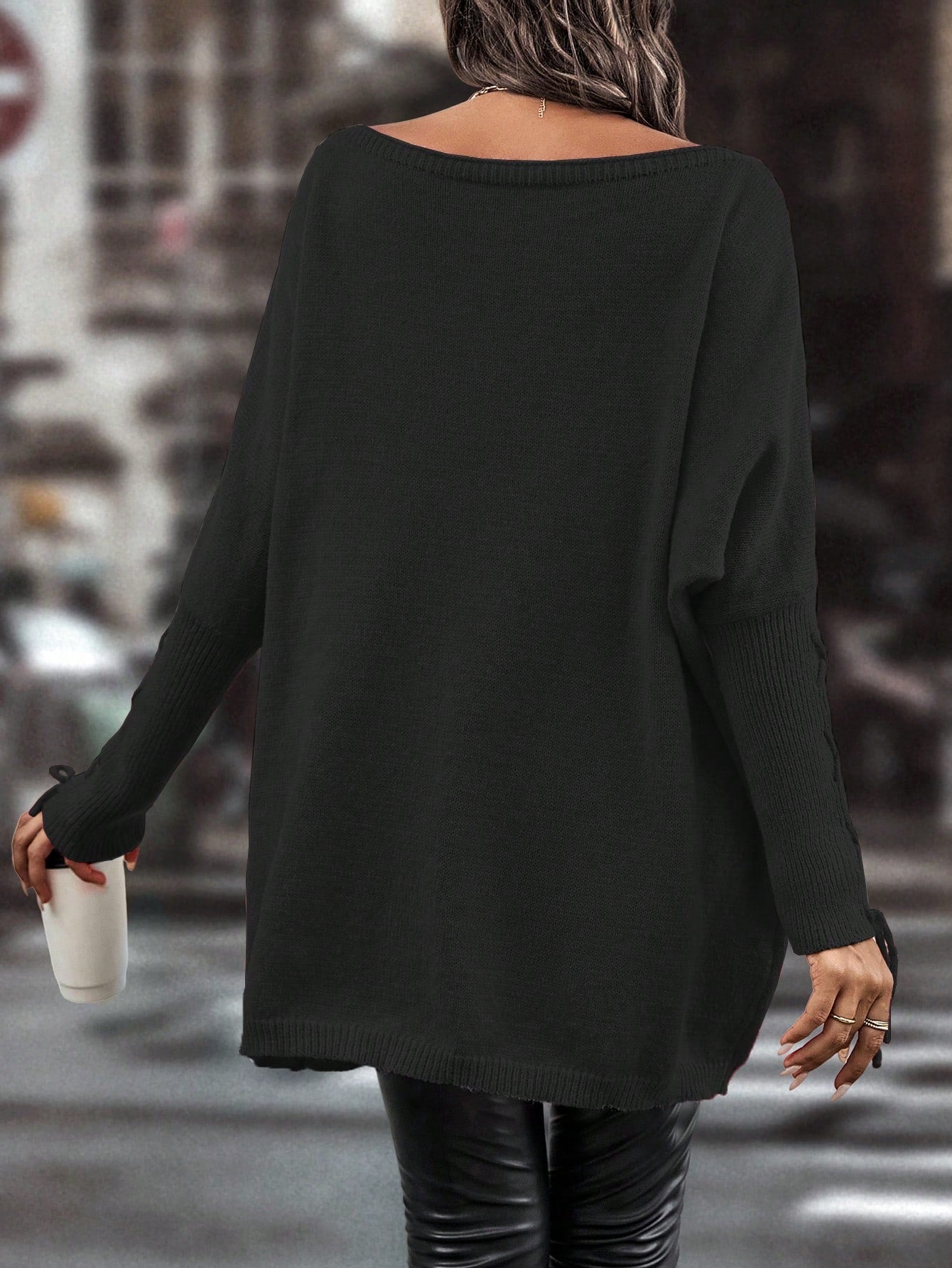 Maglione con scollo a barca, maniche a pipistrello con polsini allacciati, senza cintura, top a maniche lunghe