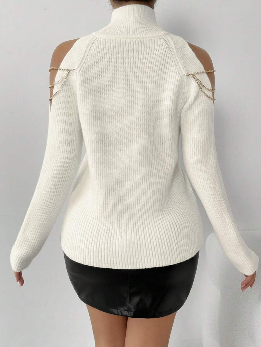 Maglione in stile casual con colletto dritto, spalle scoperte e decorazione con catene