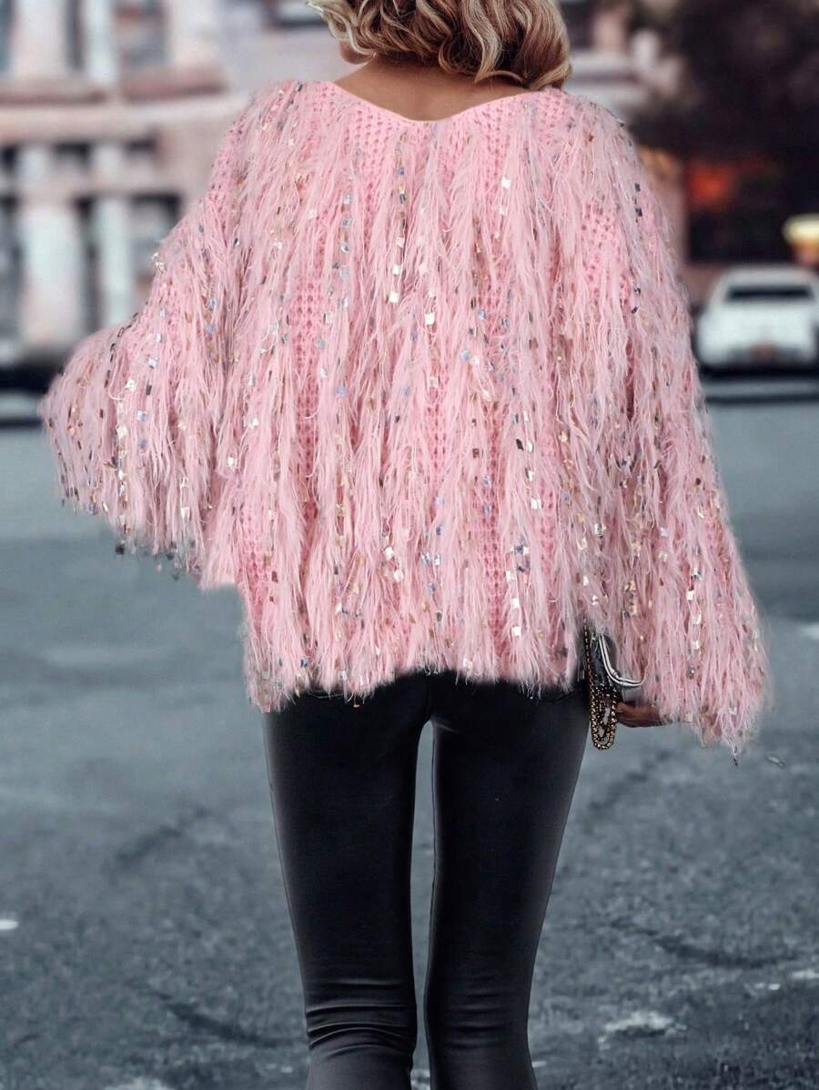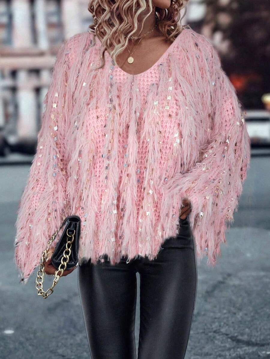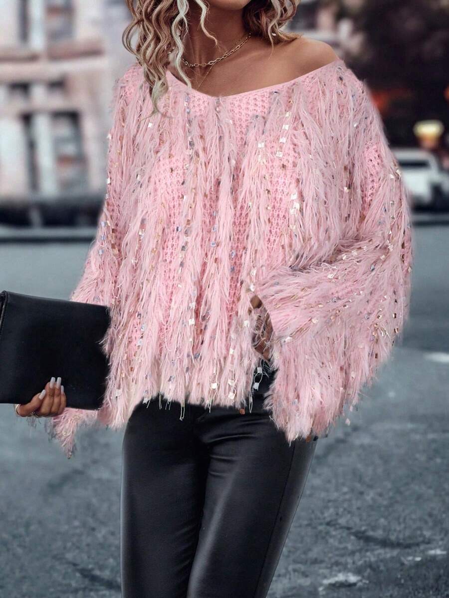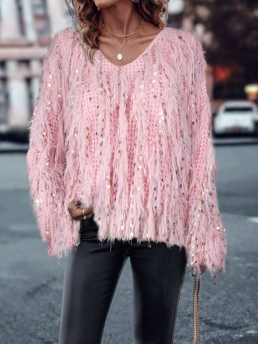 Pullover da donna con scollo a V, maniche lunghe, decorazione con paillettes, casual per uso quotidiano