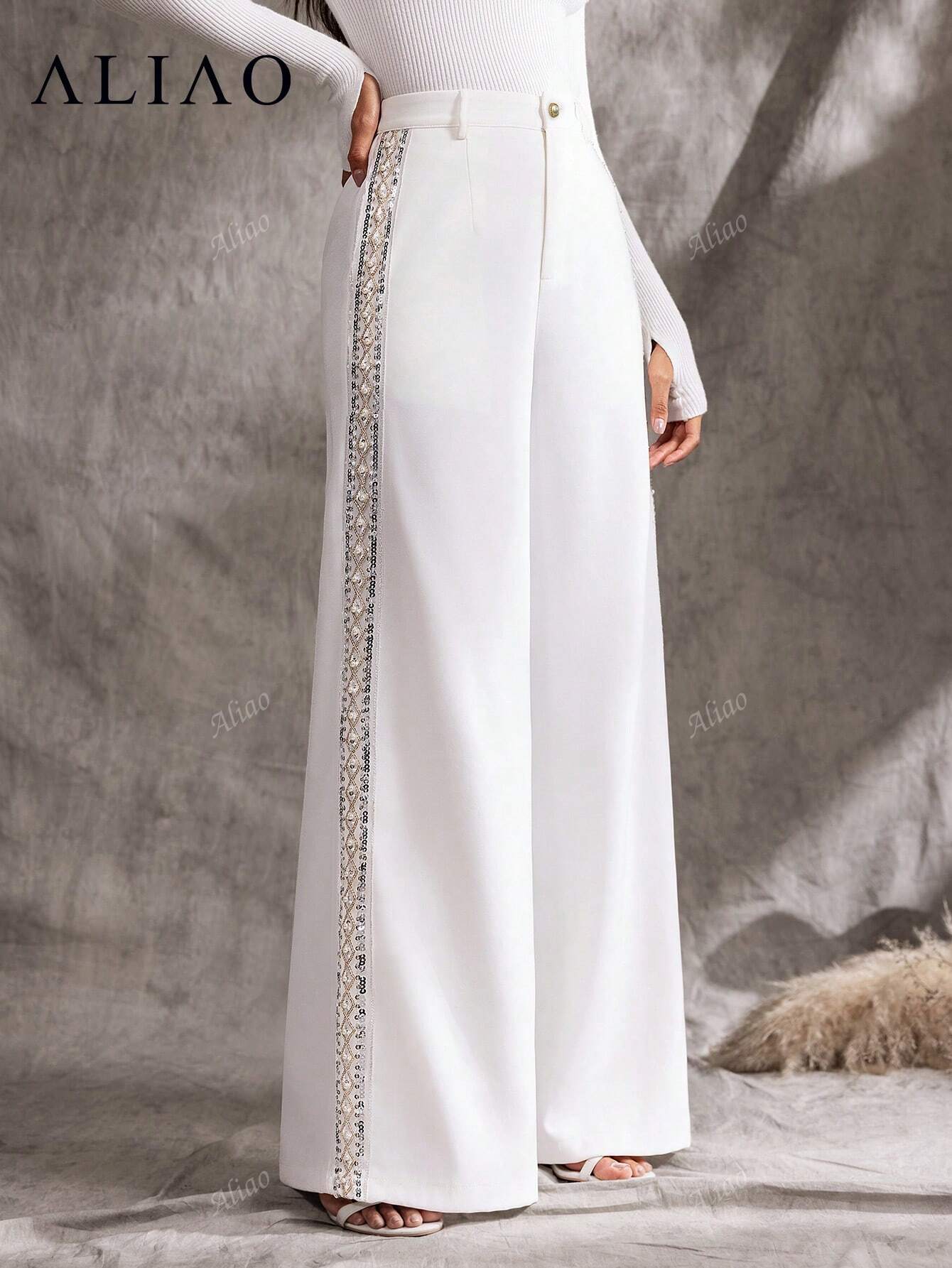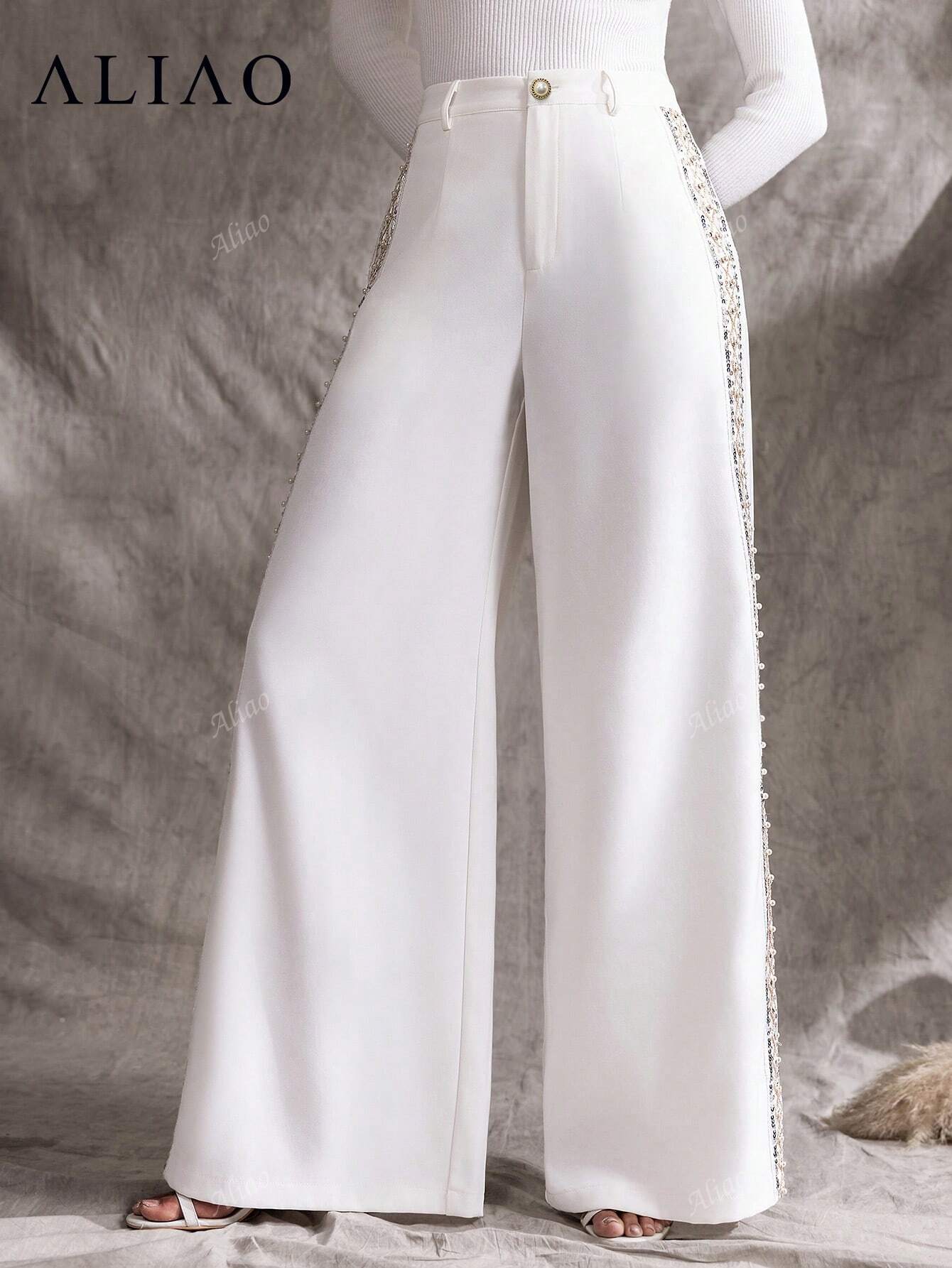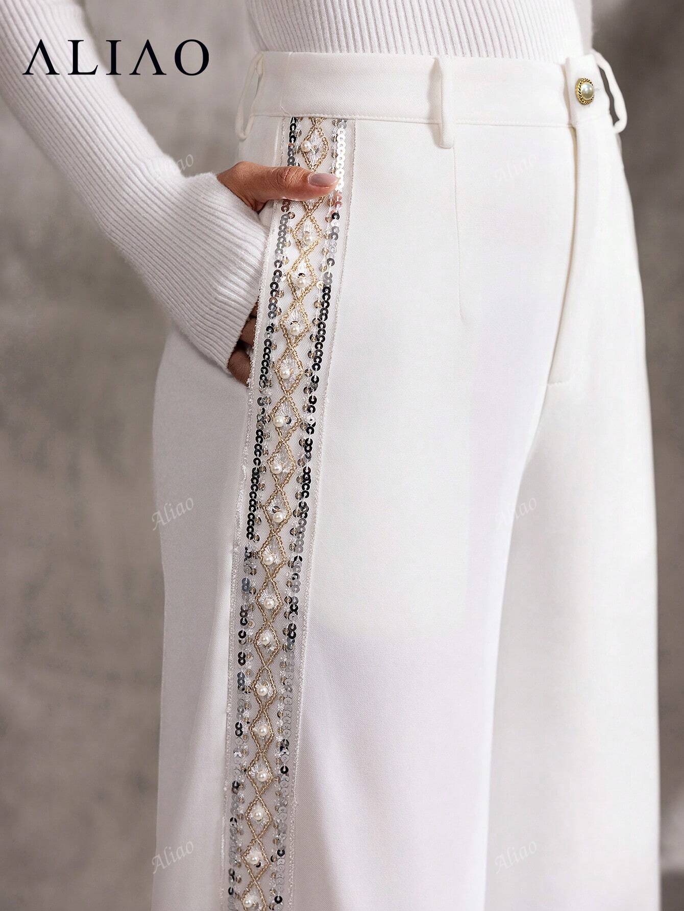 Pantaloni dritti di alta gamma con paillettes laterali e ricami