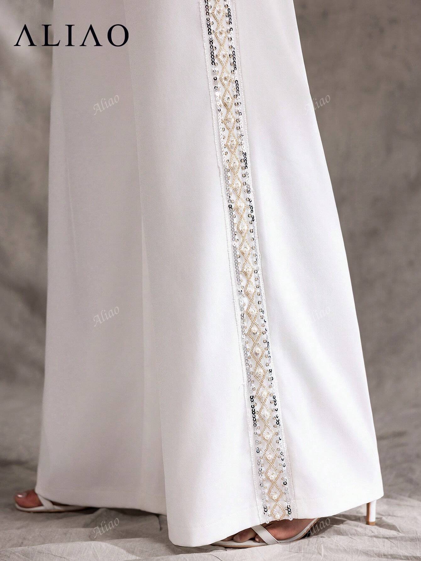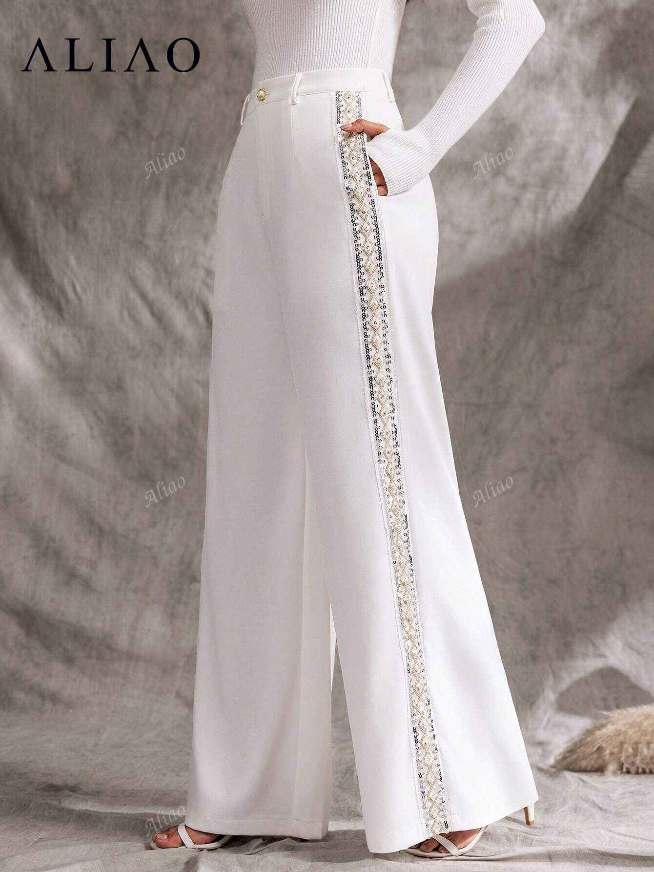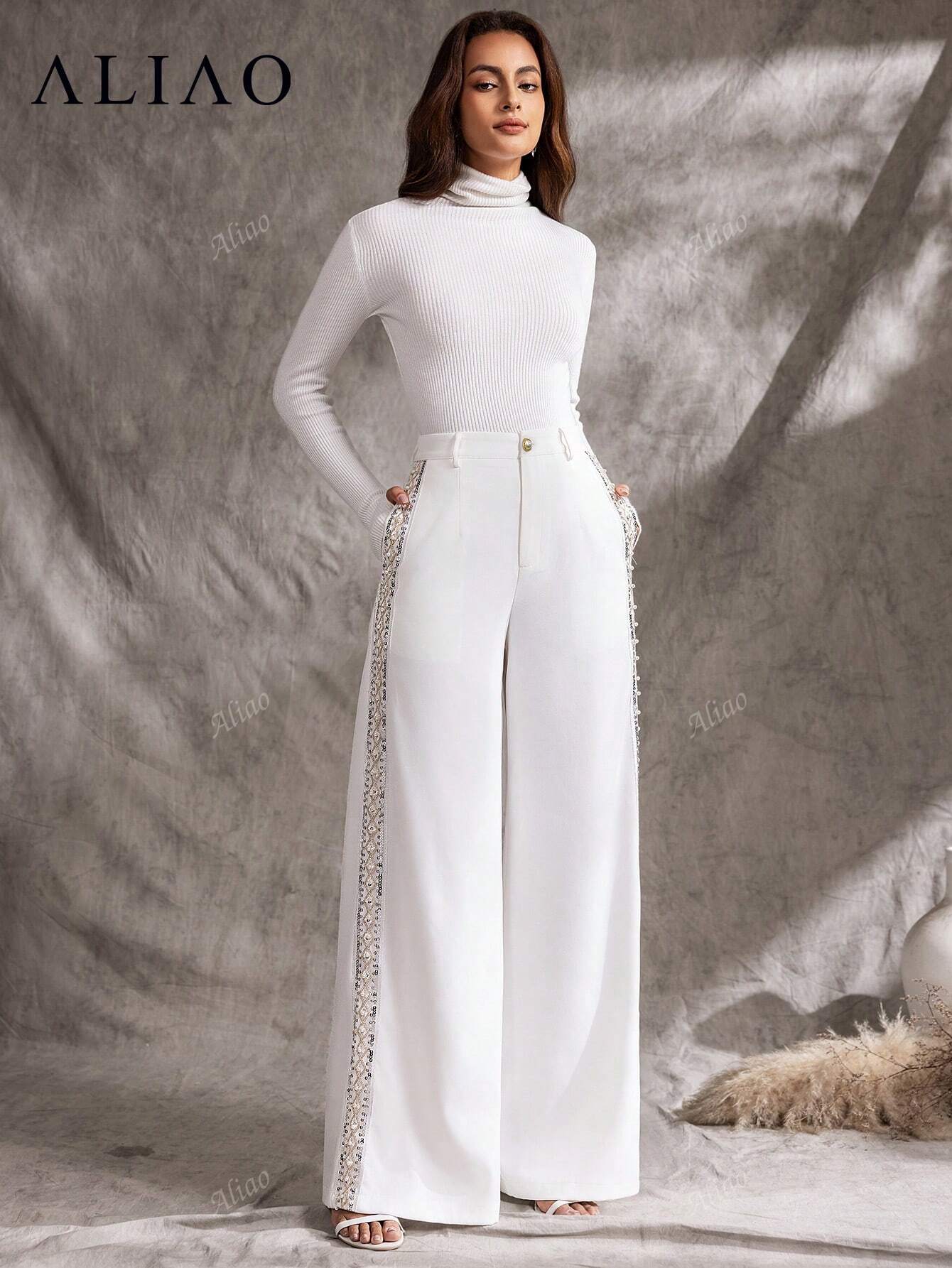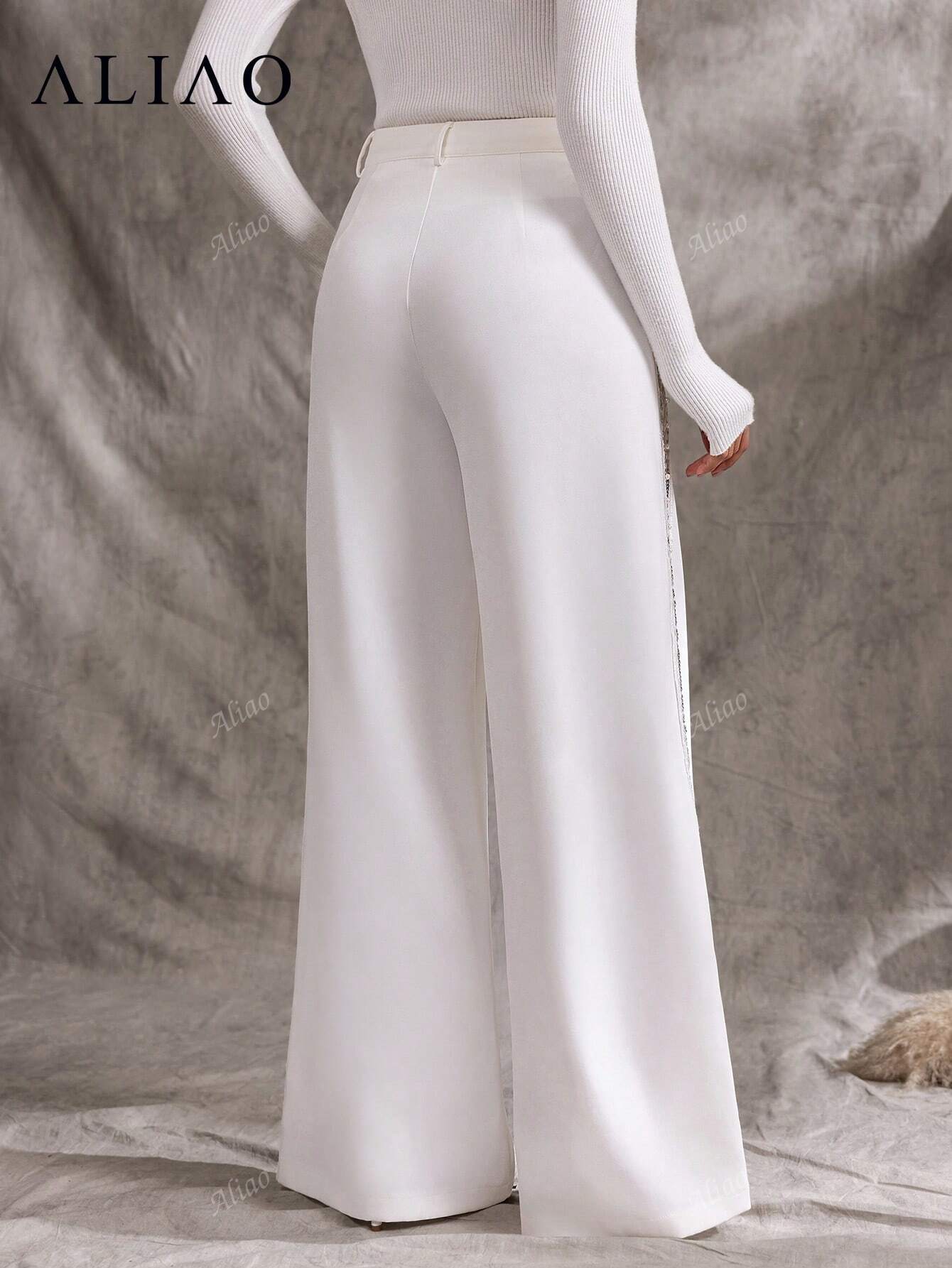 Pantaloni dritti di alta gamma con paillettes laterali e ricami