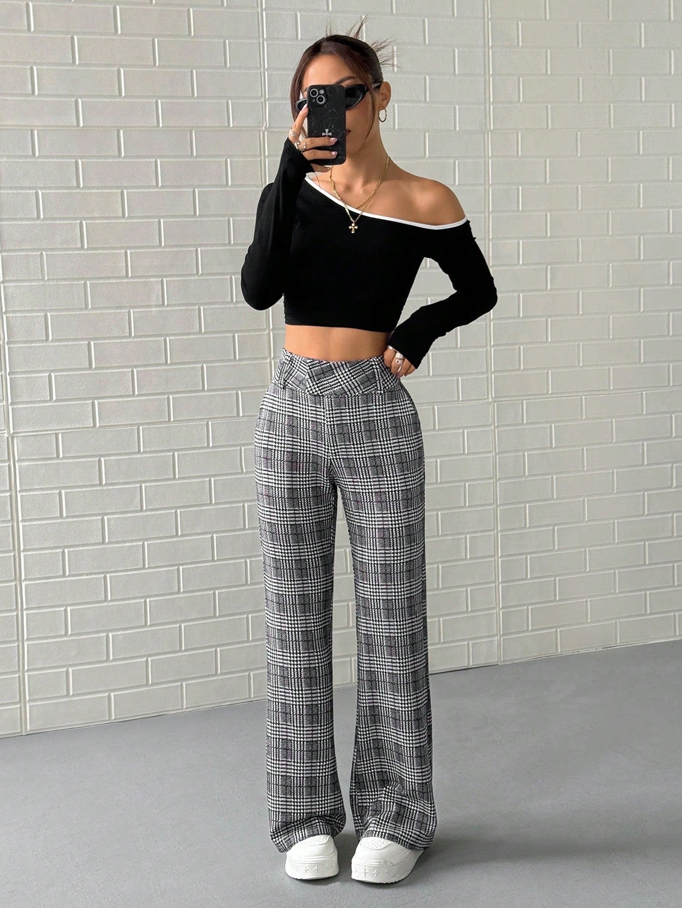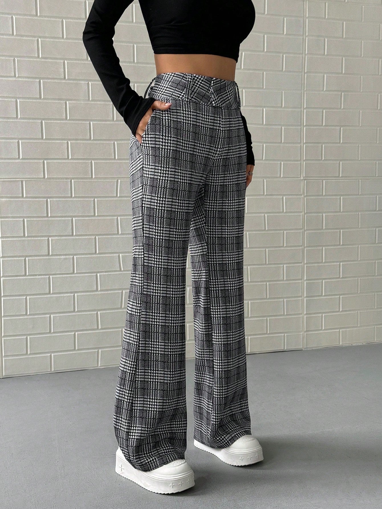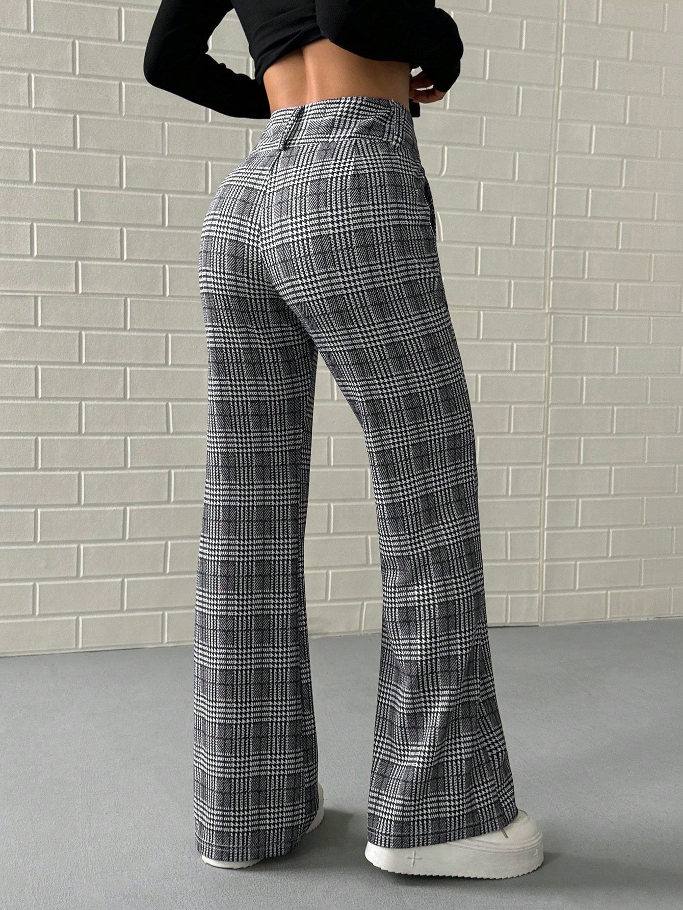 Pantaloni lunghi a vita bassa a quadri da donna