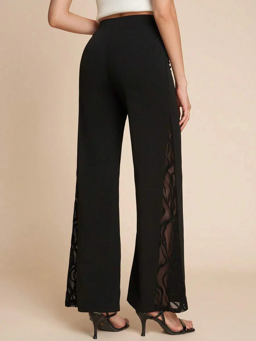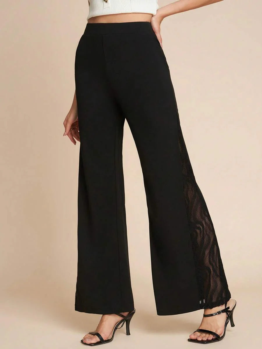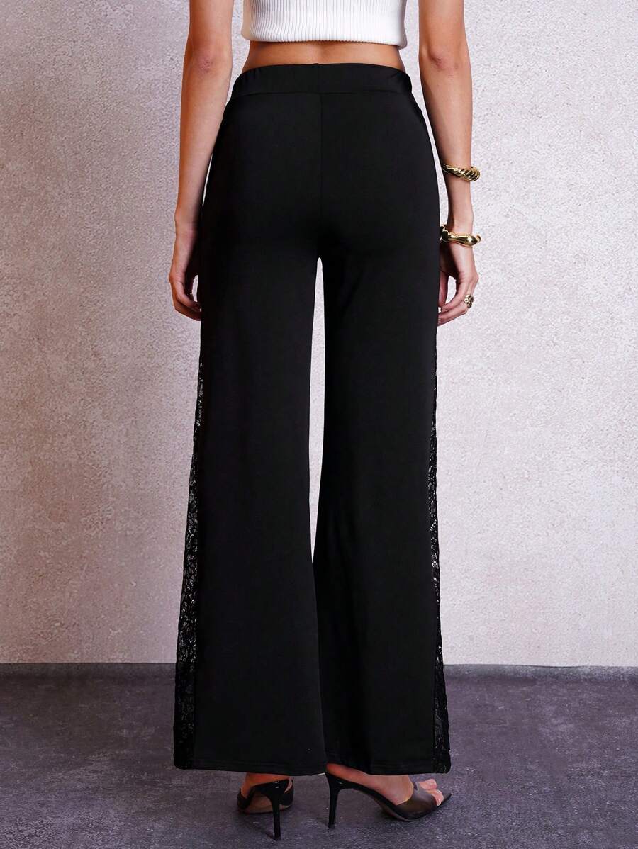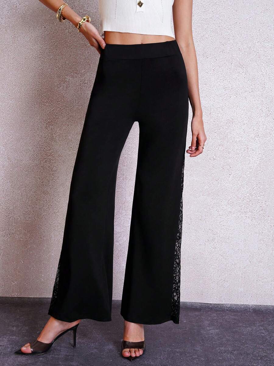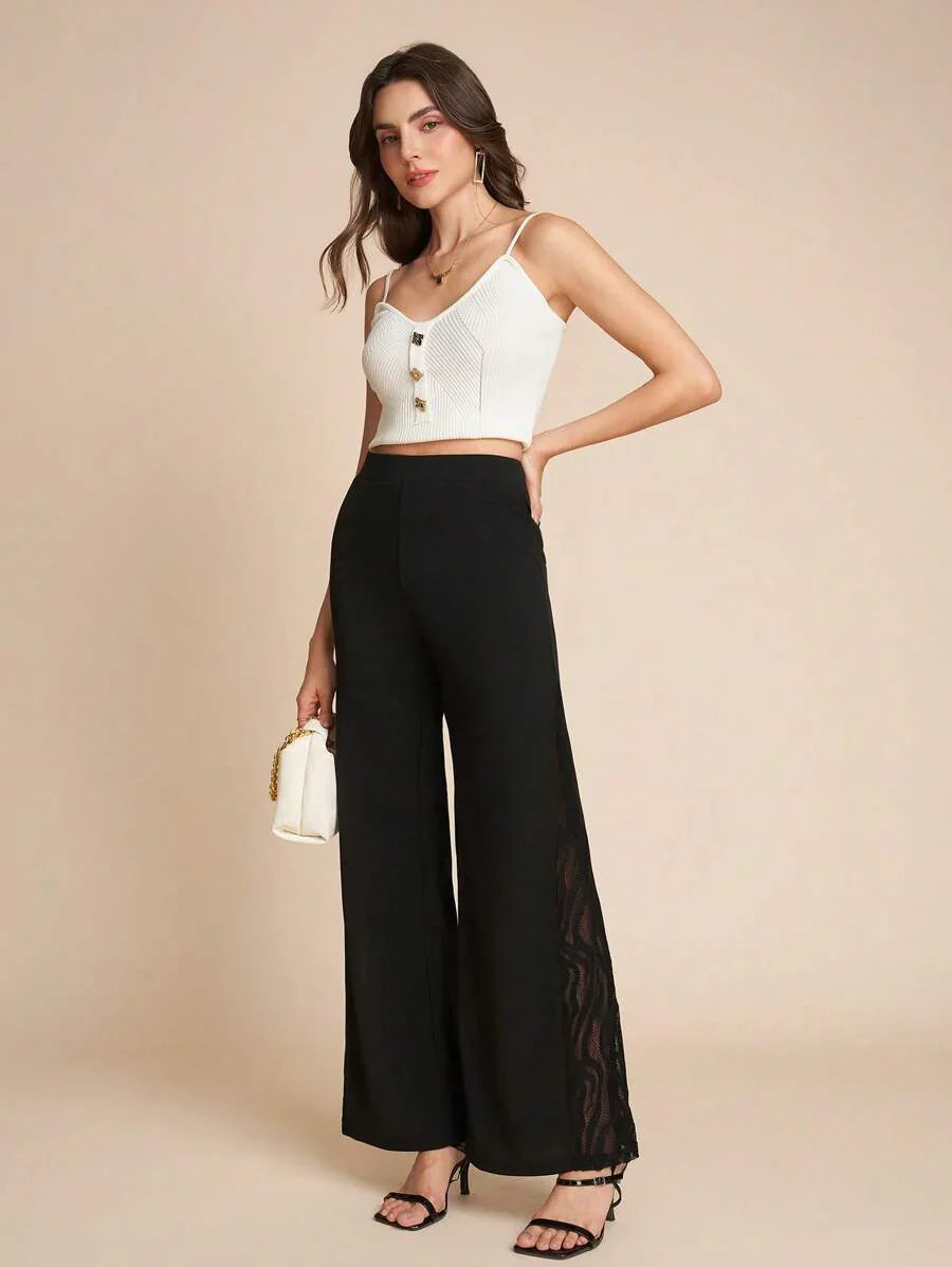 Pantaloni neri a vita larga da donna in maglia stretch con inserti in pizzo geometrico