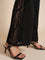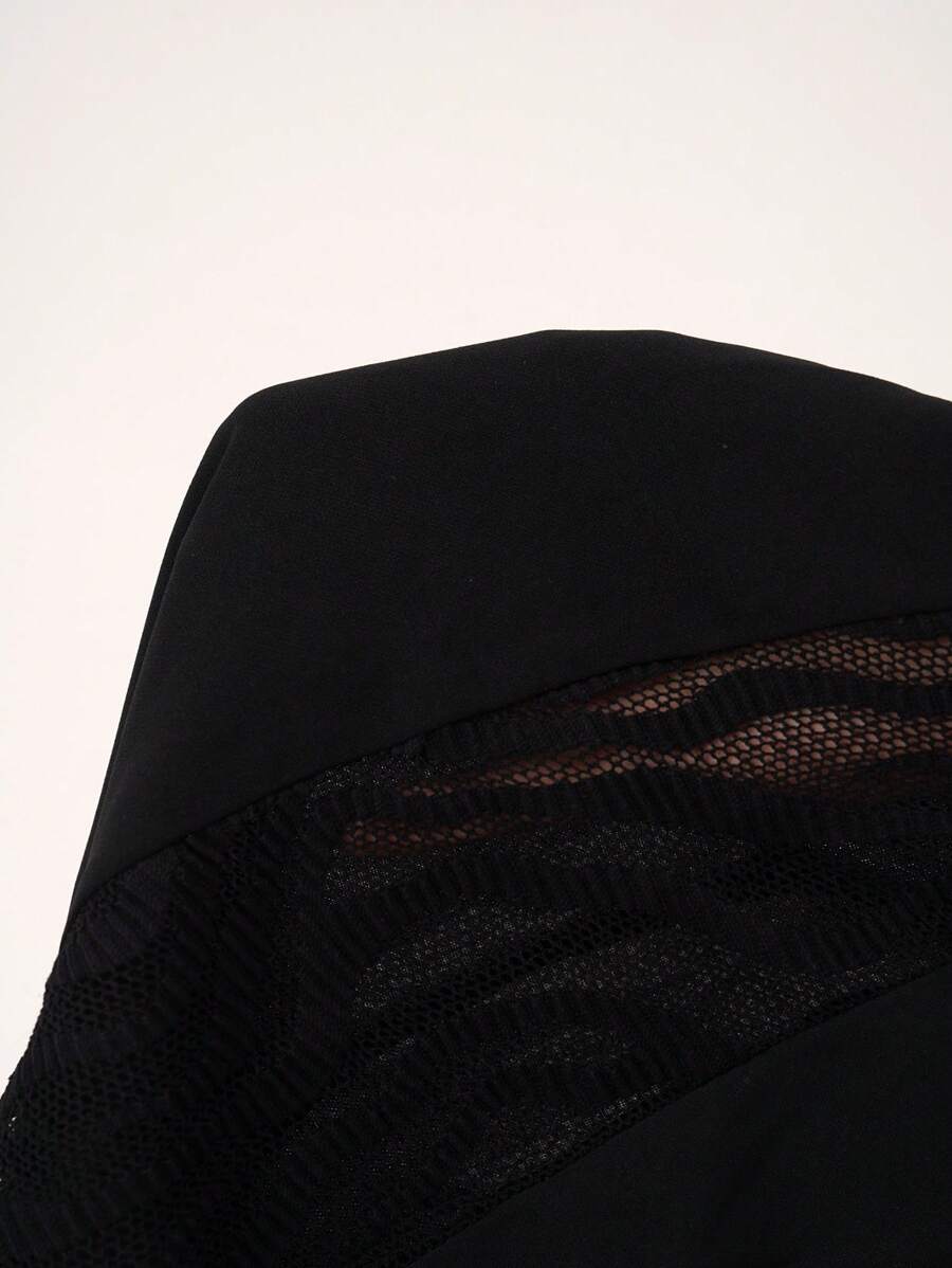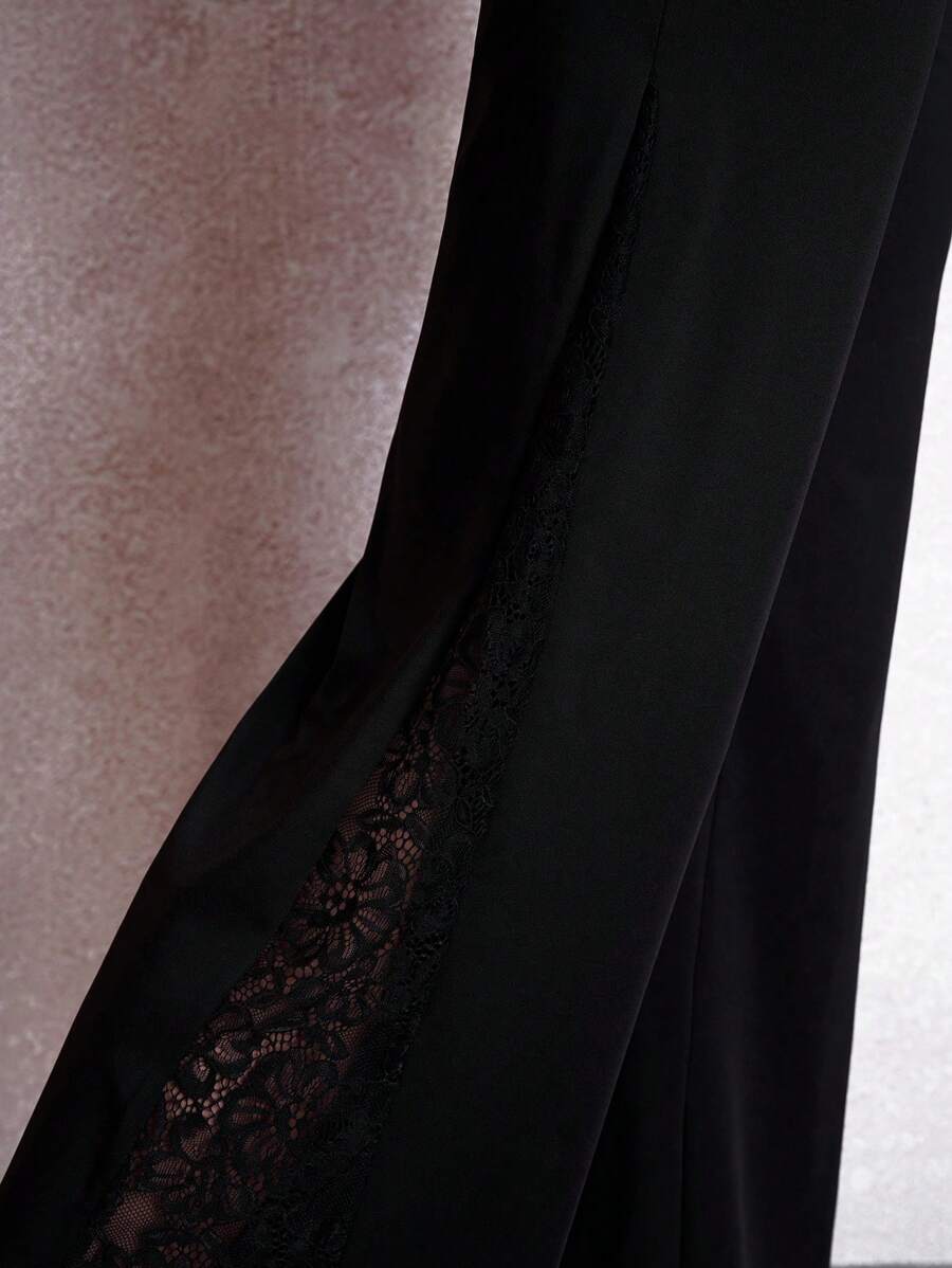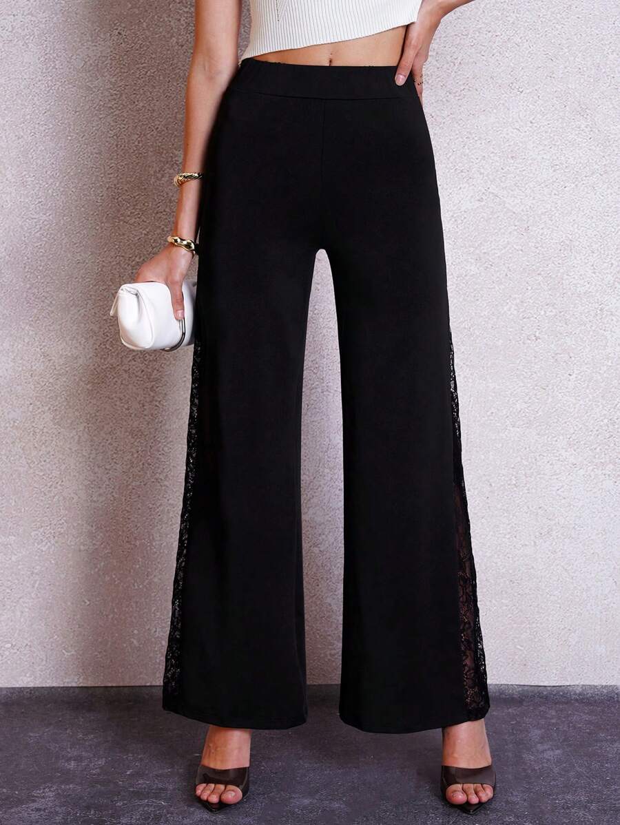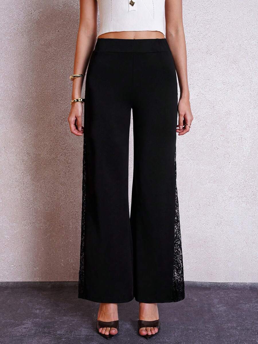 Pantaloni neri a vita larga da donna in maglia stretch con inserti in pizzo geometrico