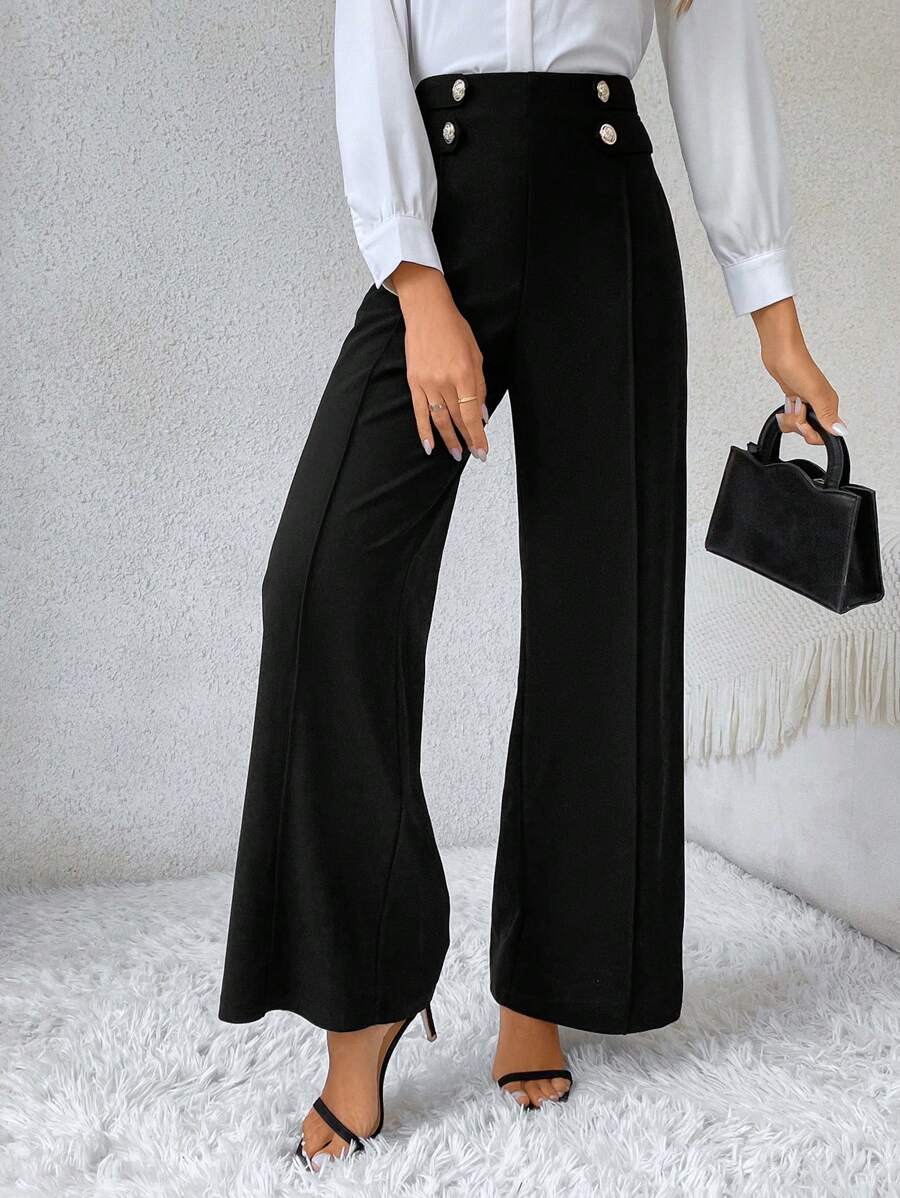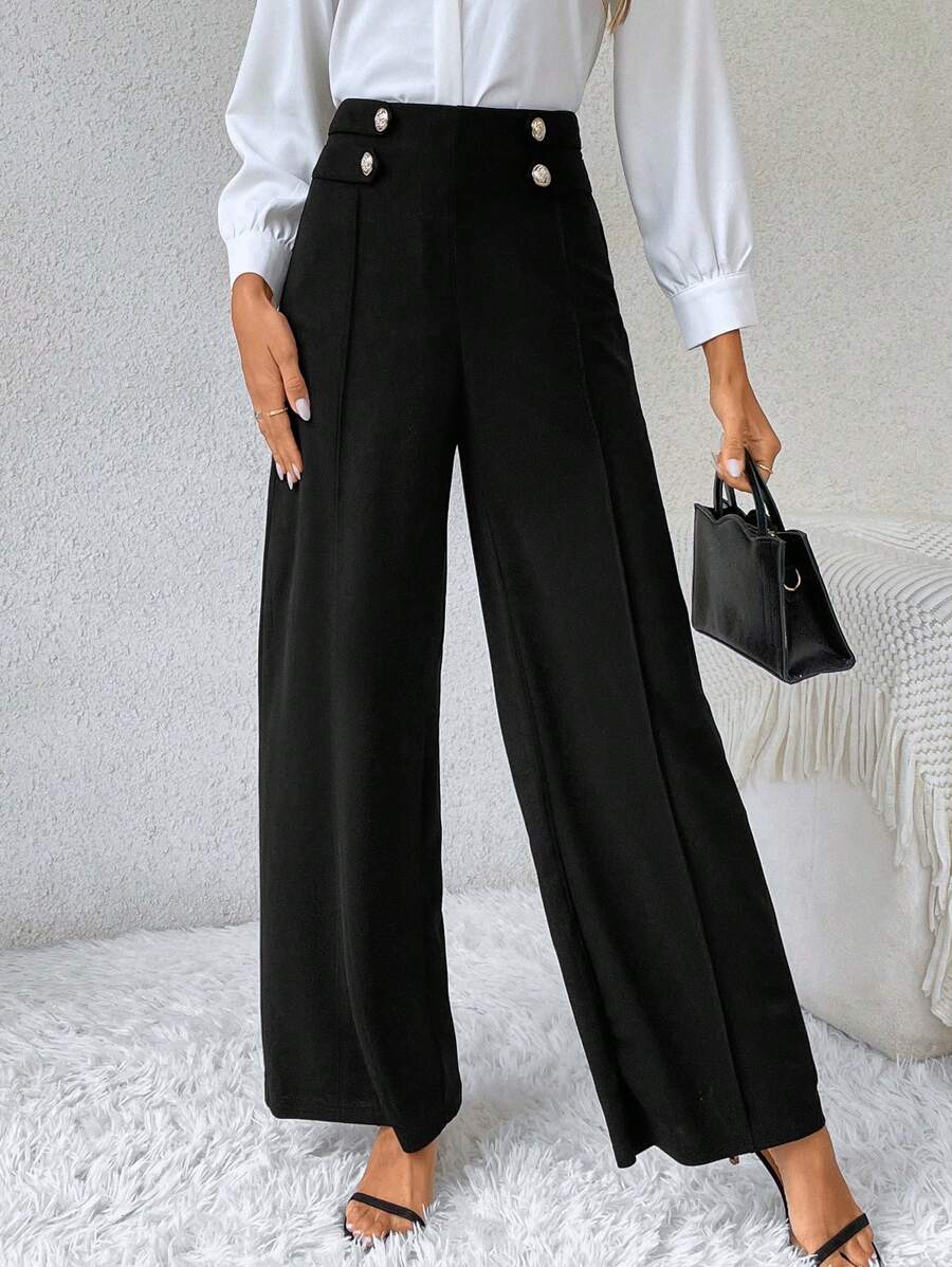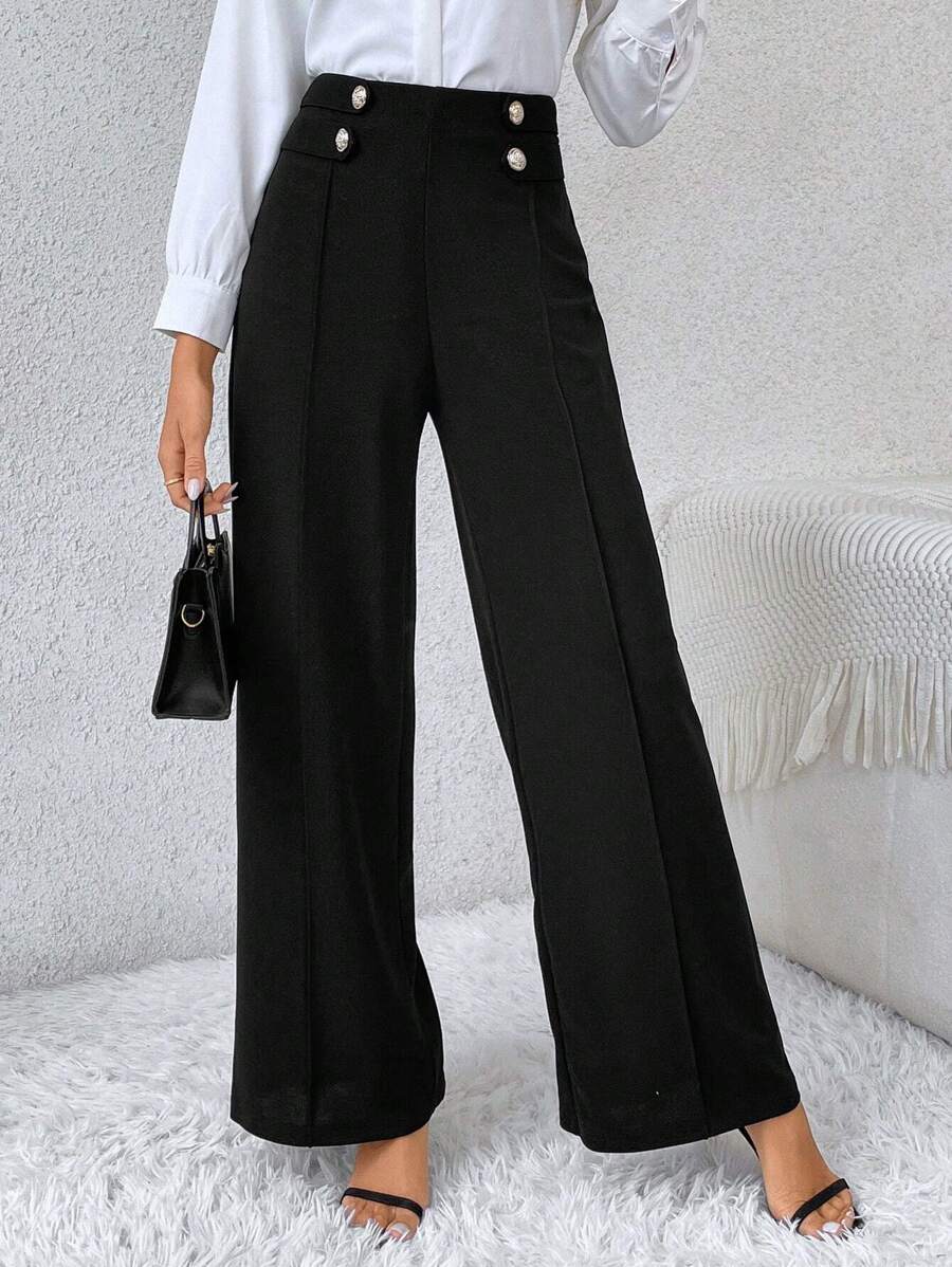 Pantaloni neri eleganti, a vita alta, con dettagli a bottoni e gamba ampia