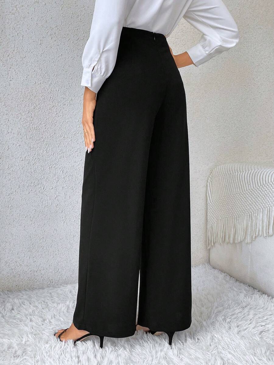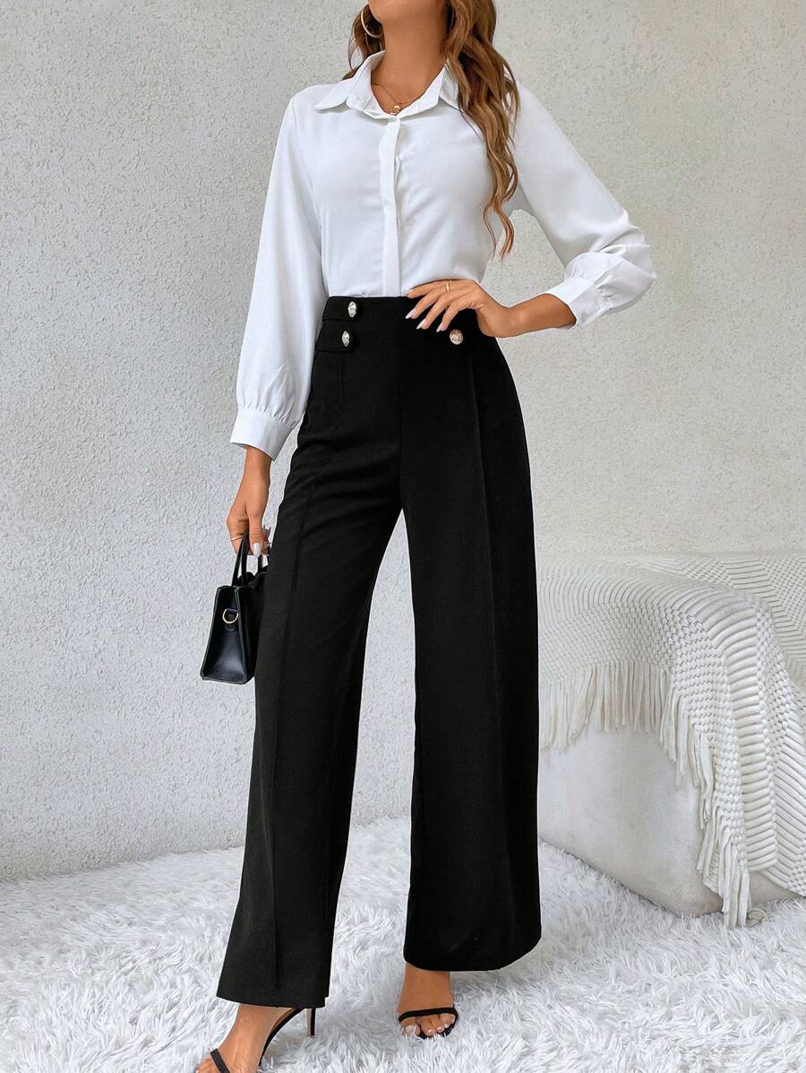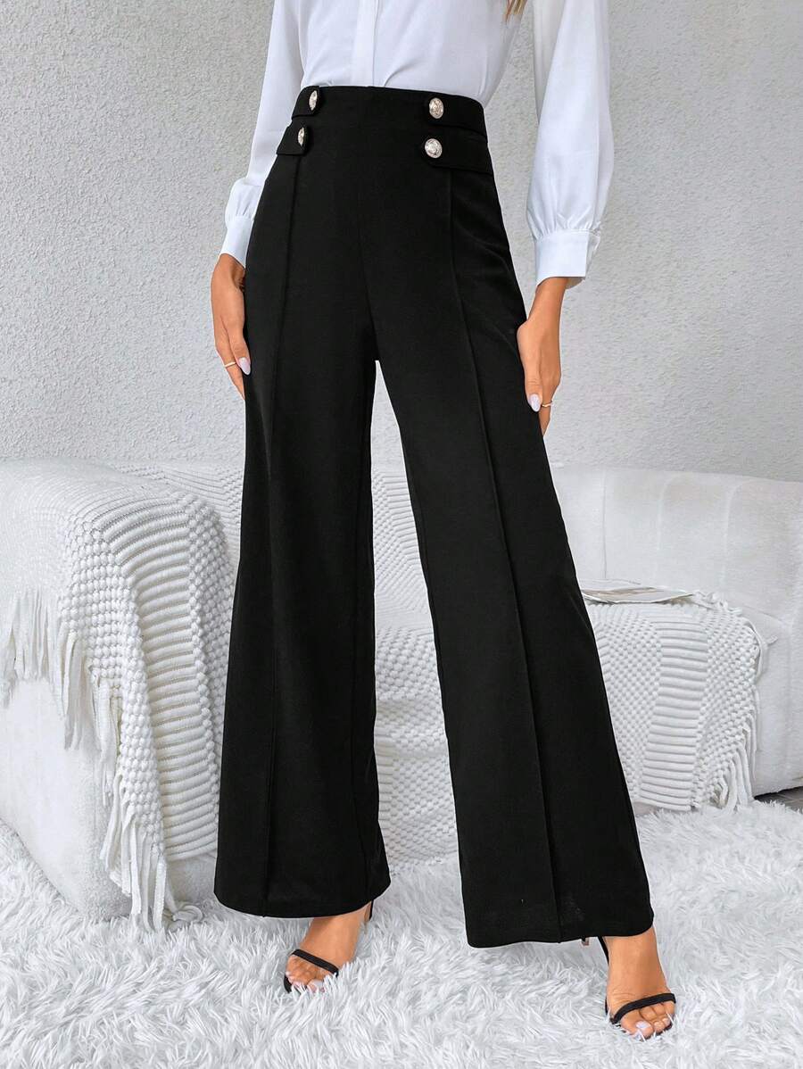 Pantaloni neri eleganti, a vita alta, con dettagli a bottoni e gamba ampia