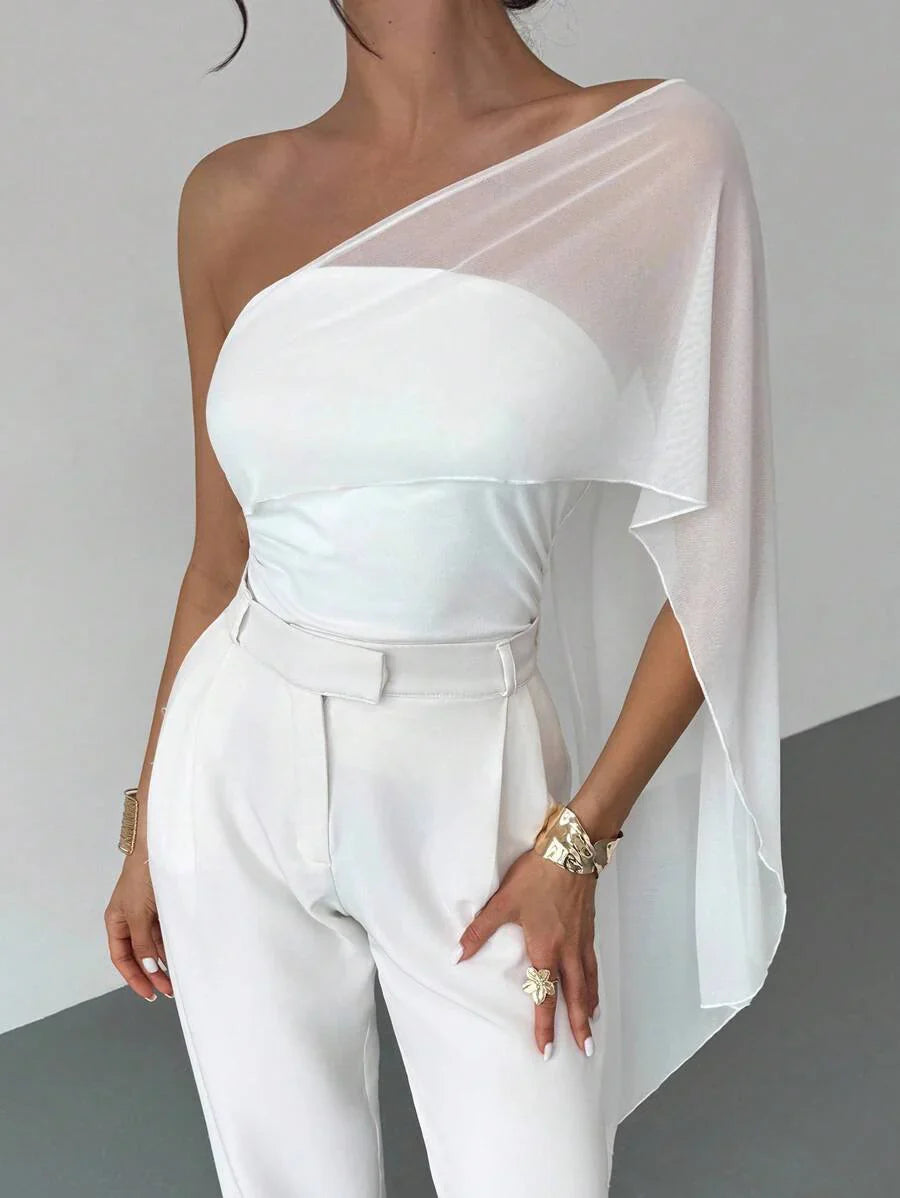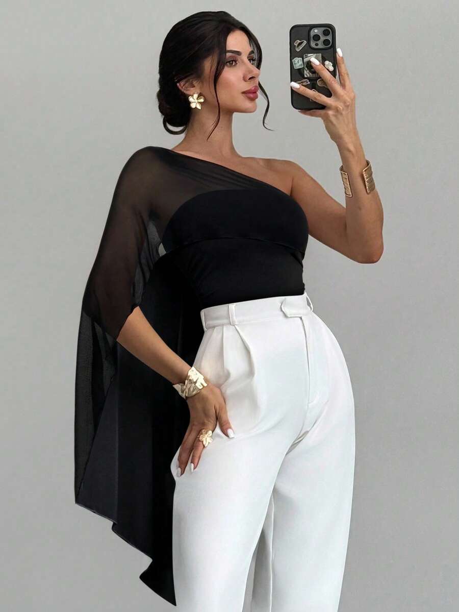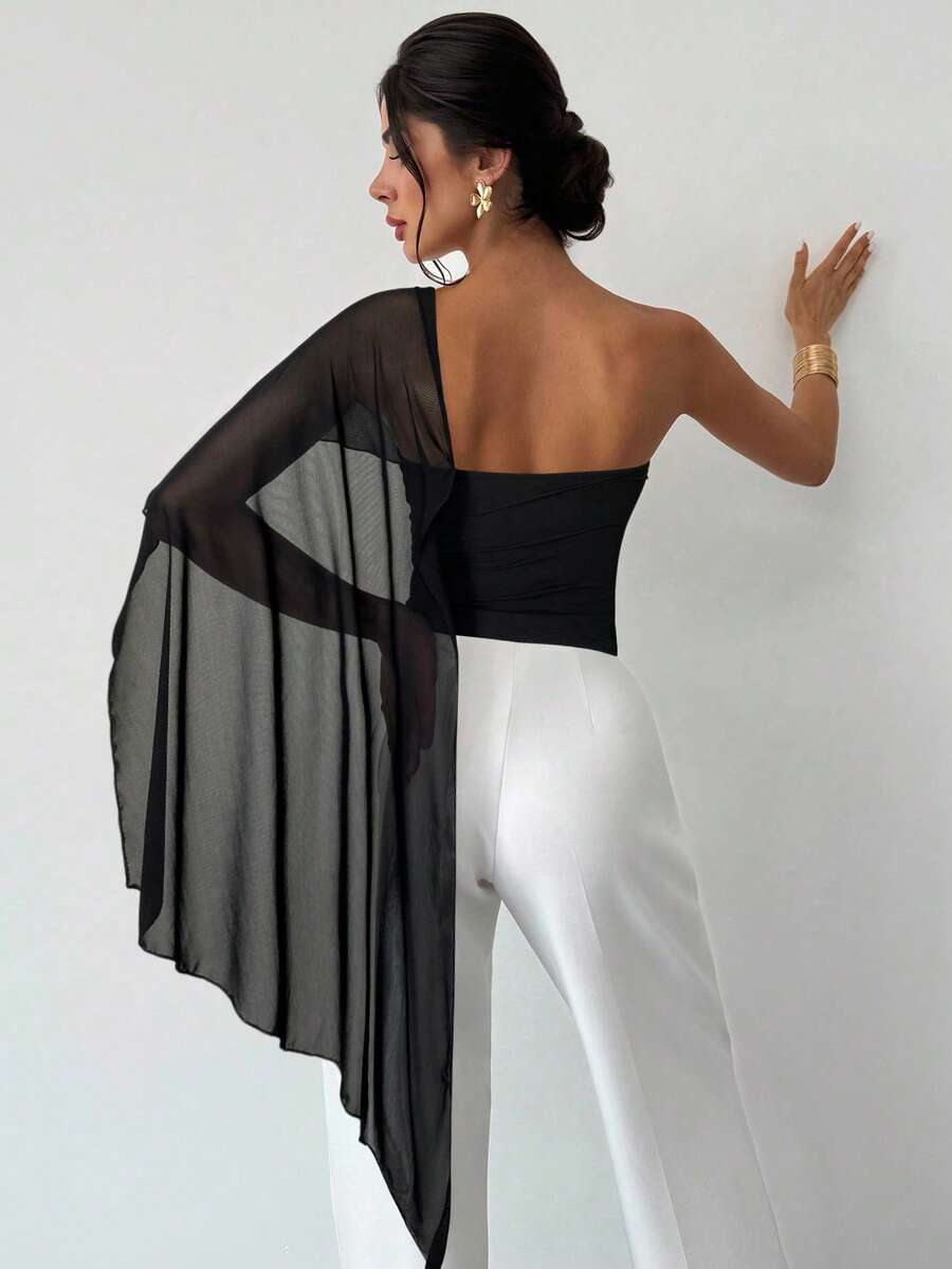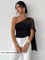 Top elegante e casual da donna, con collo asimmetrico in rete, patchwork