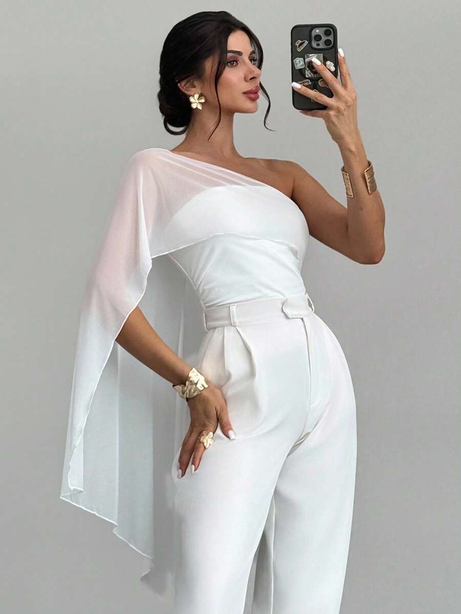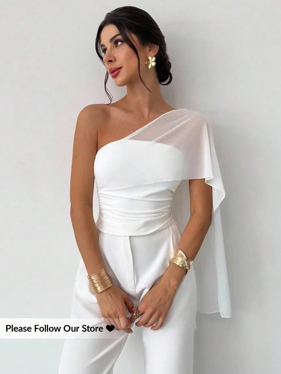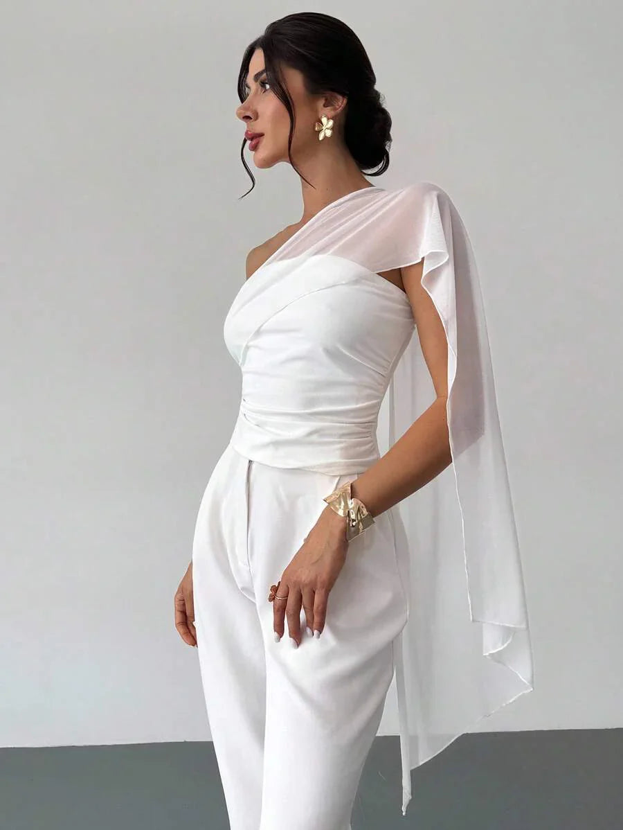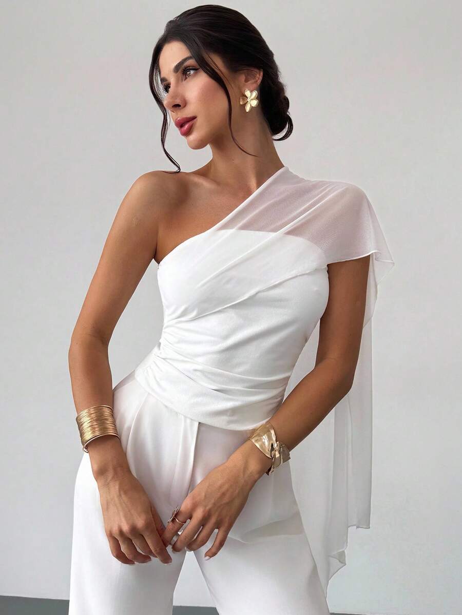 Top elegante e casual da donna, con collo asimmetrico in rete, patchwork