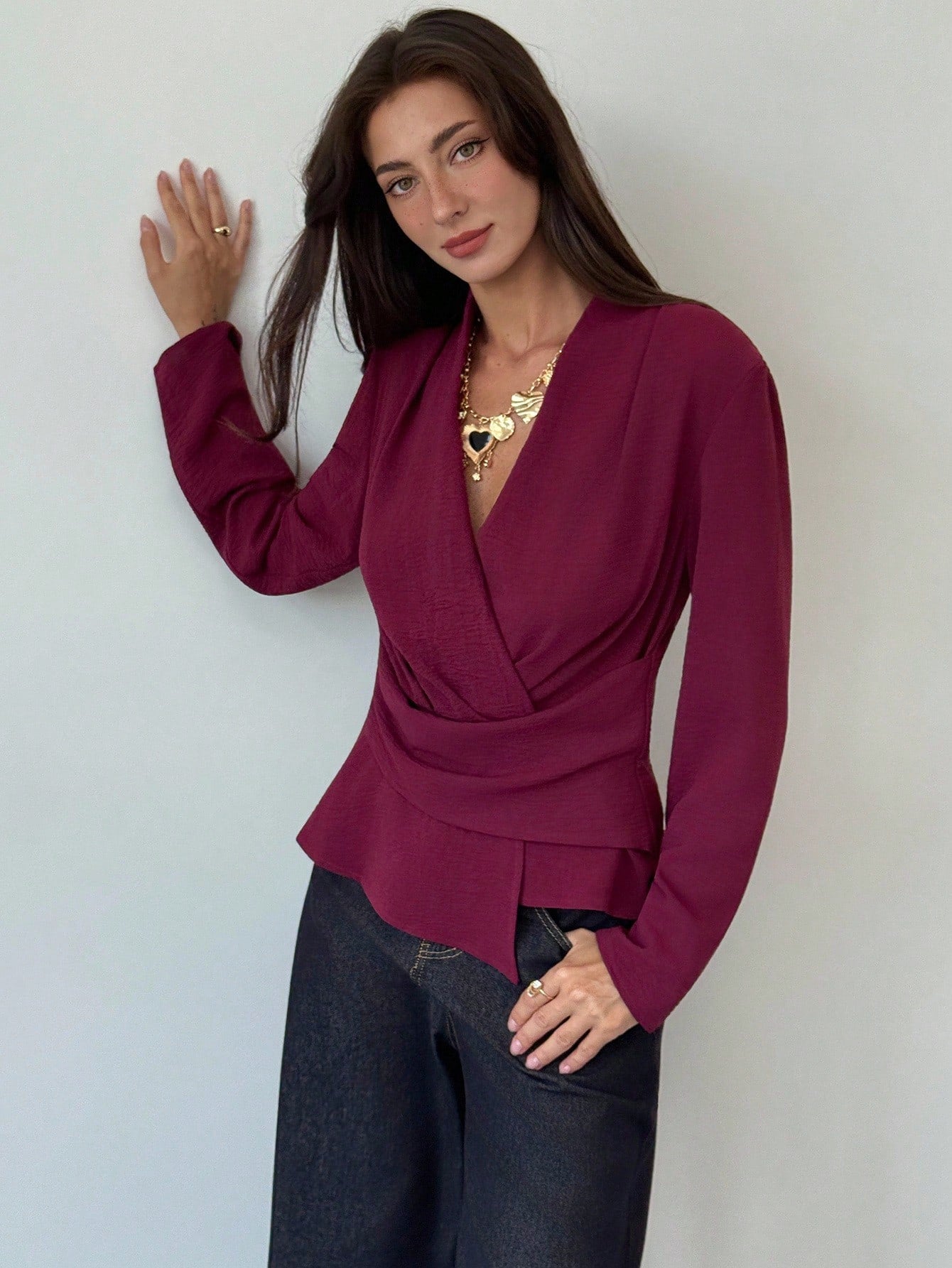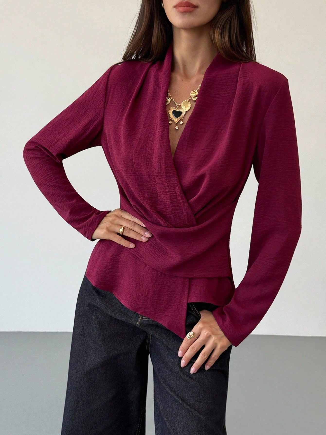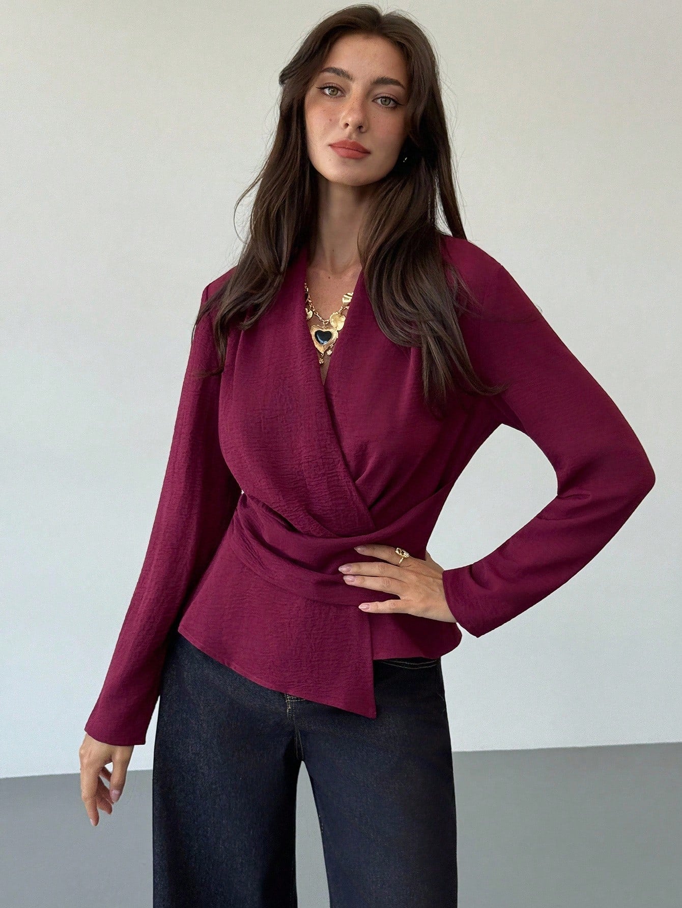 Camicia avvolgente con orlo asimmetrico, colore unito