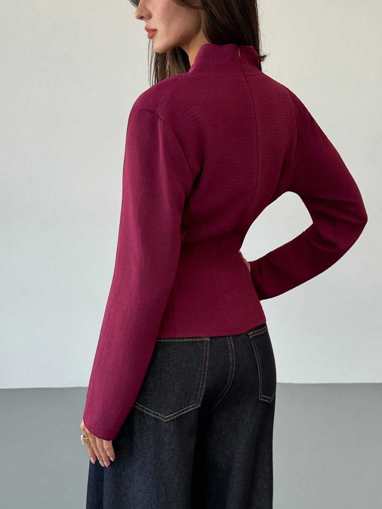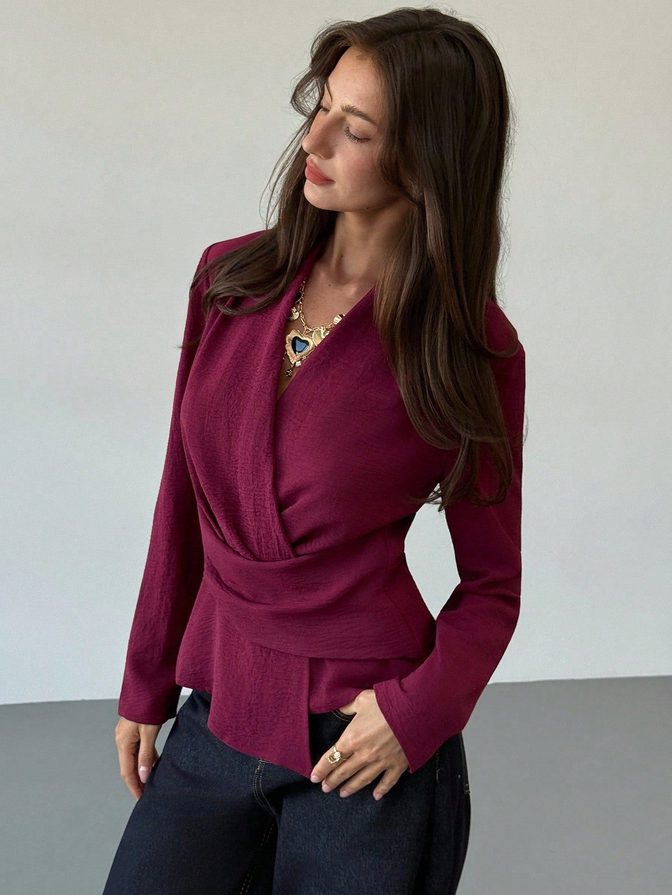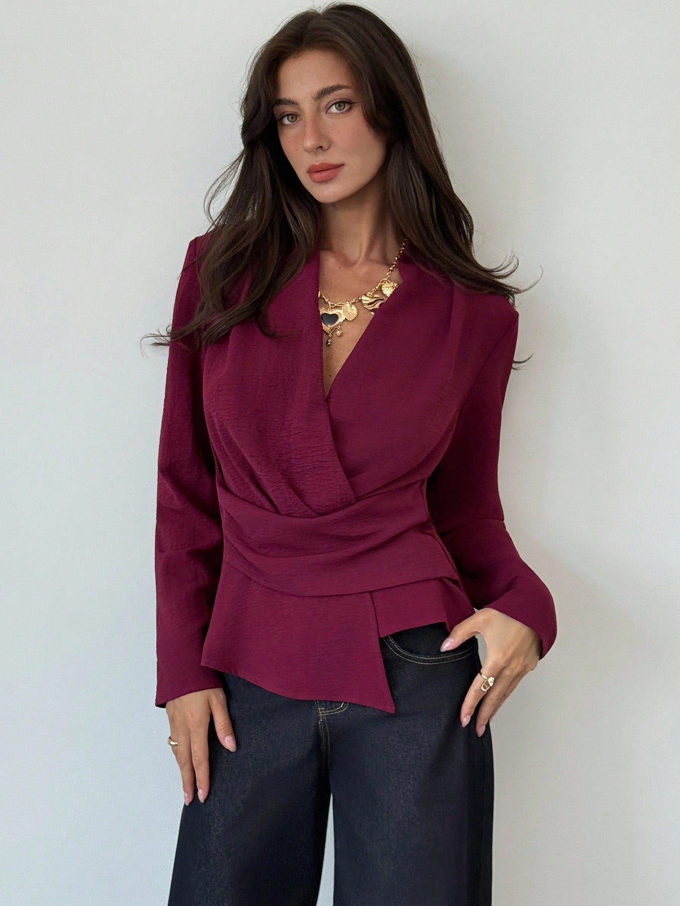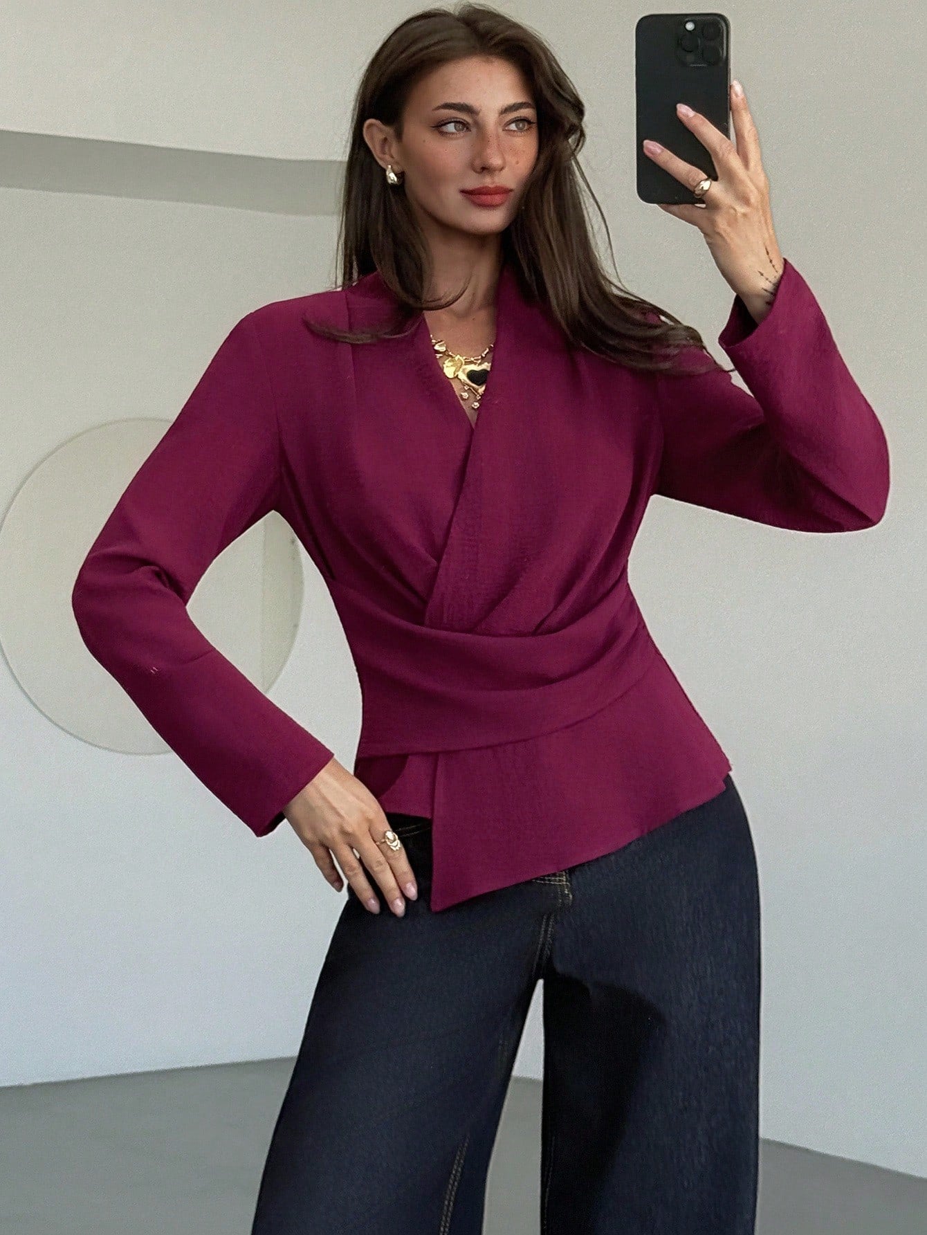 Camicia avvolgente con orlo asimmetrico, colore unito