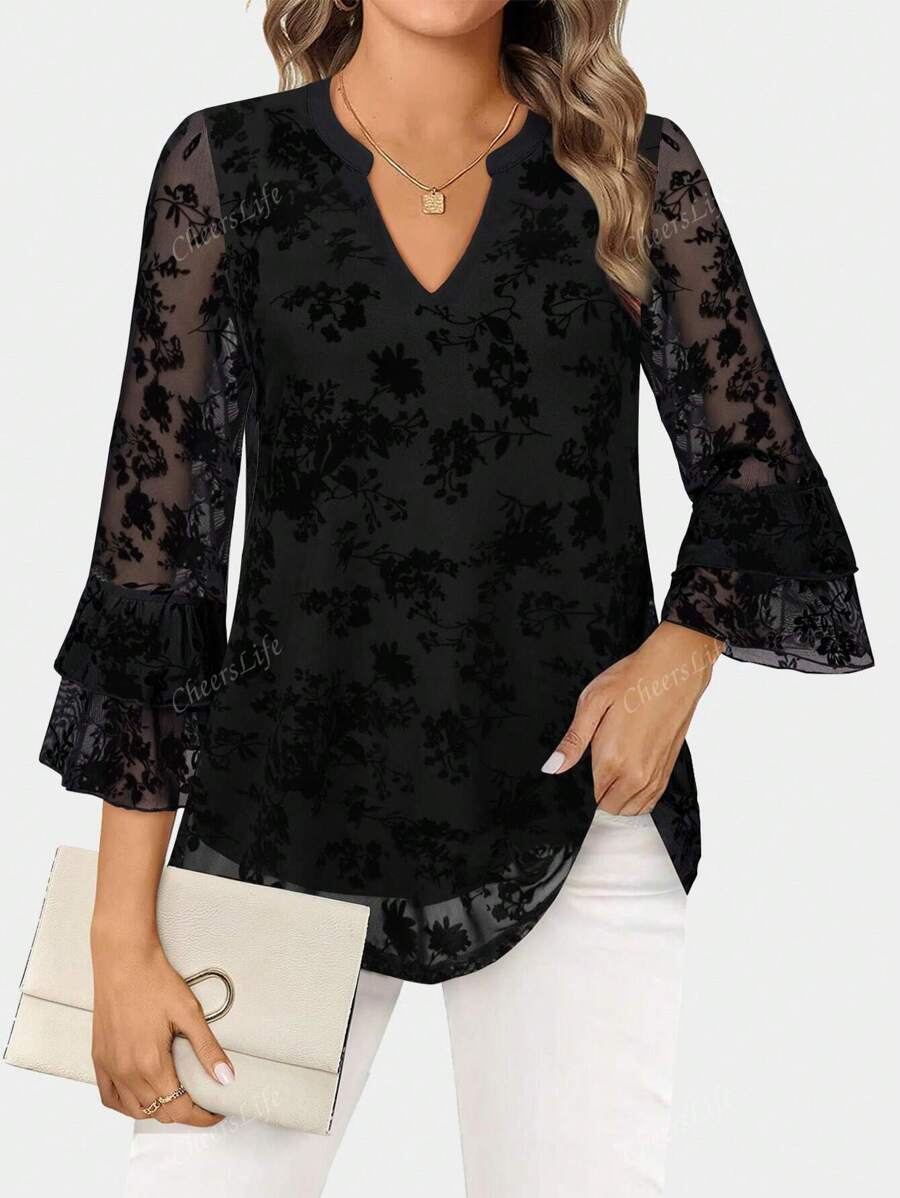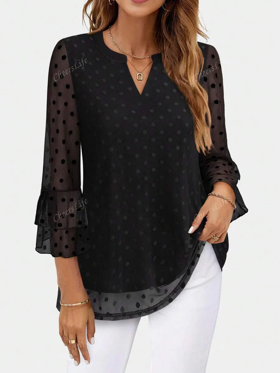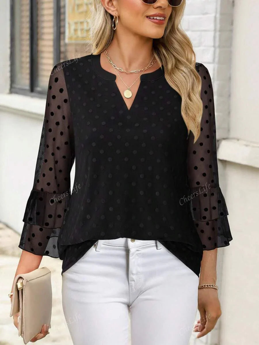 Camicie eleganti casual da donna con maniche a campana a 3/4 strati, camicie a V in doppio strato in rete