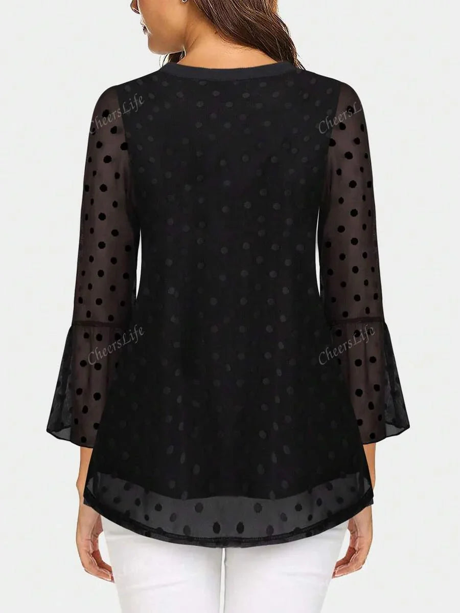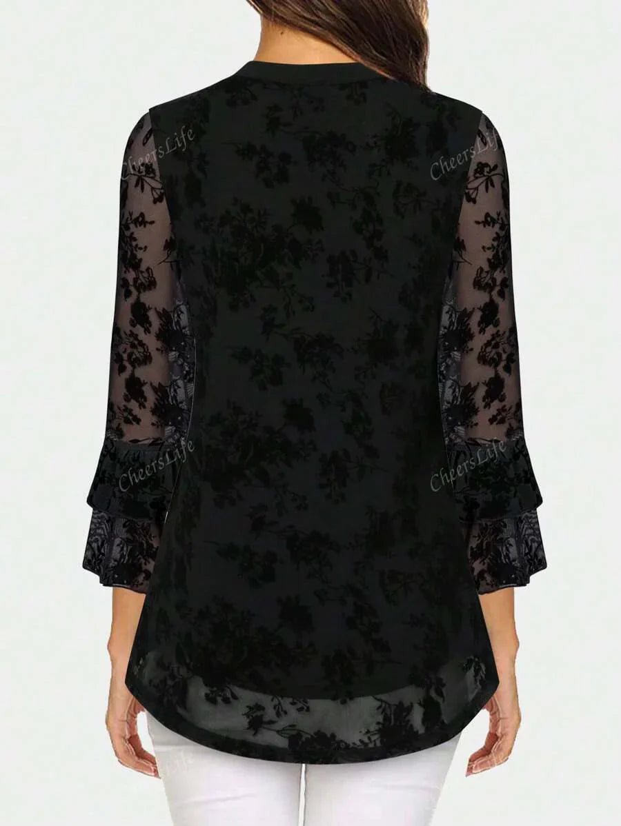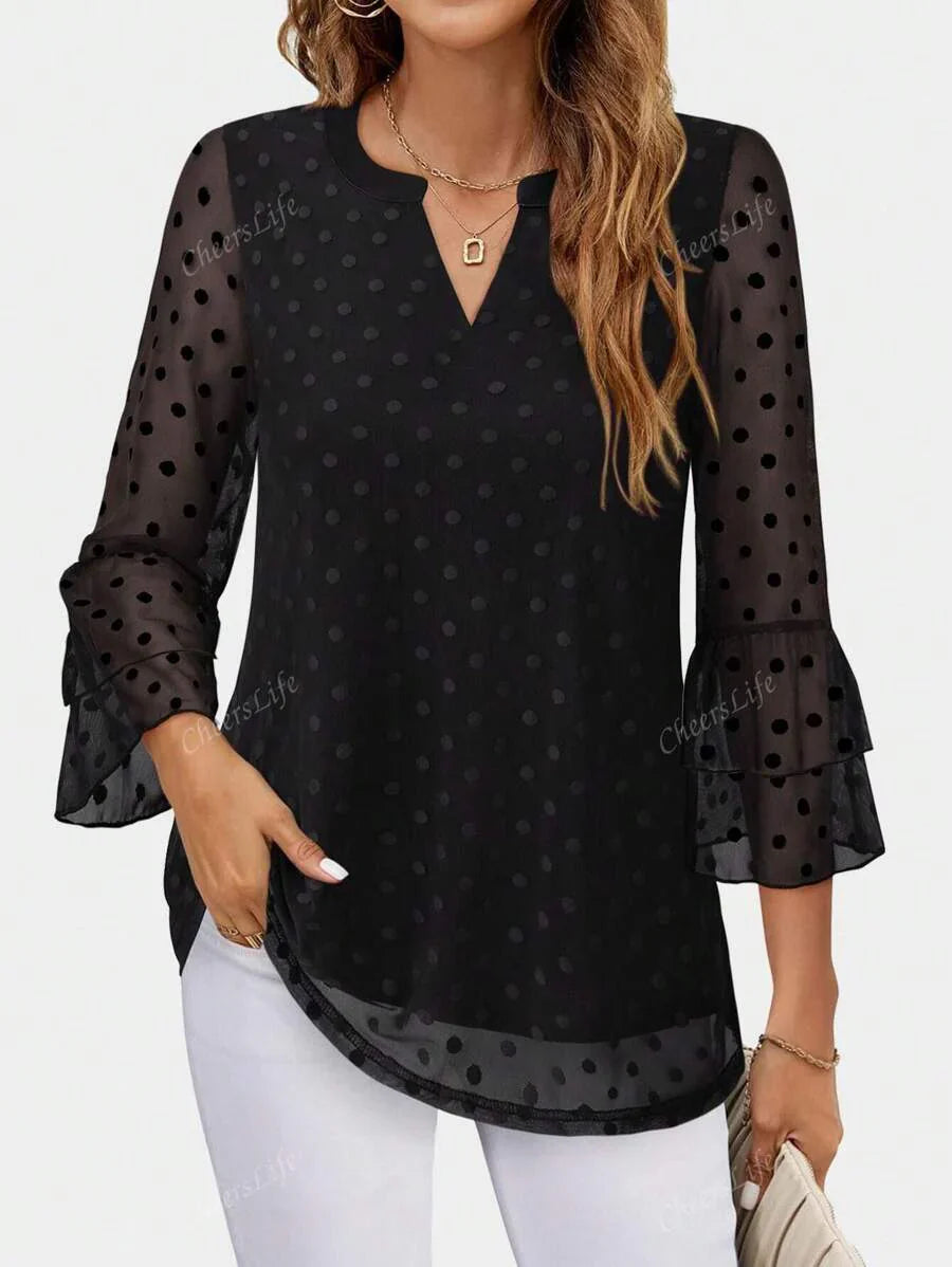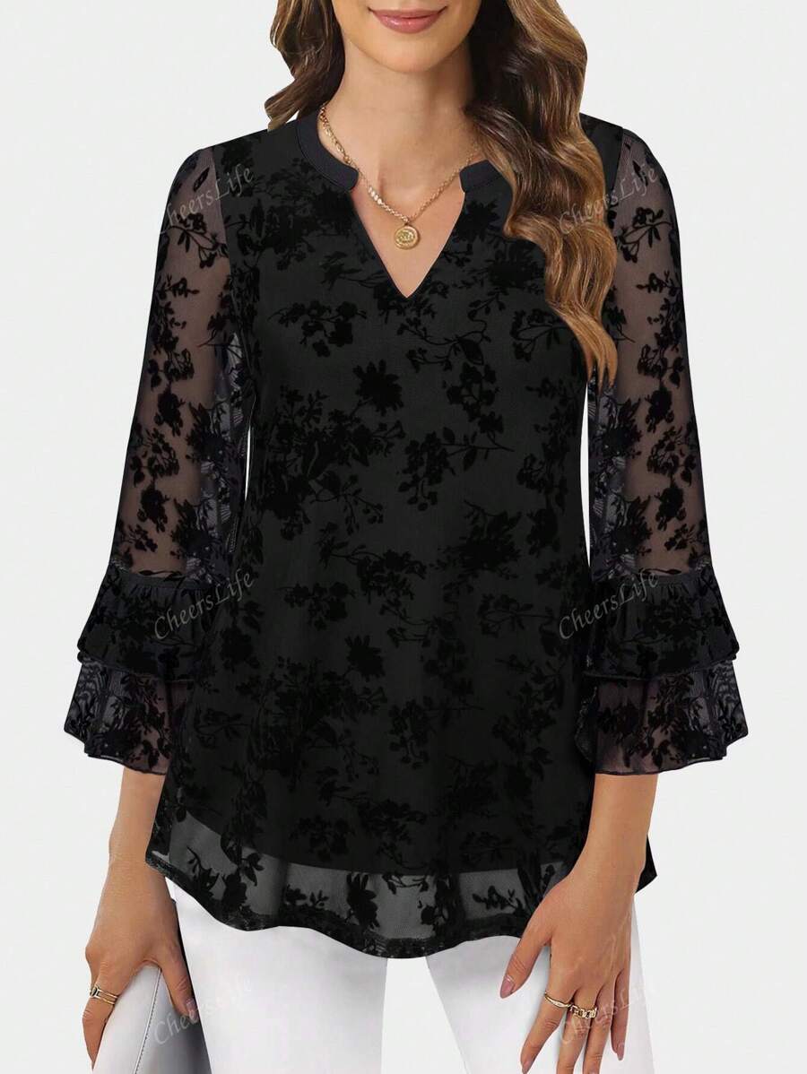 Camicie eleganti casual da donna con maniche a campana a 3/4 strati, camicie a V in doppio strato in rete