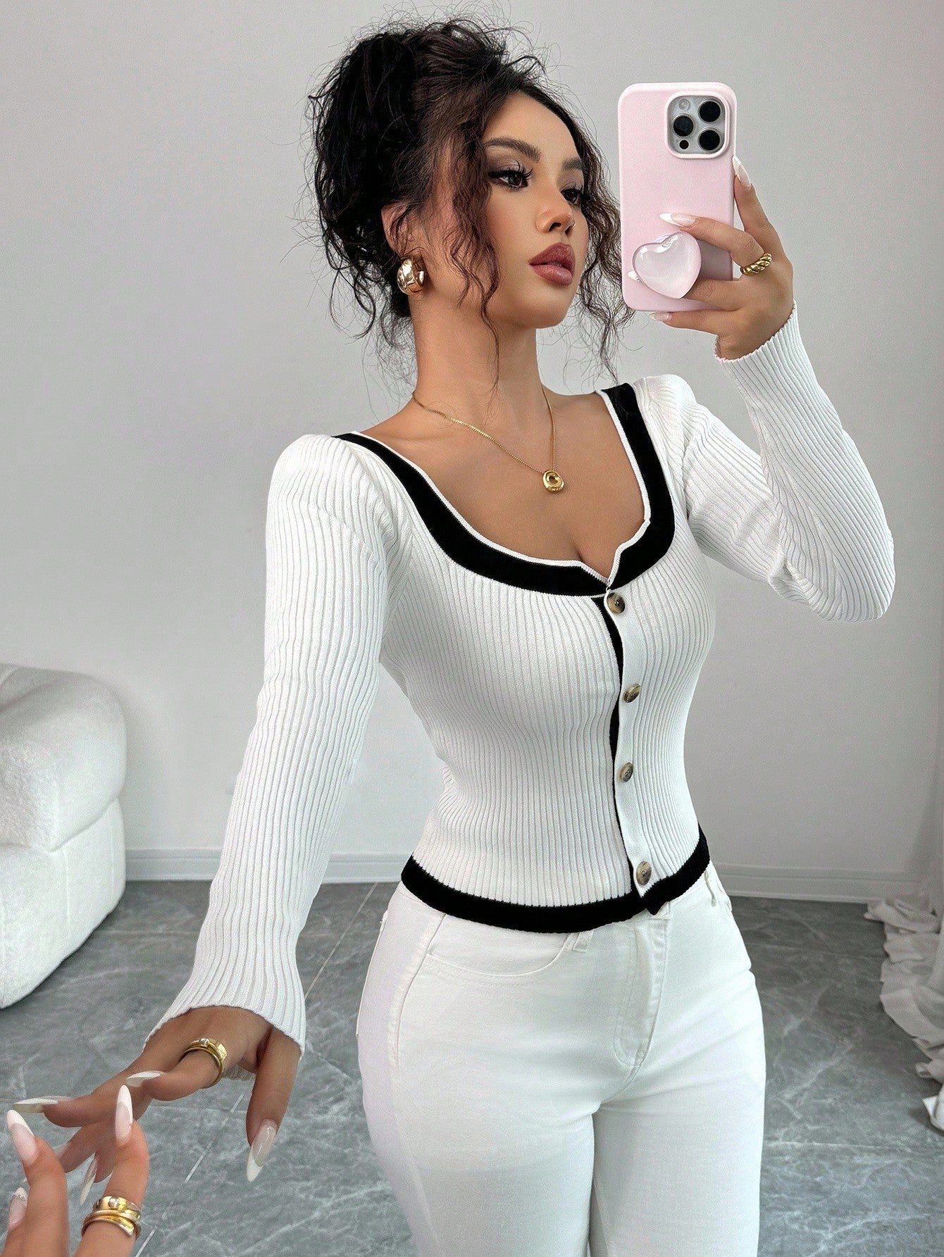 Cardigan casual slim monopetto a collo quadrato con contrasto di colore per donna