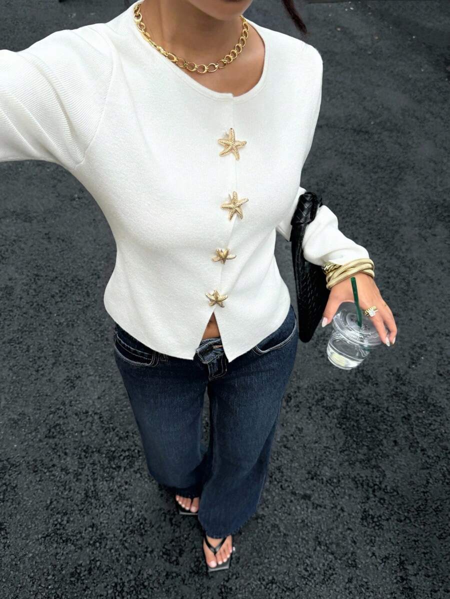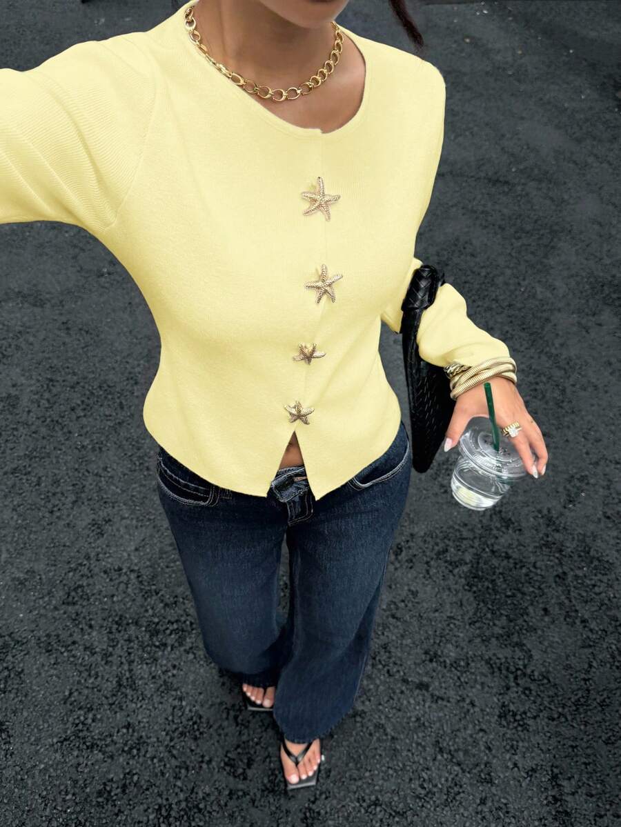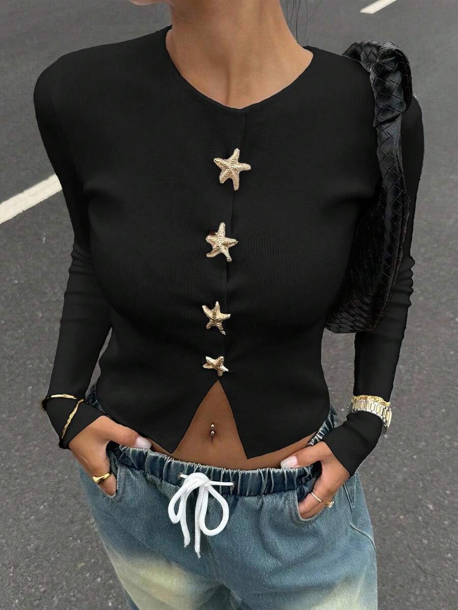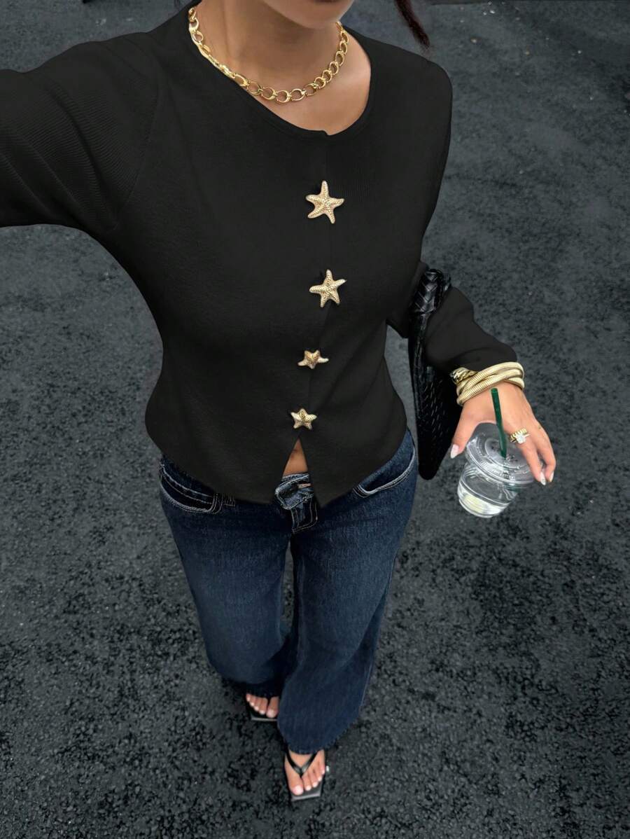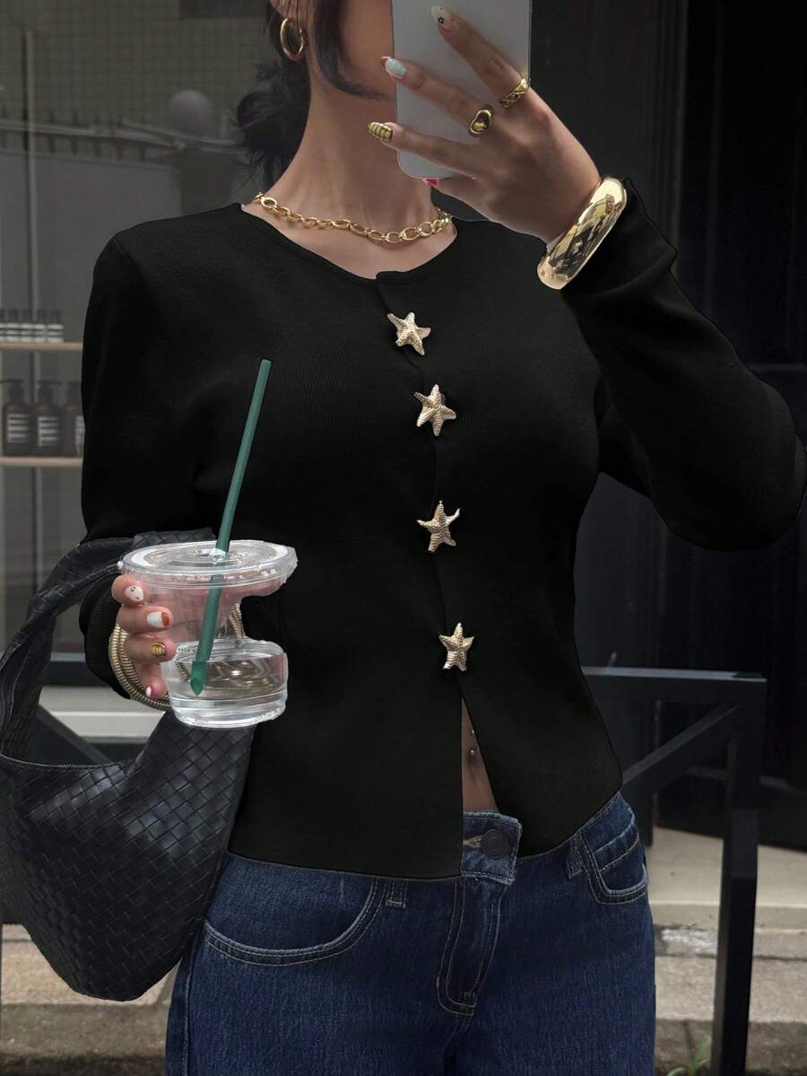 Cardigan corto in maglia nera con bottoni a stella e design a costine per look casual