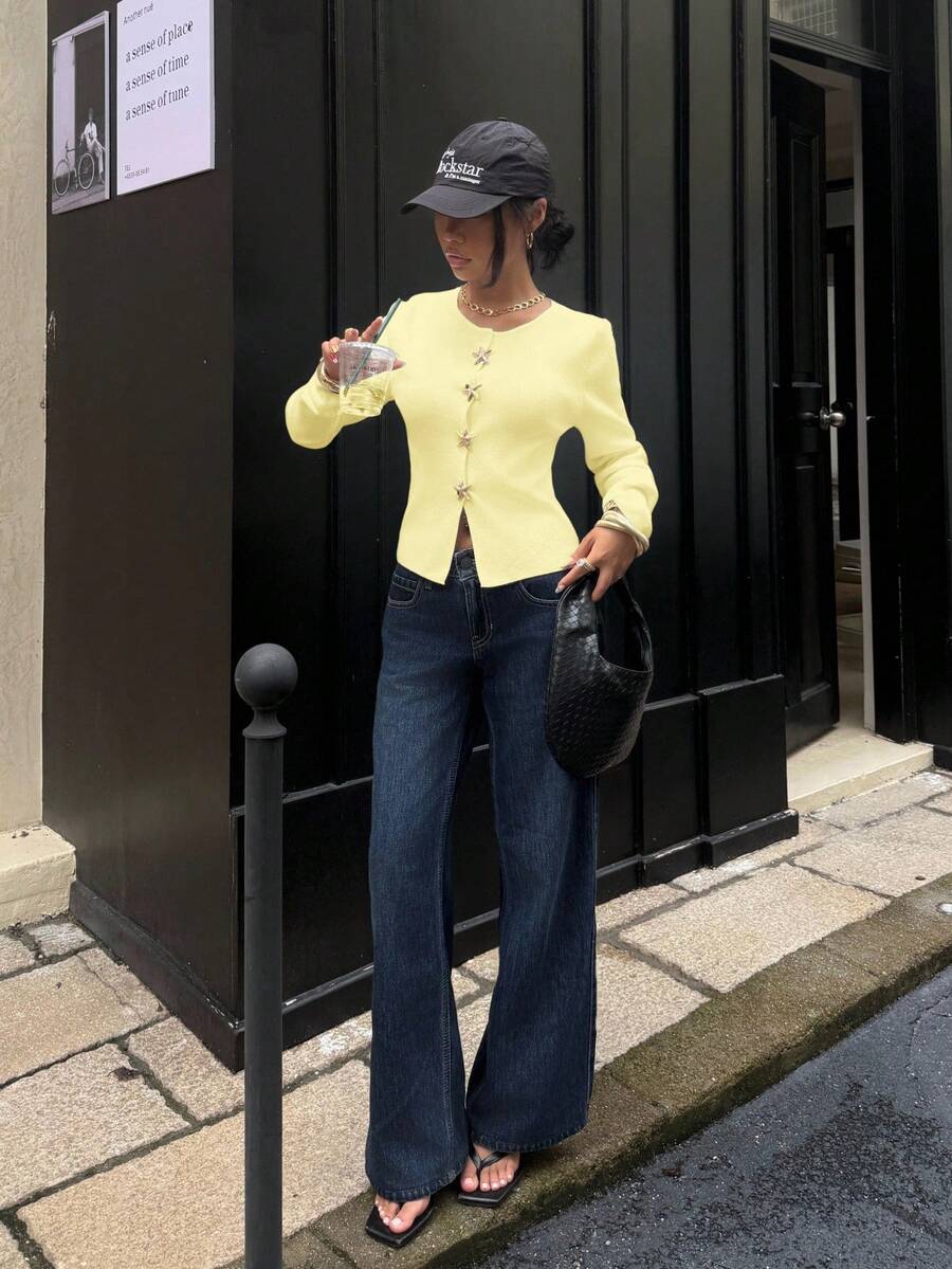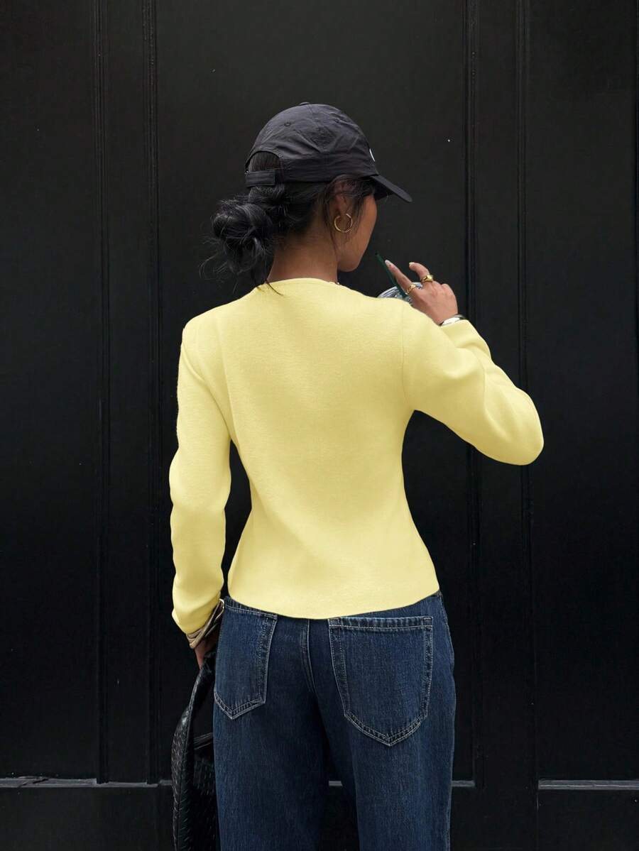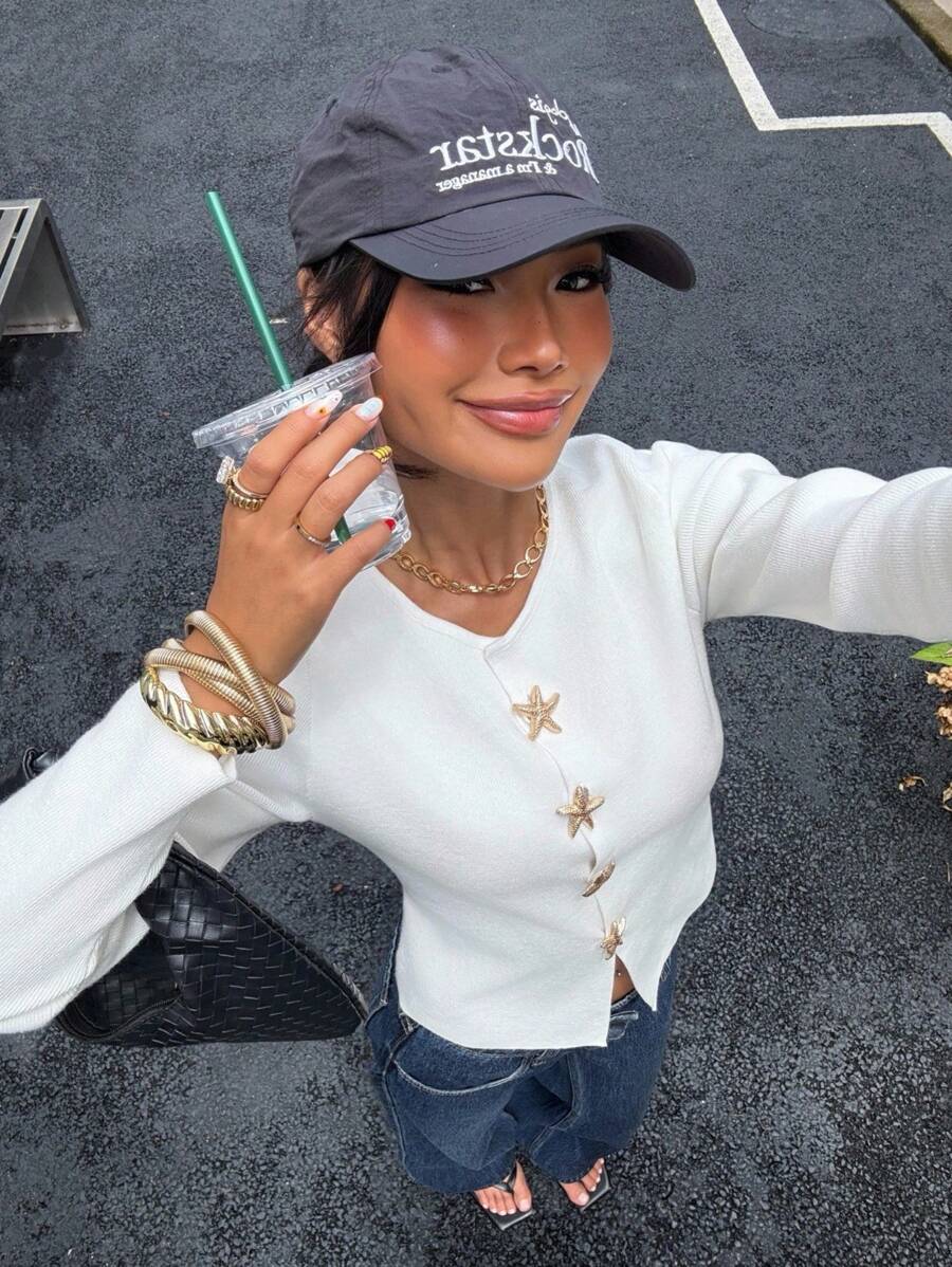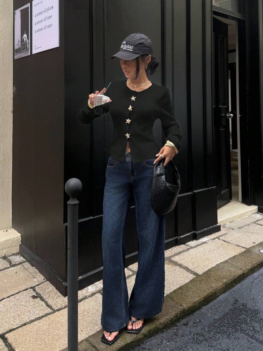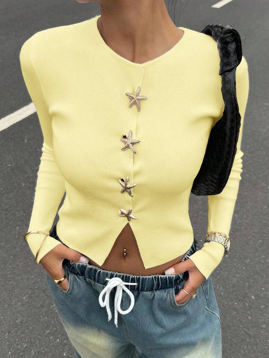 Cardigan corto in maglia nera con bottoni a stella e design a costine per look casual