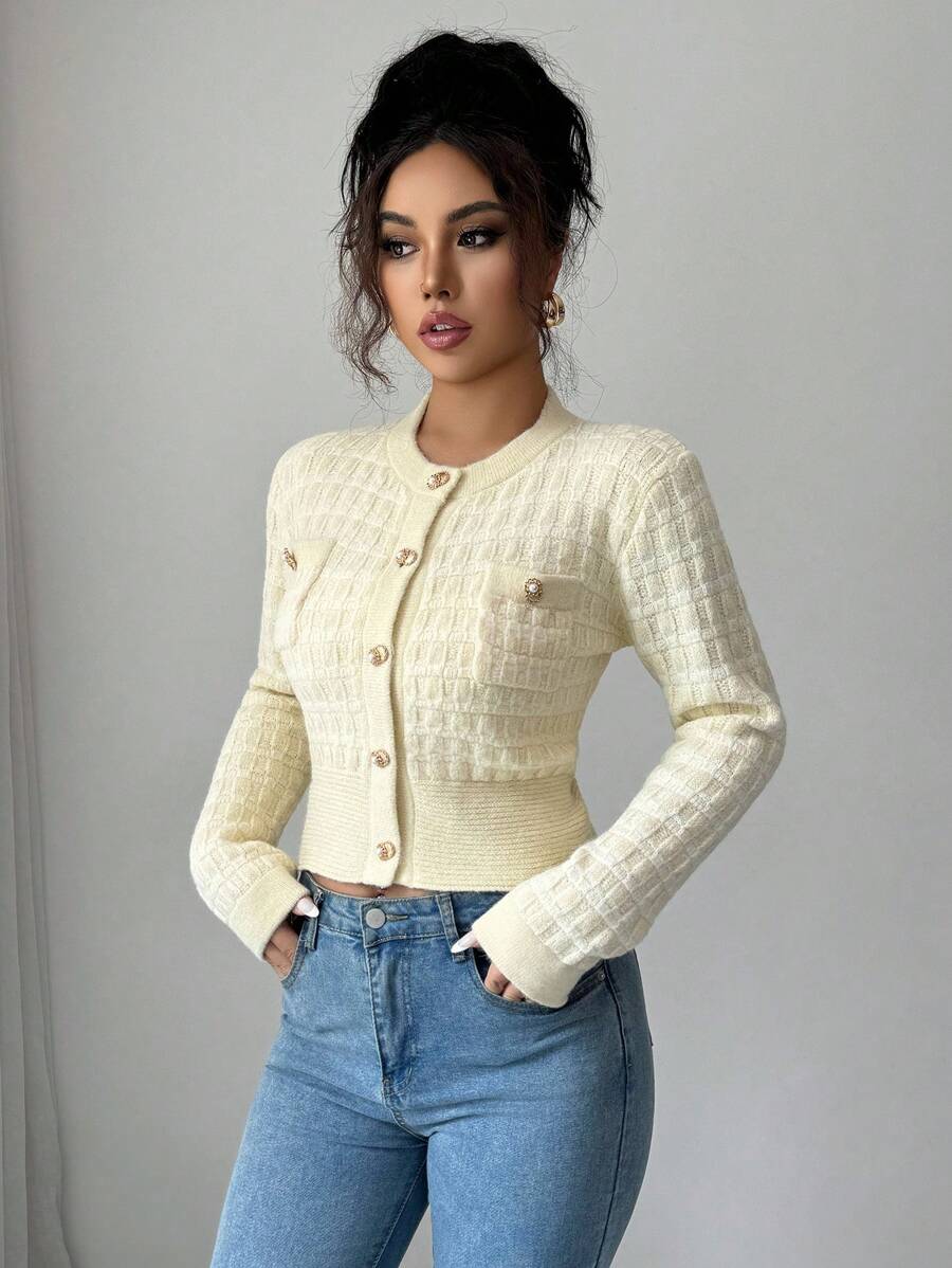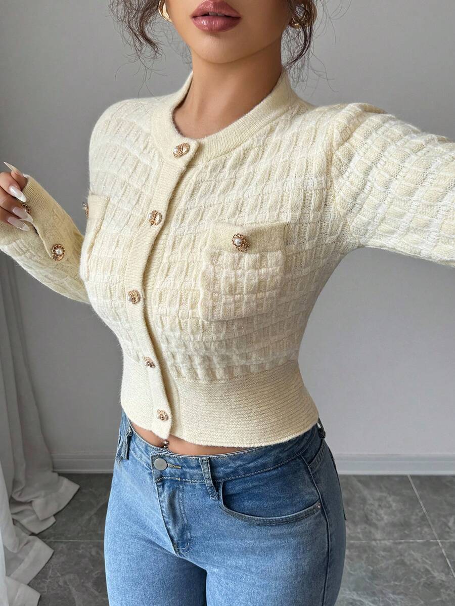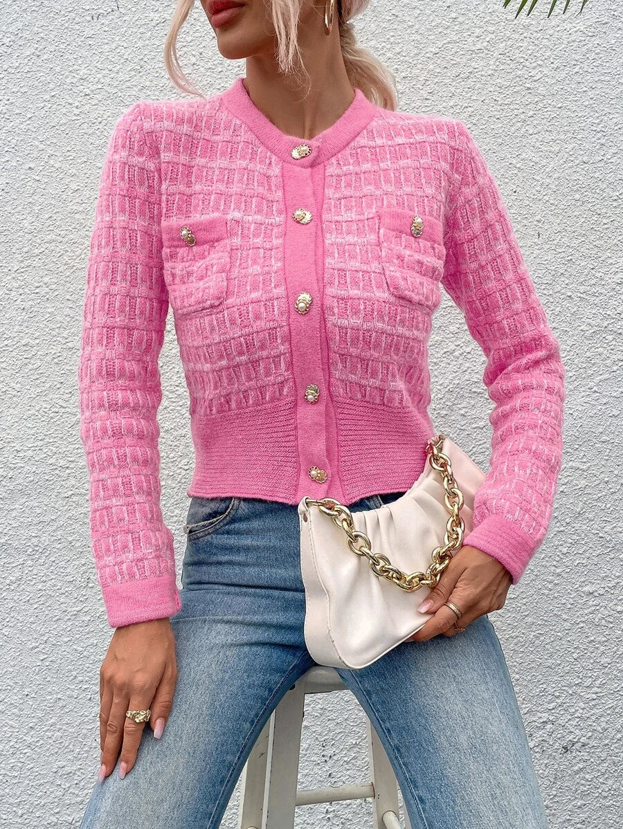 Cardigan elegante a maniche lunghe con bottoni frontali e tasche, in stile classico