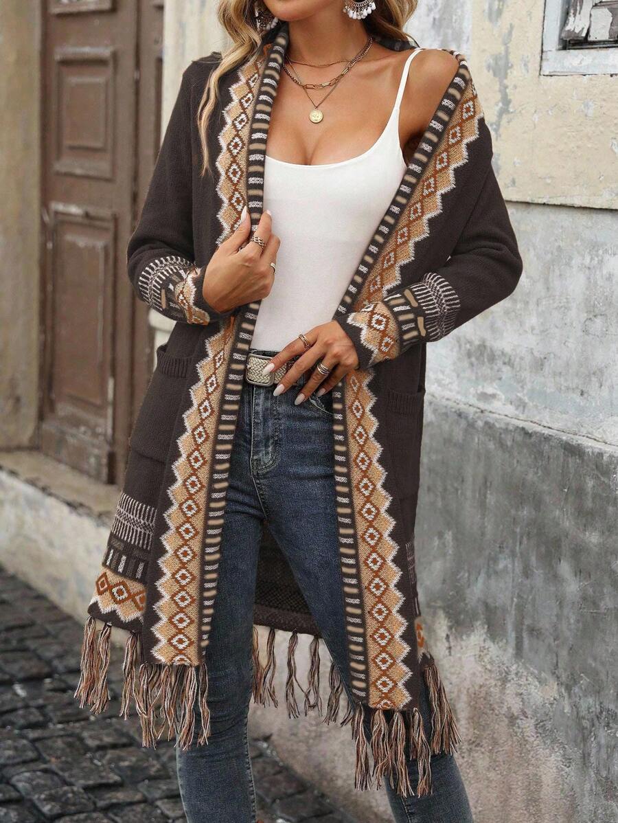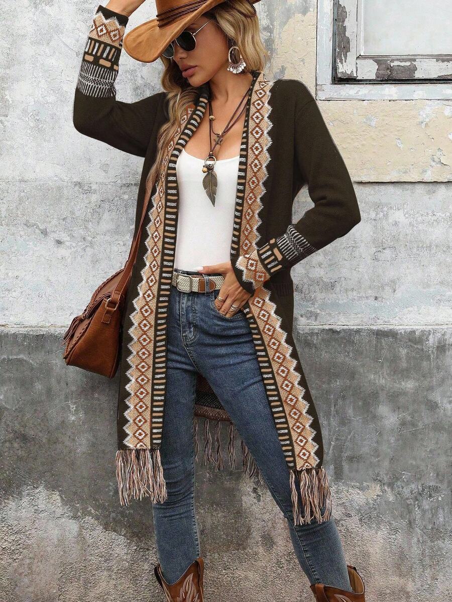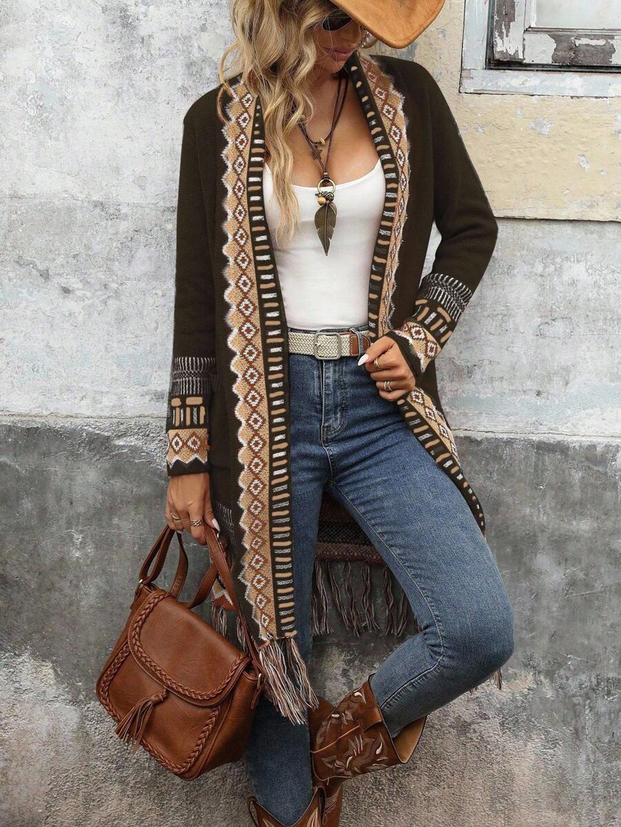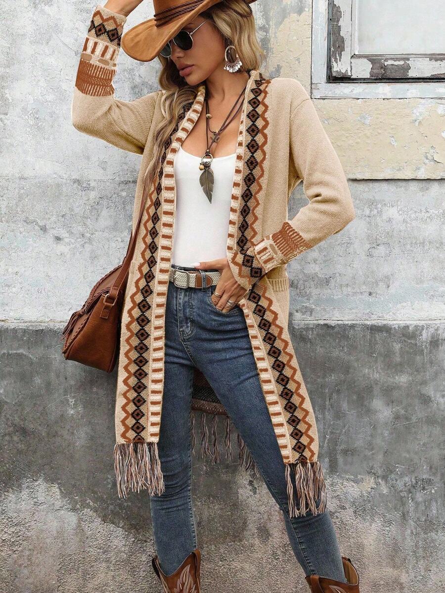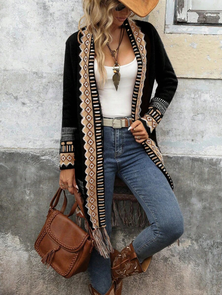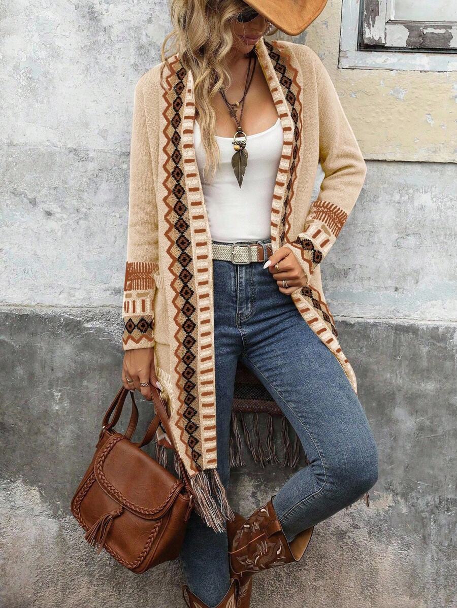 Cardigan lungo a maniche aperte con stampa geometrica da donna, stile casual