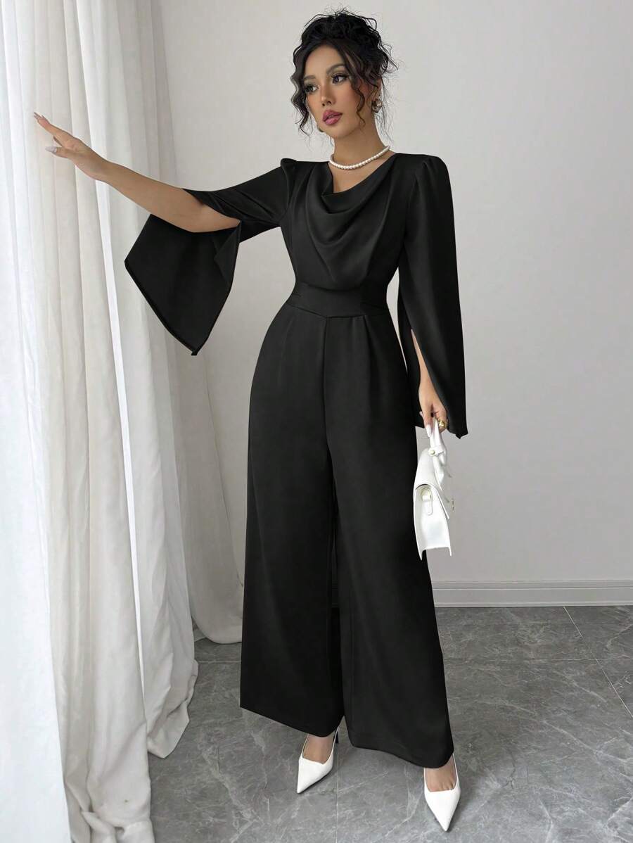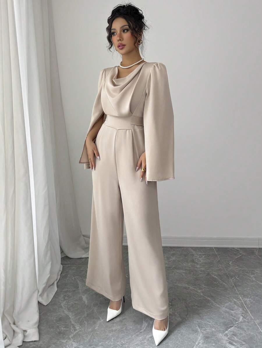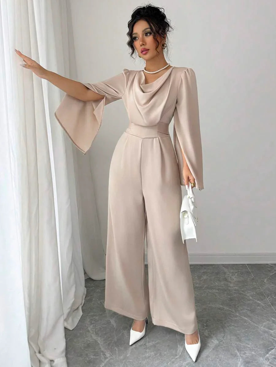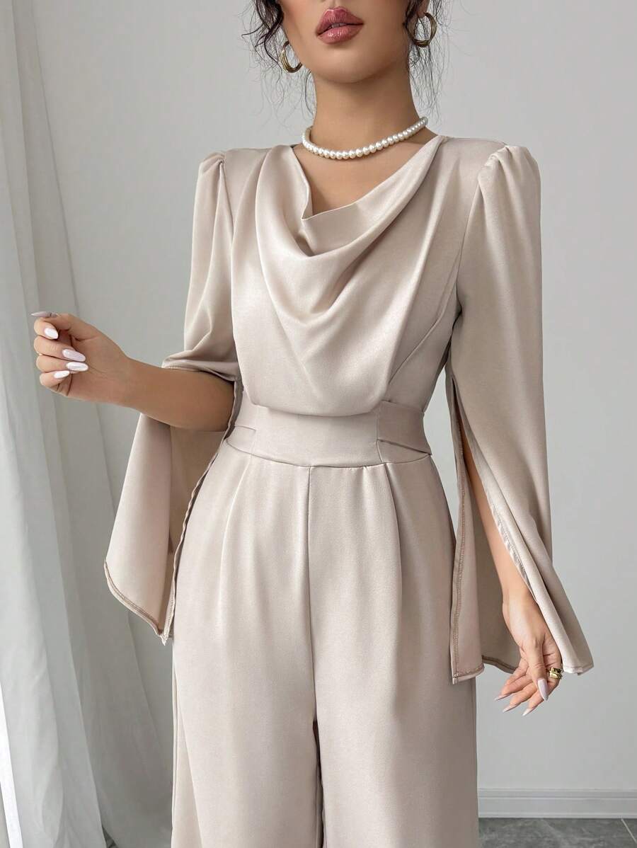 Tuta elegante da donna con scollo drappeggiato e vita stretta in raso