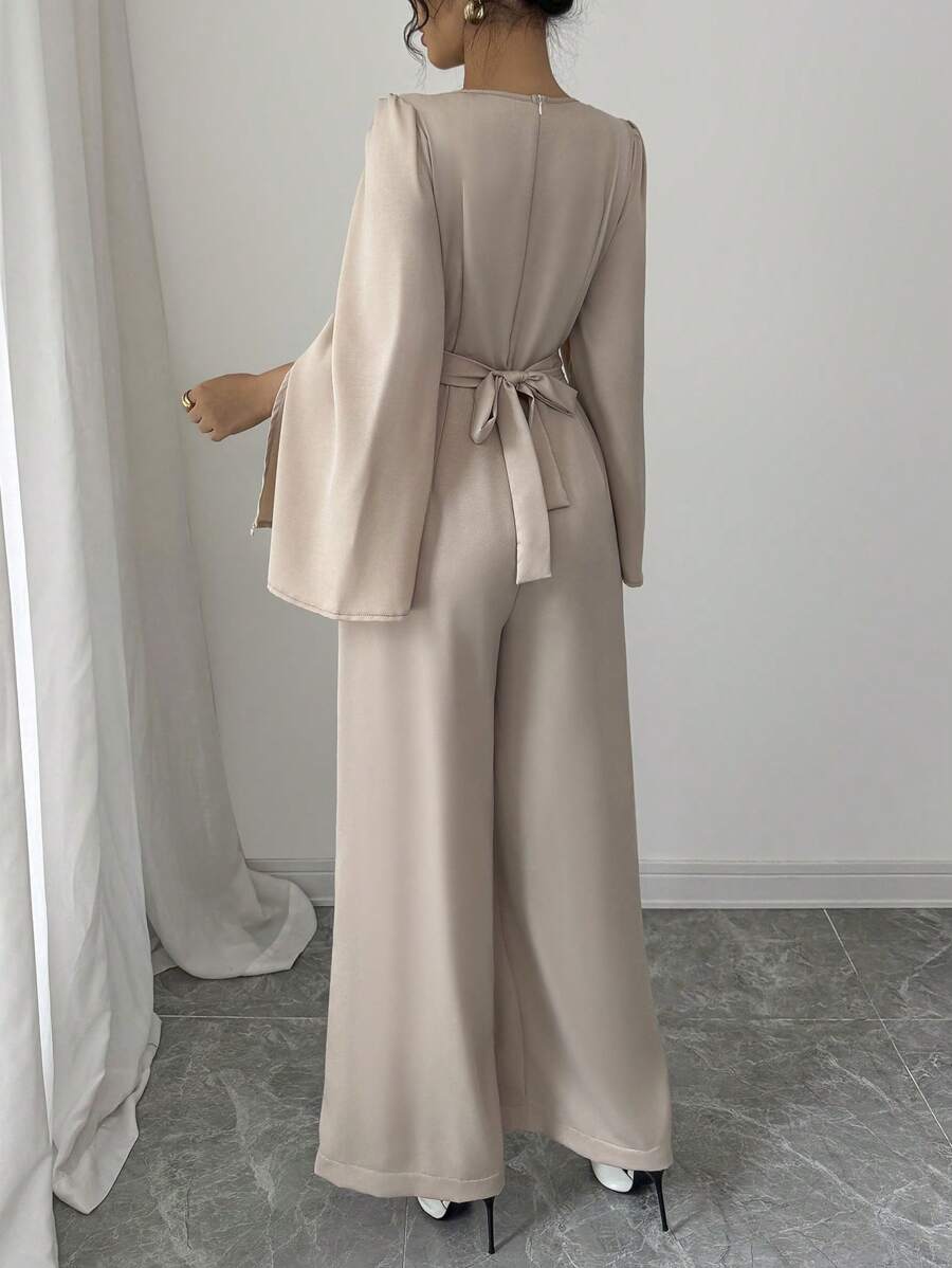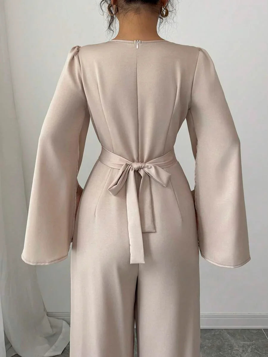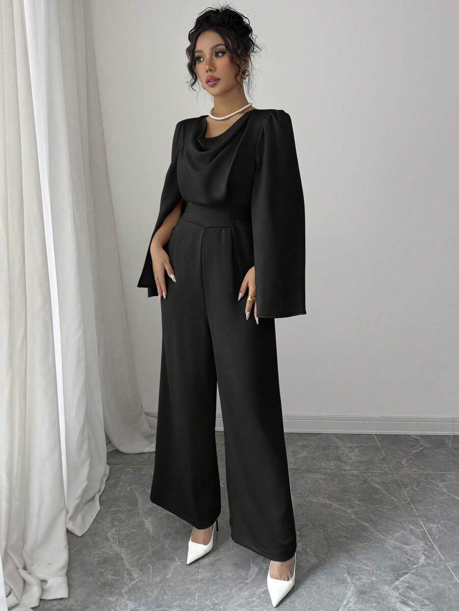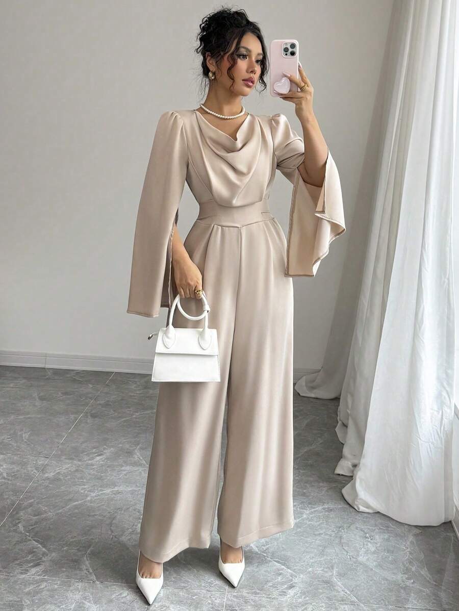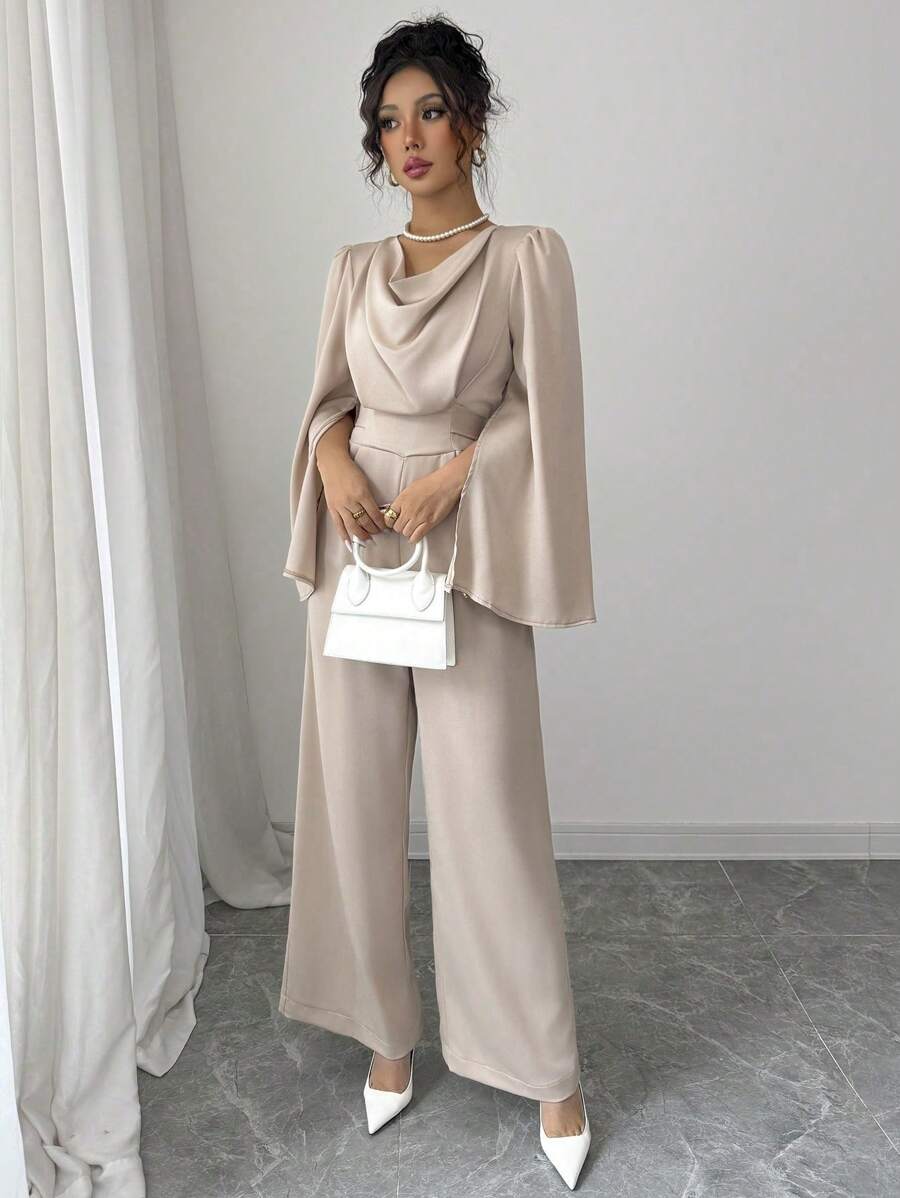 Tuta elegante da donna con scollo drappeggiato e vita stretta in raso