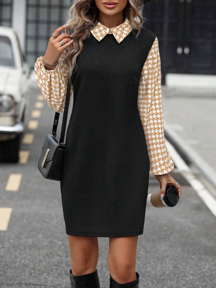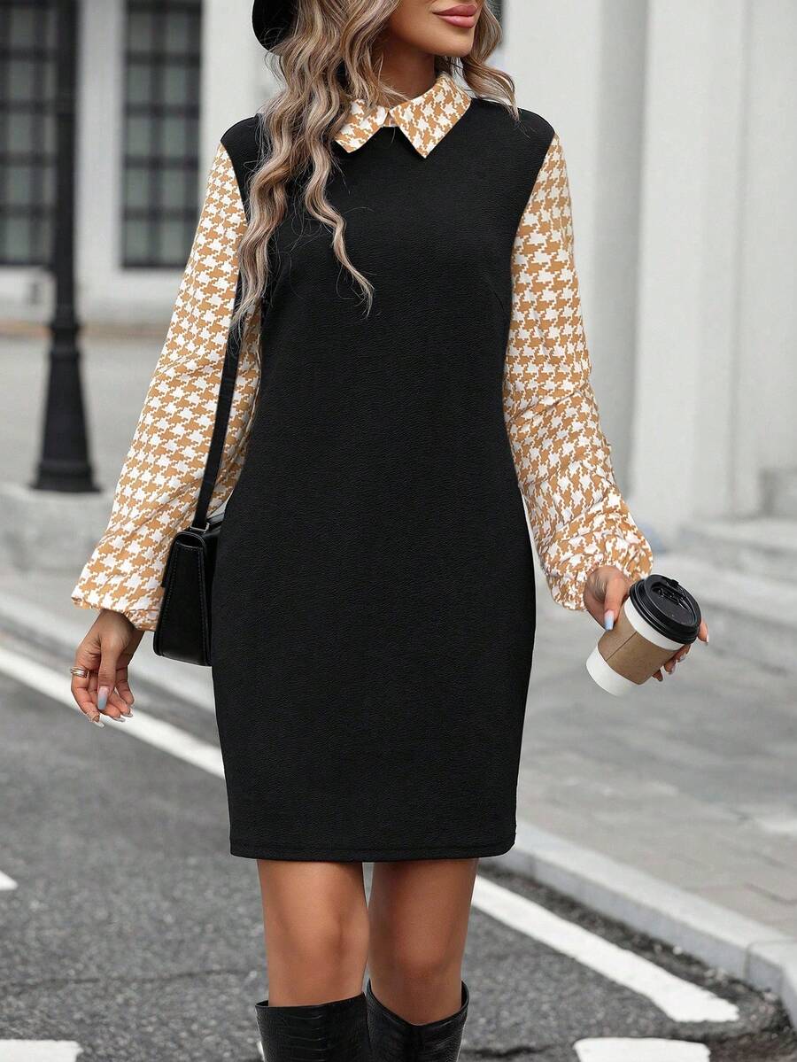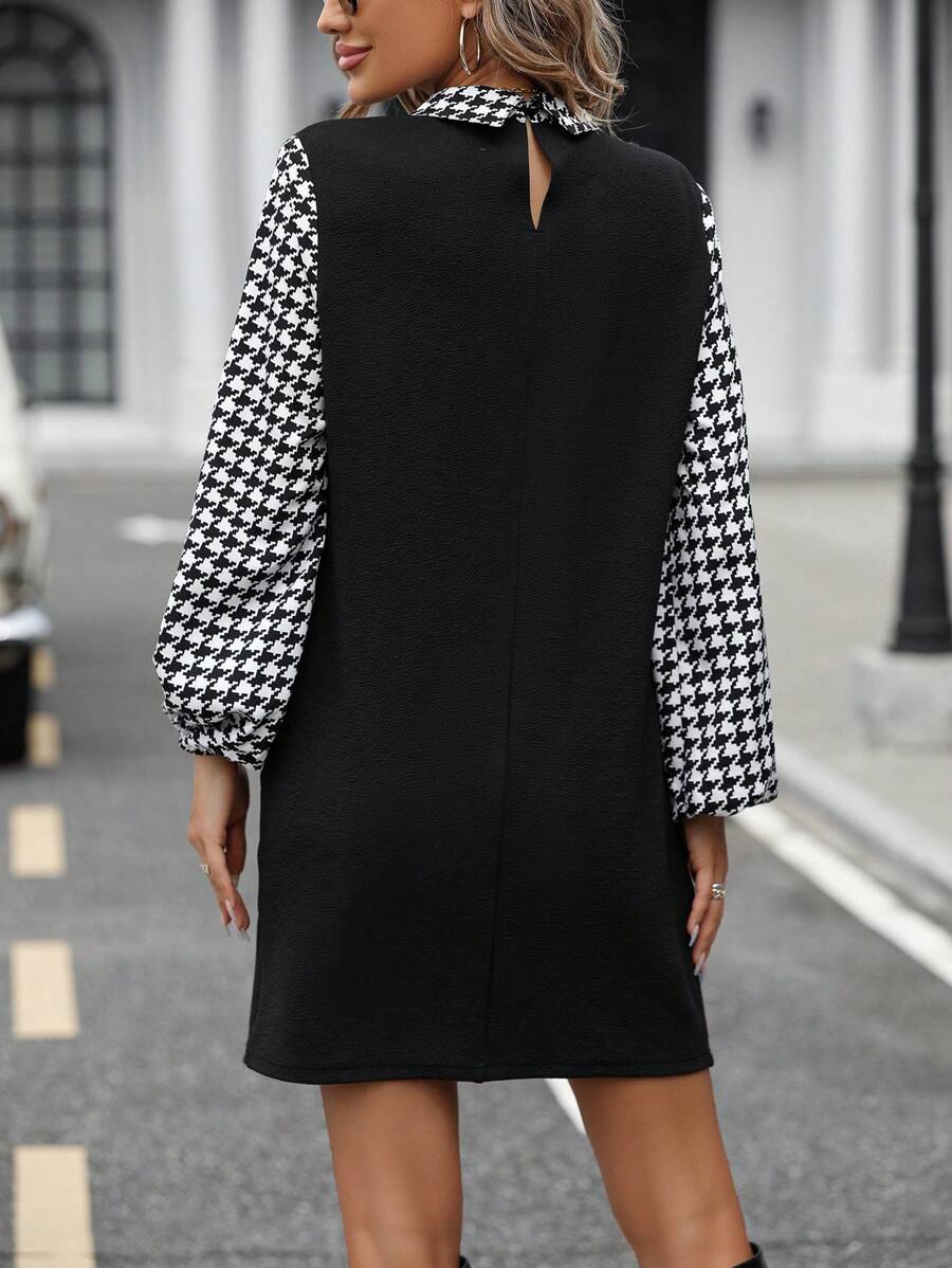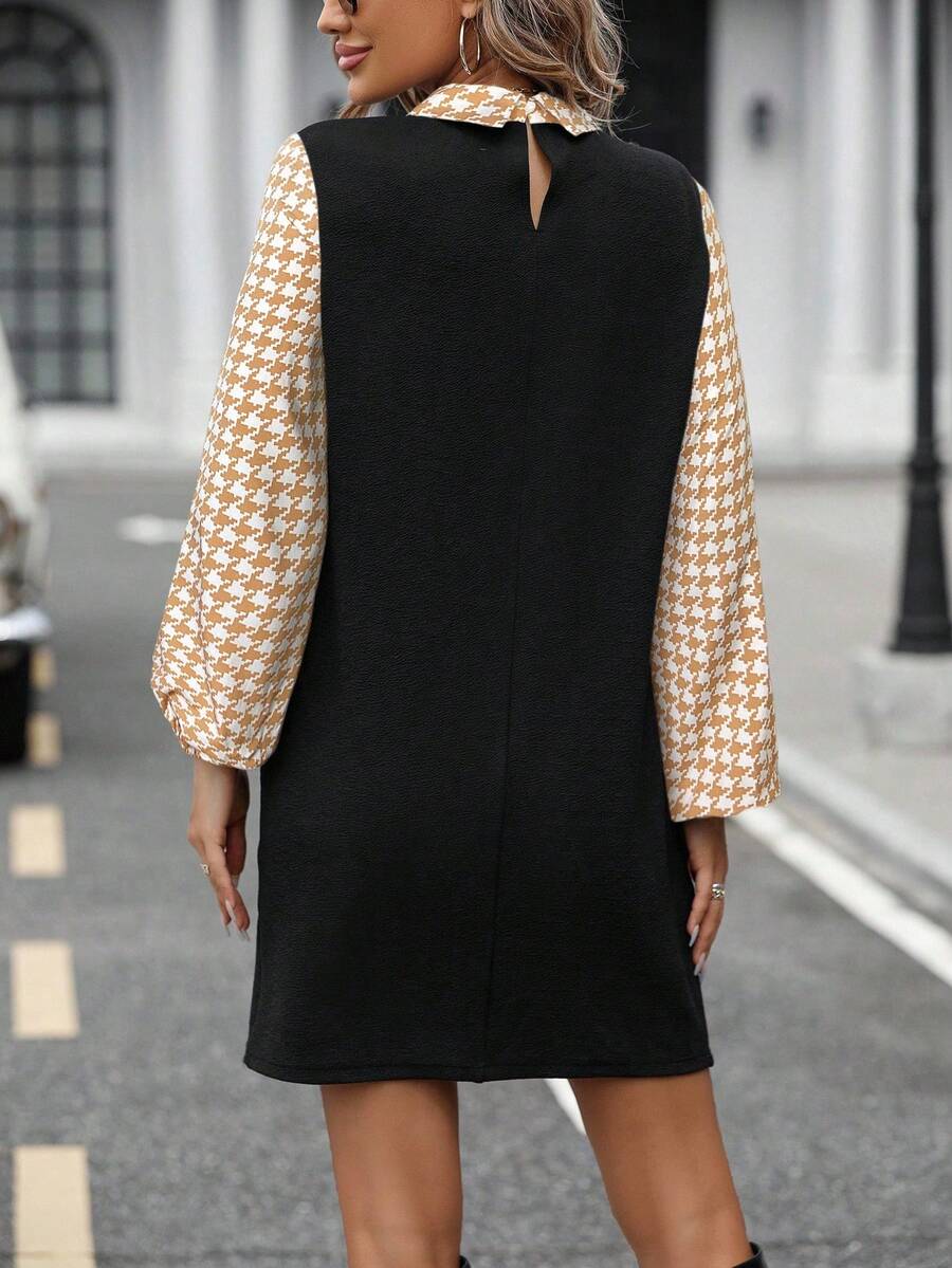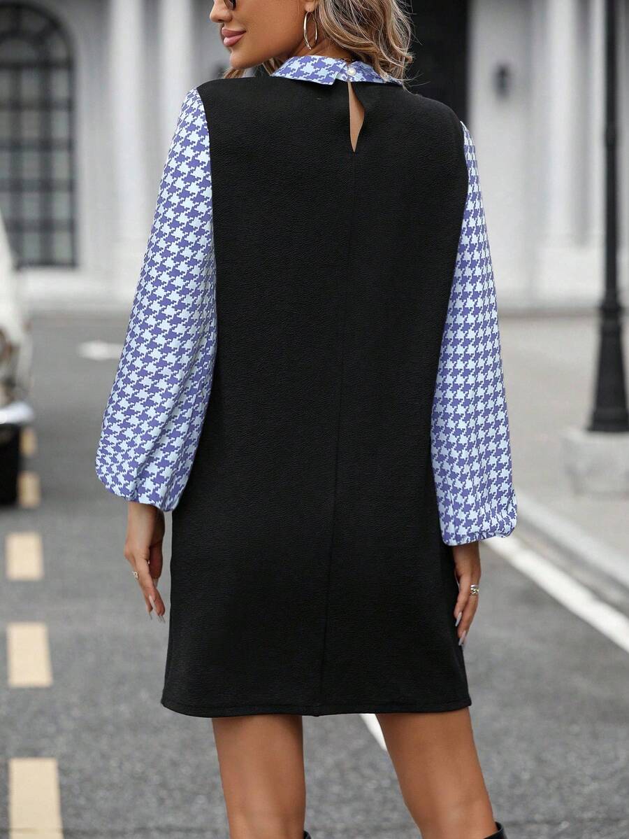 2 in 1 Vestito con stampa pied de poule manica a lanterna