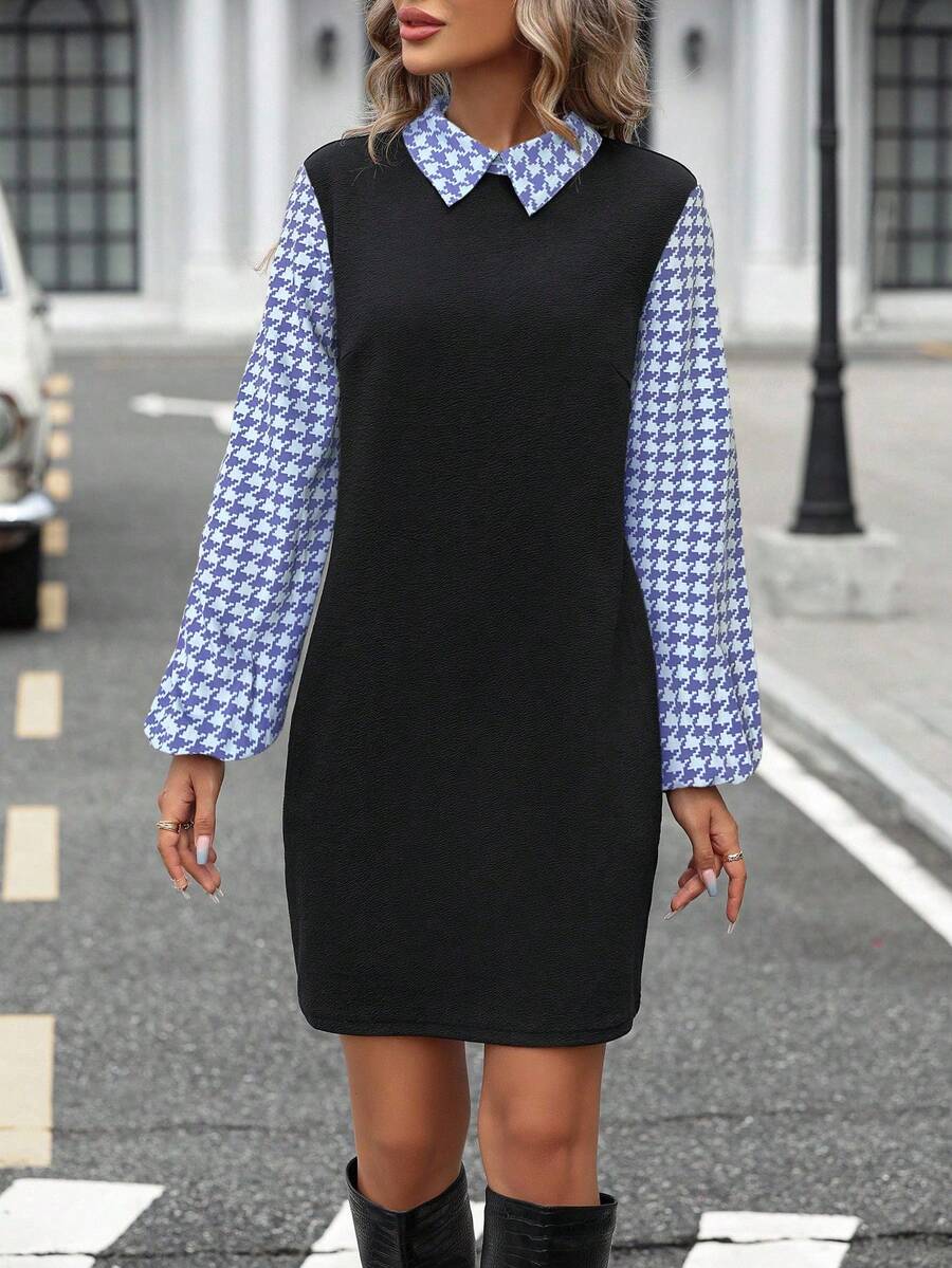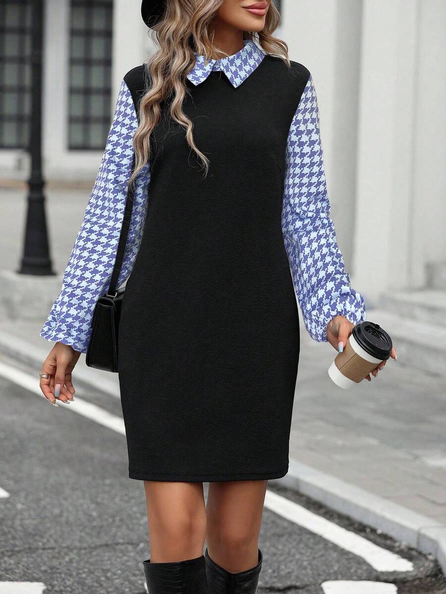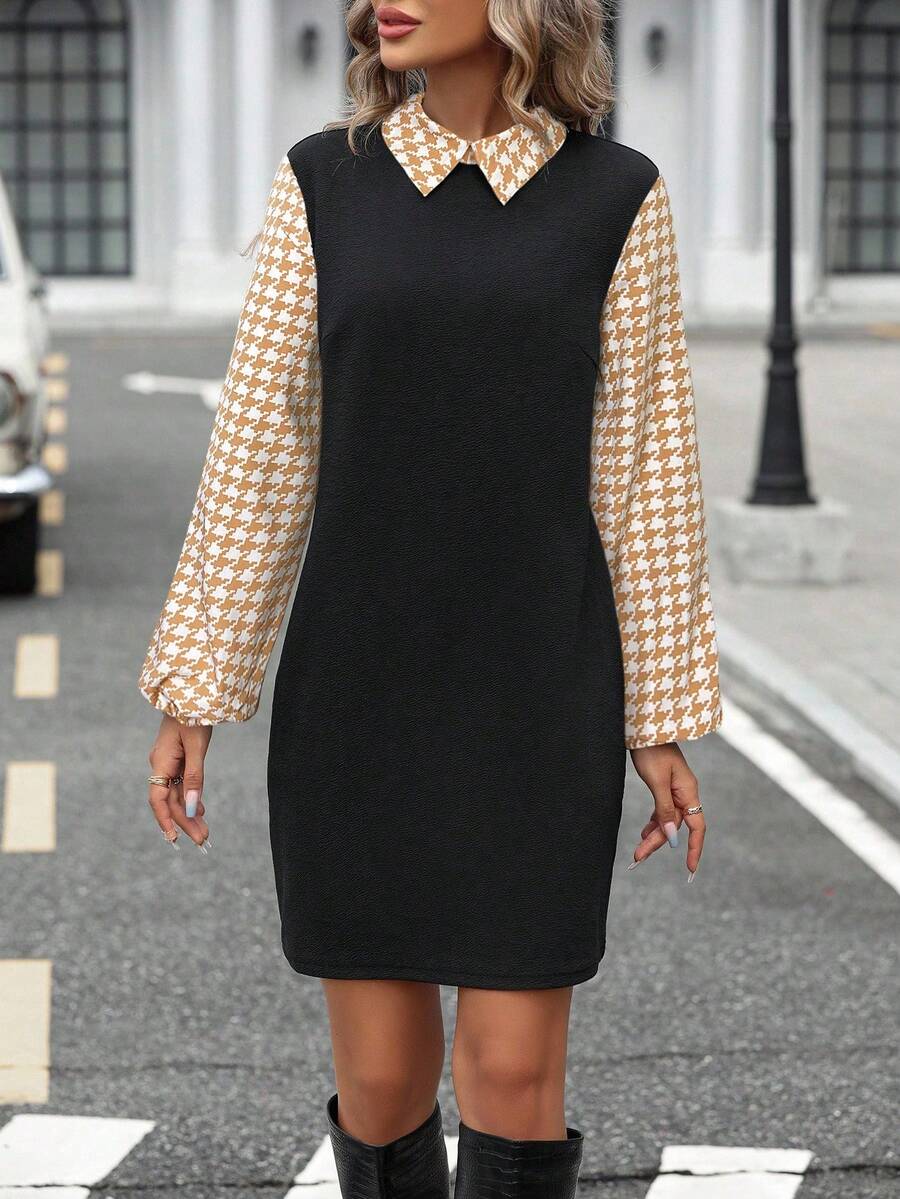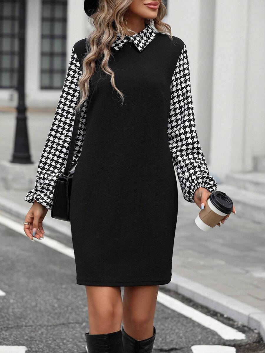 2 in 1 Vestito con stampa pied de poule manica a lanterna
