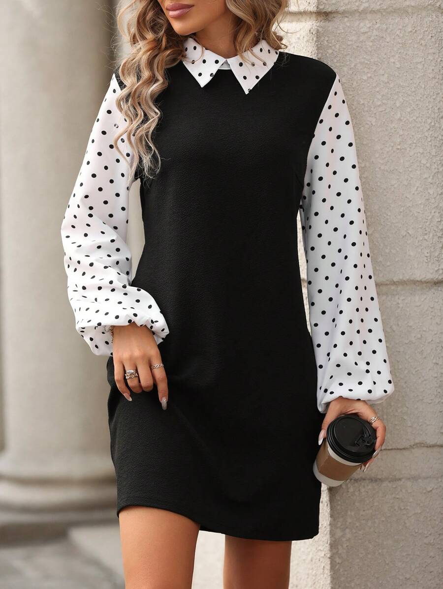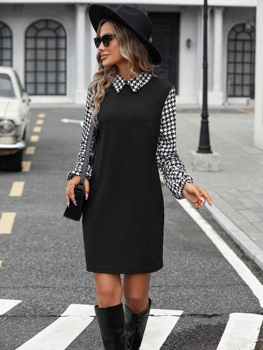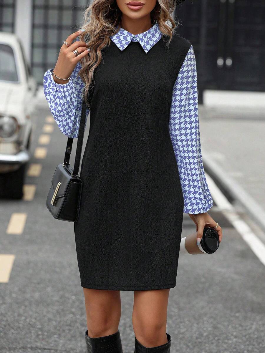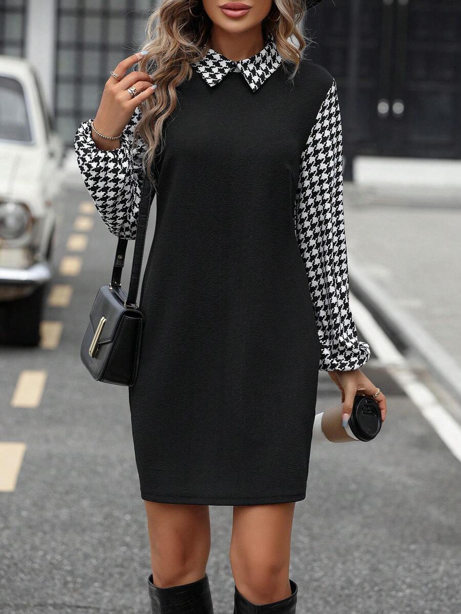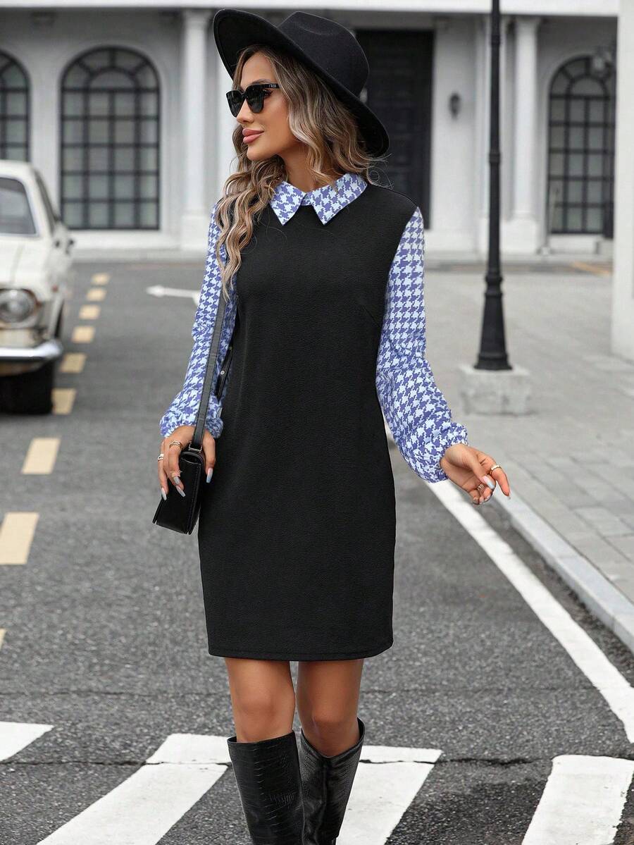 2 in 1 Vestito con stampa pied de poule manica a lanterna