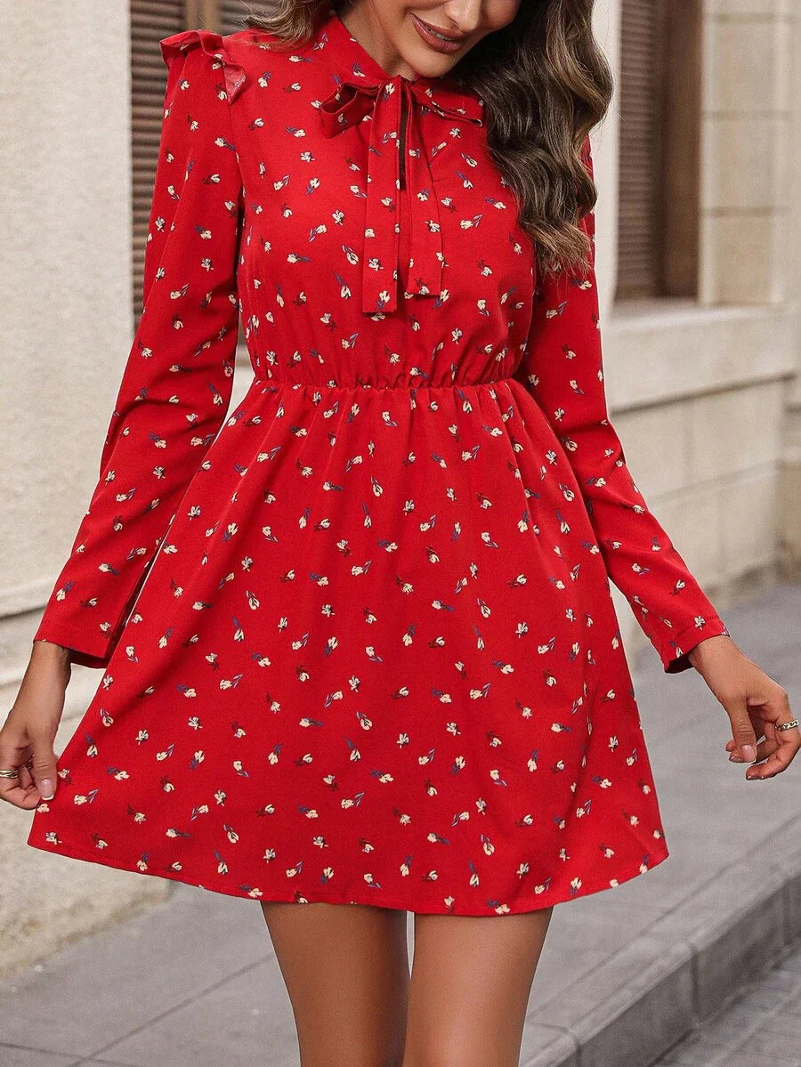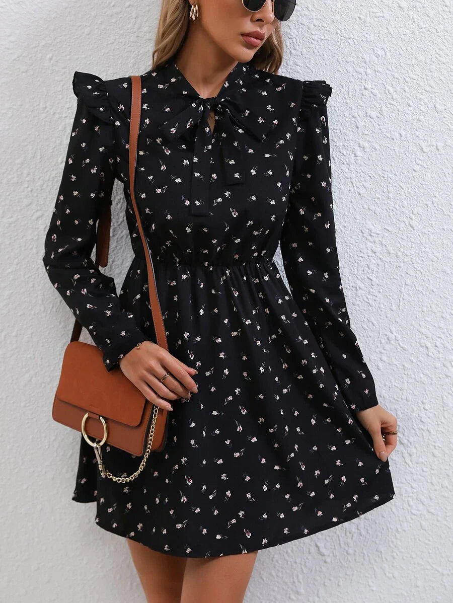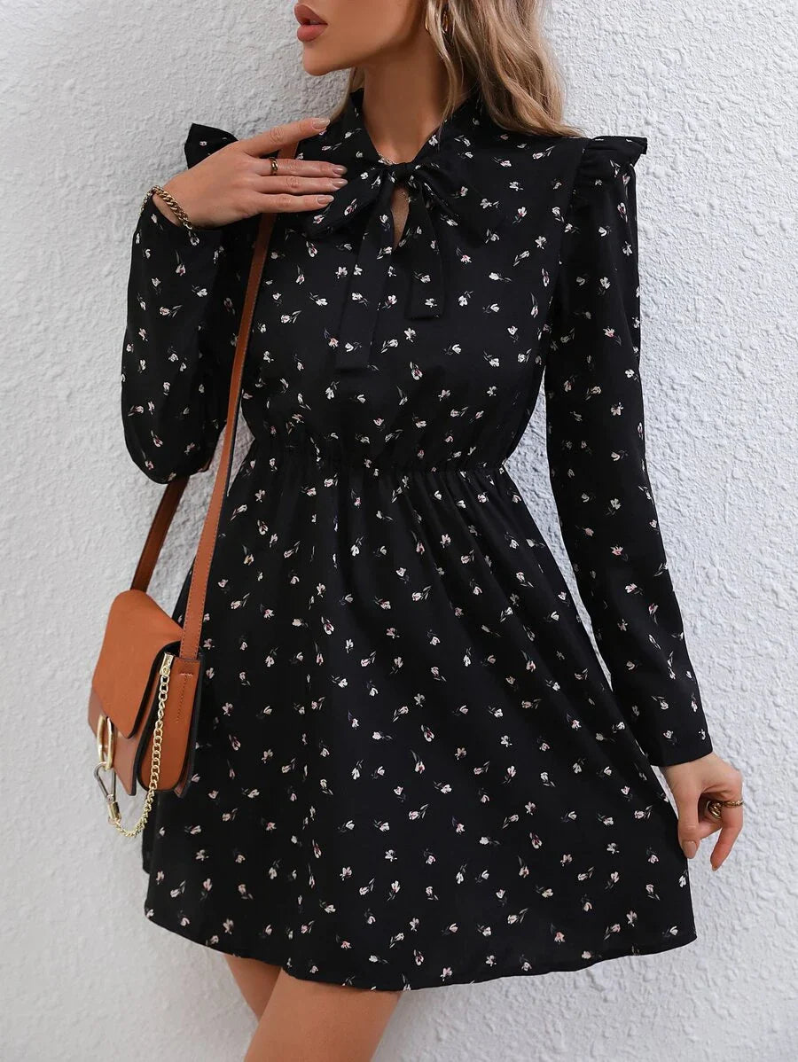 Abiti con stampa fiorellini con cravatta al collo con bordo a volant