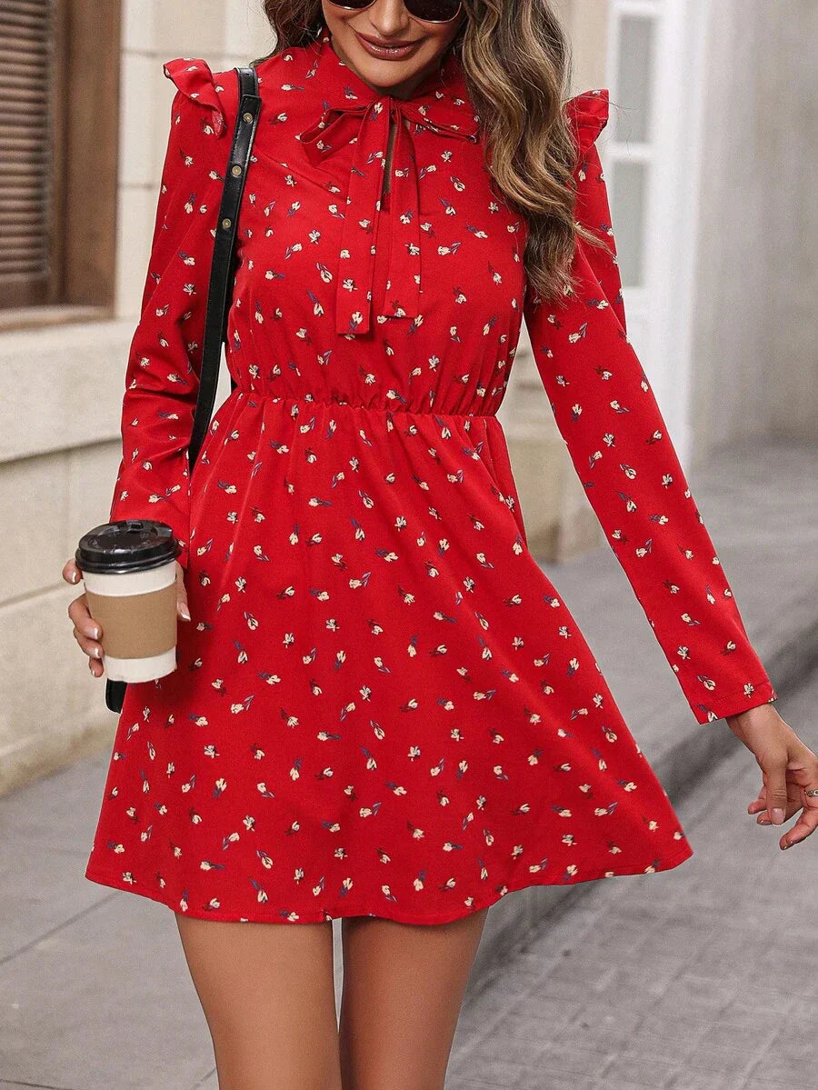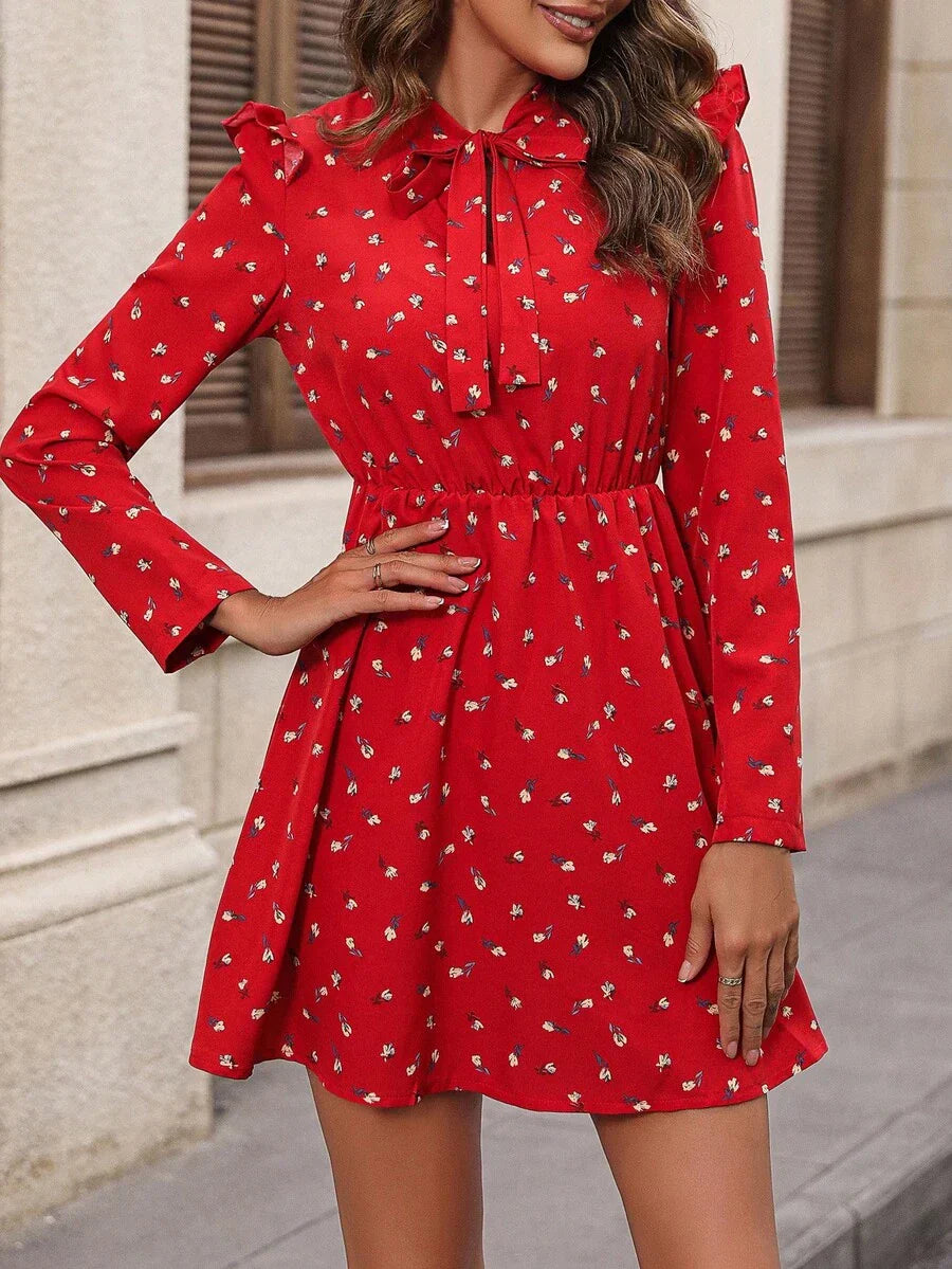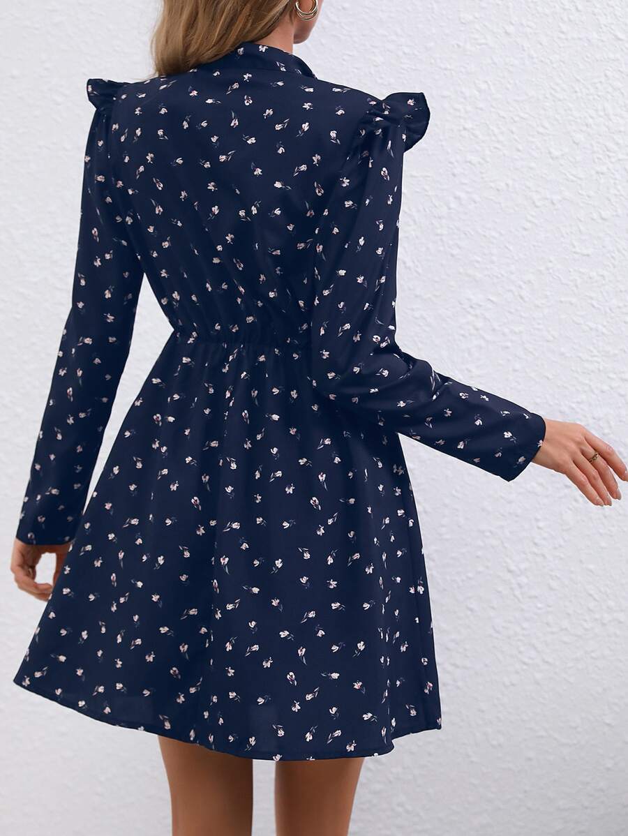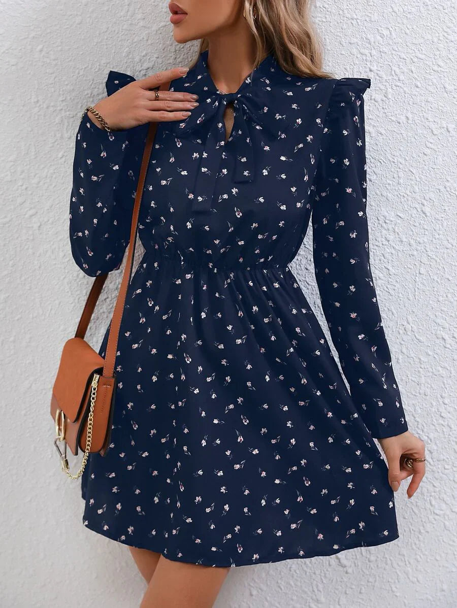 Abiti con stampa fiorellini con cravatta al collo con bordo a volant