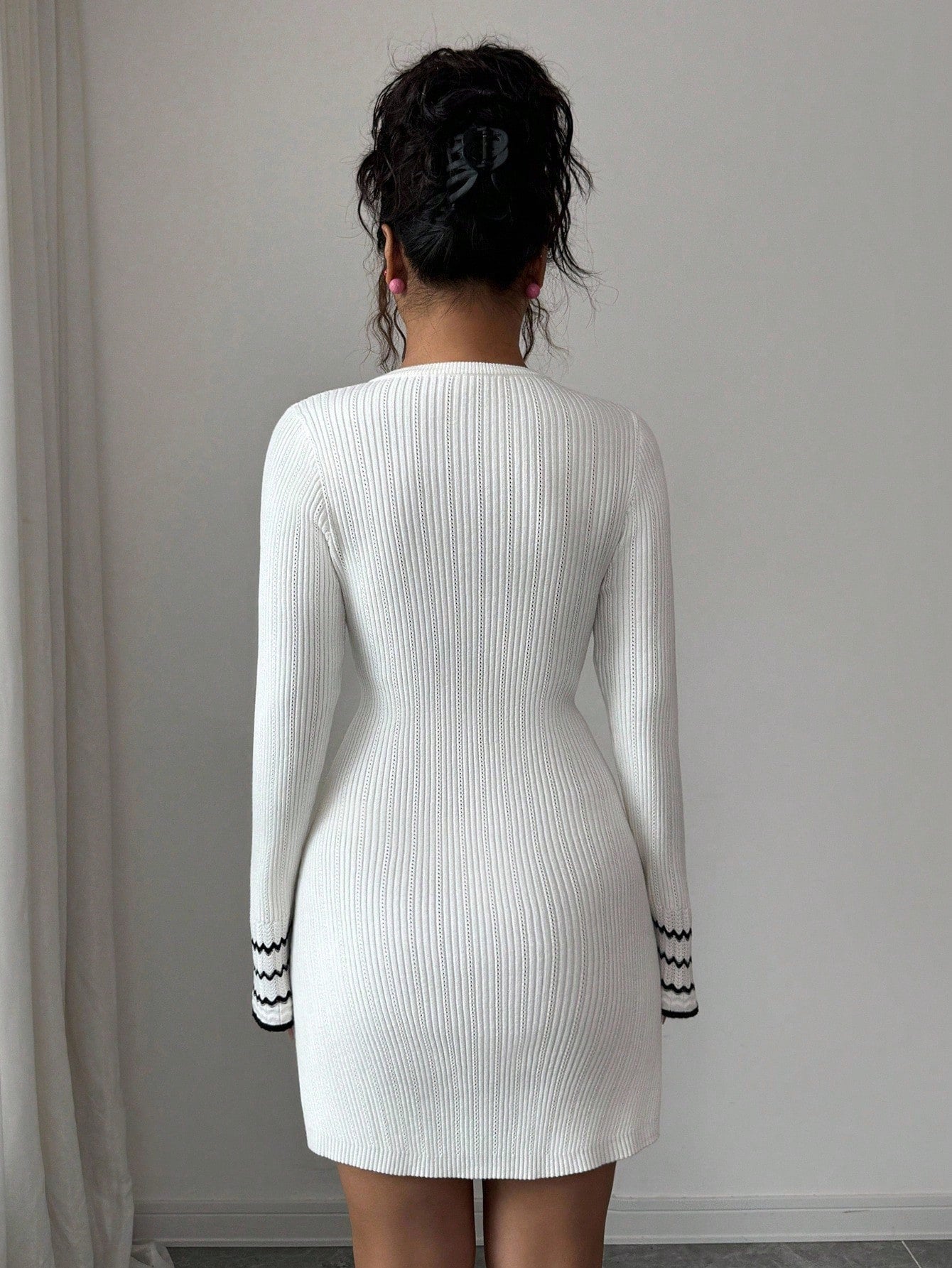 Abito a maglia a maniche a campana con scollo tondo, bottoni, righe, orlo con volant a contrasto e linea ad A per le donne