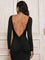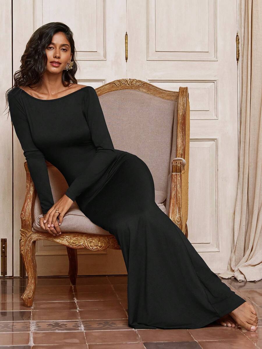 Abito aderente di colore unito, con scollo tondo, maniche lunghe, schiena scoperta e drappeggiato