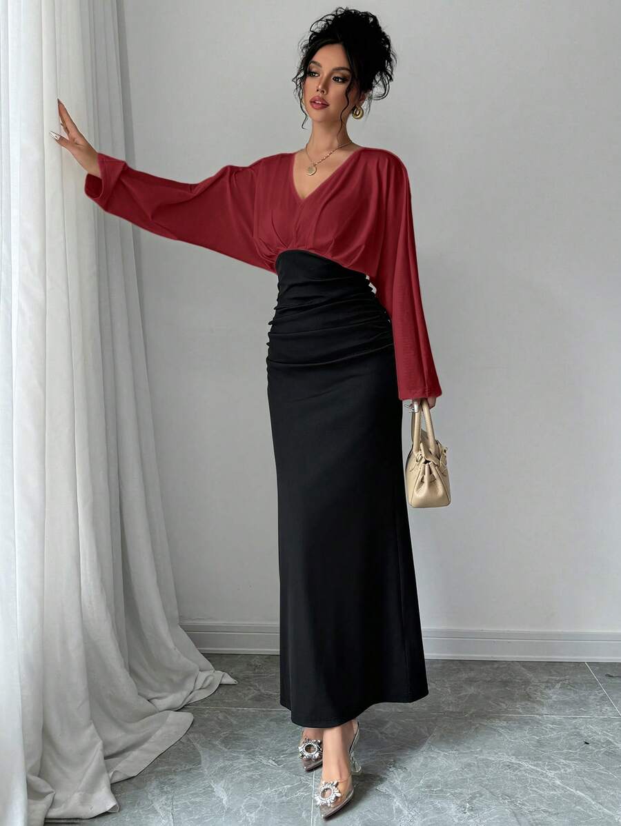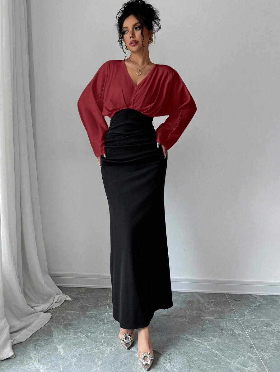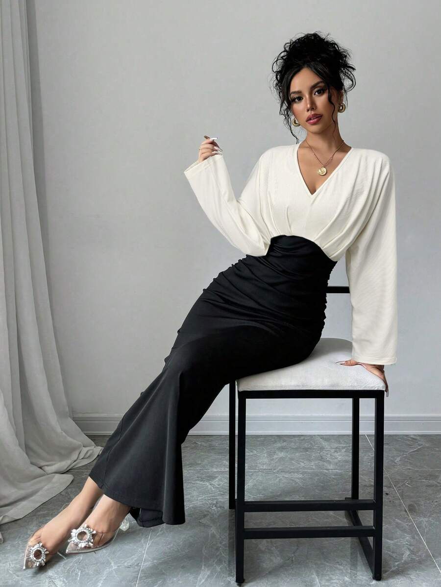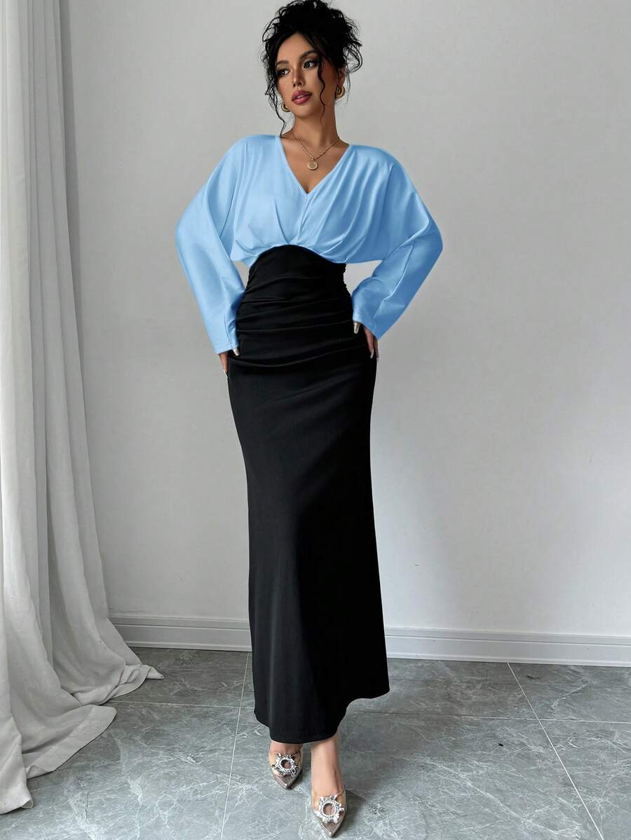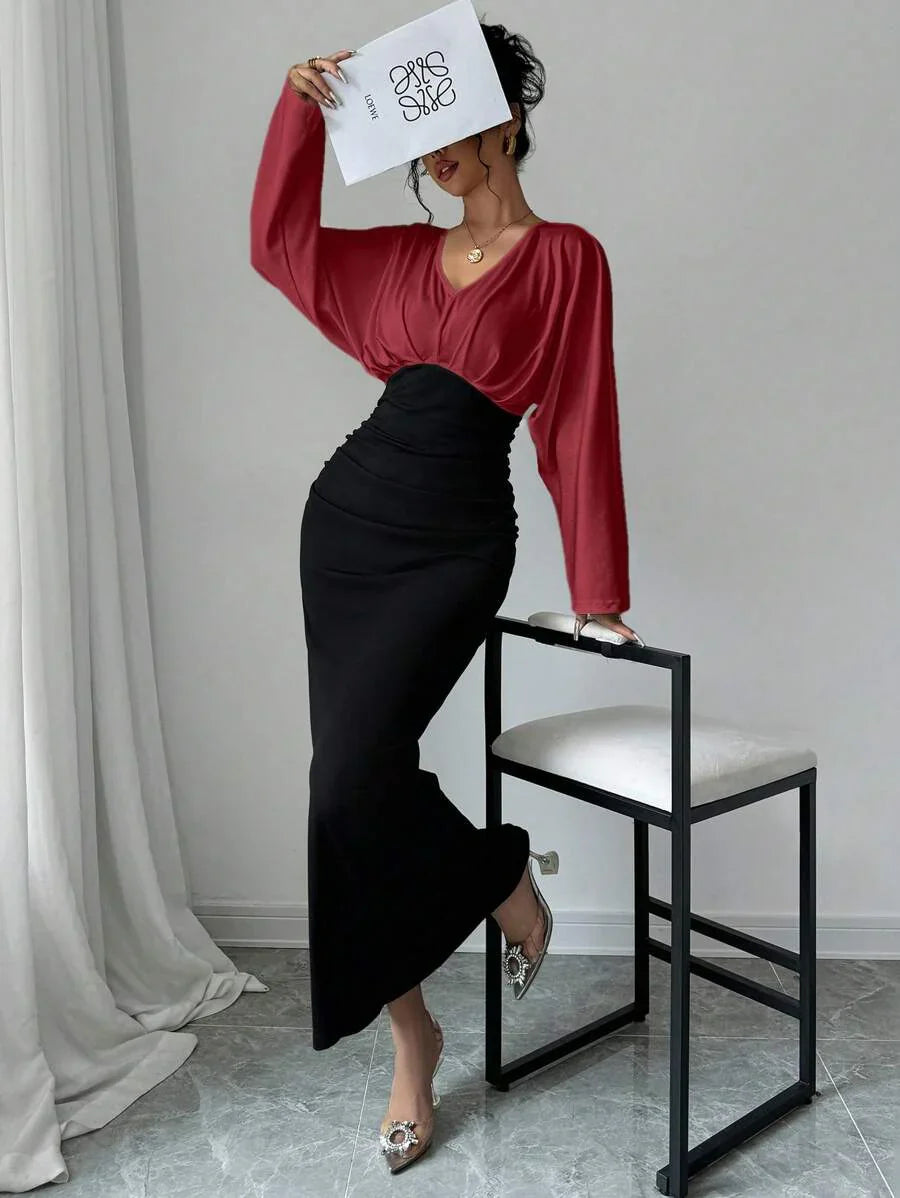 Abito attillato da donna con scollo a V, maniche pipistrello e blocchi di colore