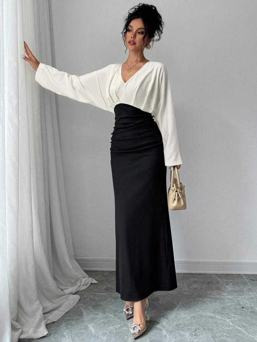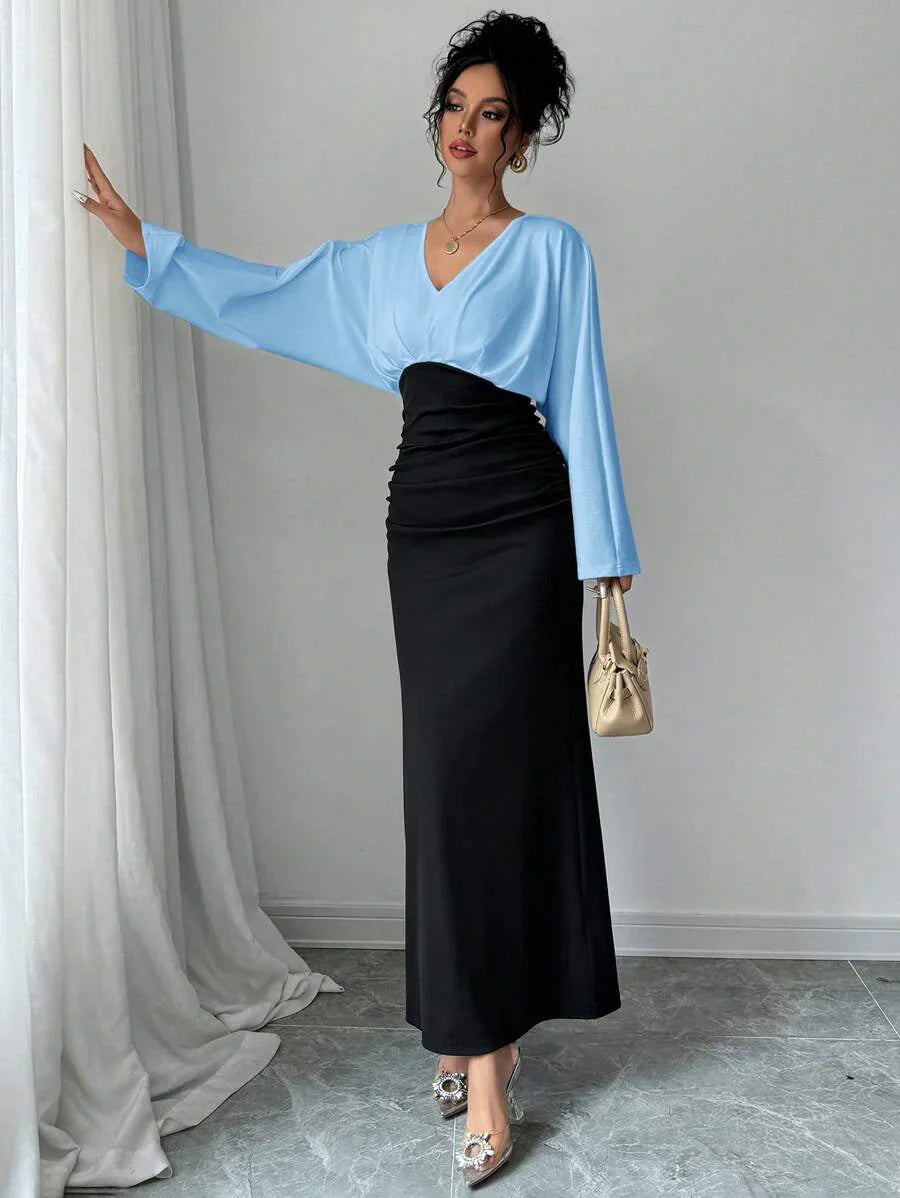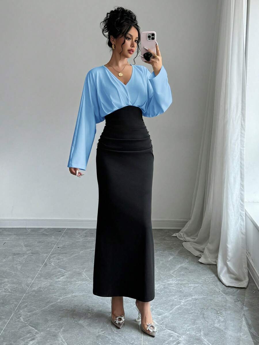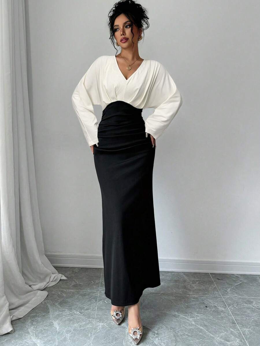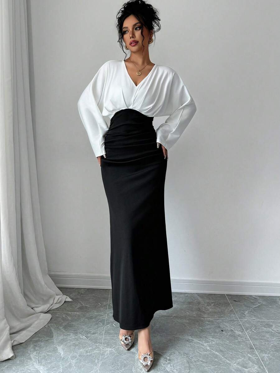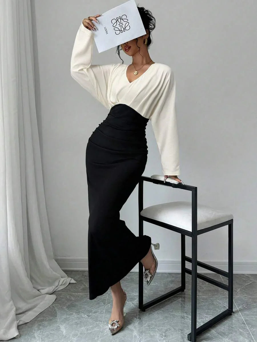 Abito attillato da donna con scollo a V, maniche pipistrello e blocchi di colore