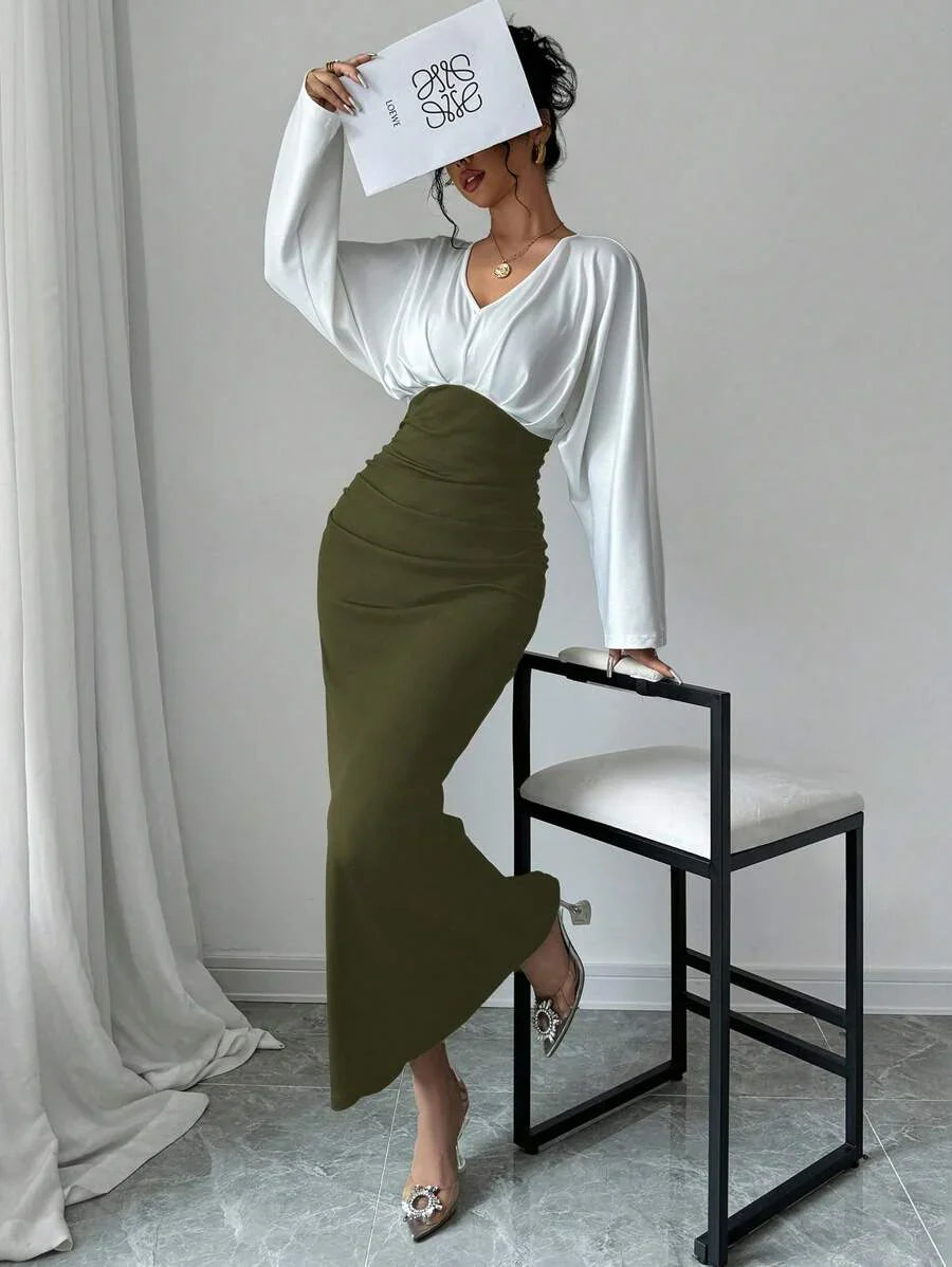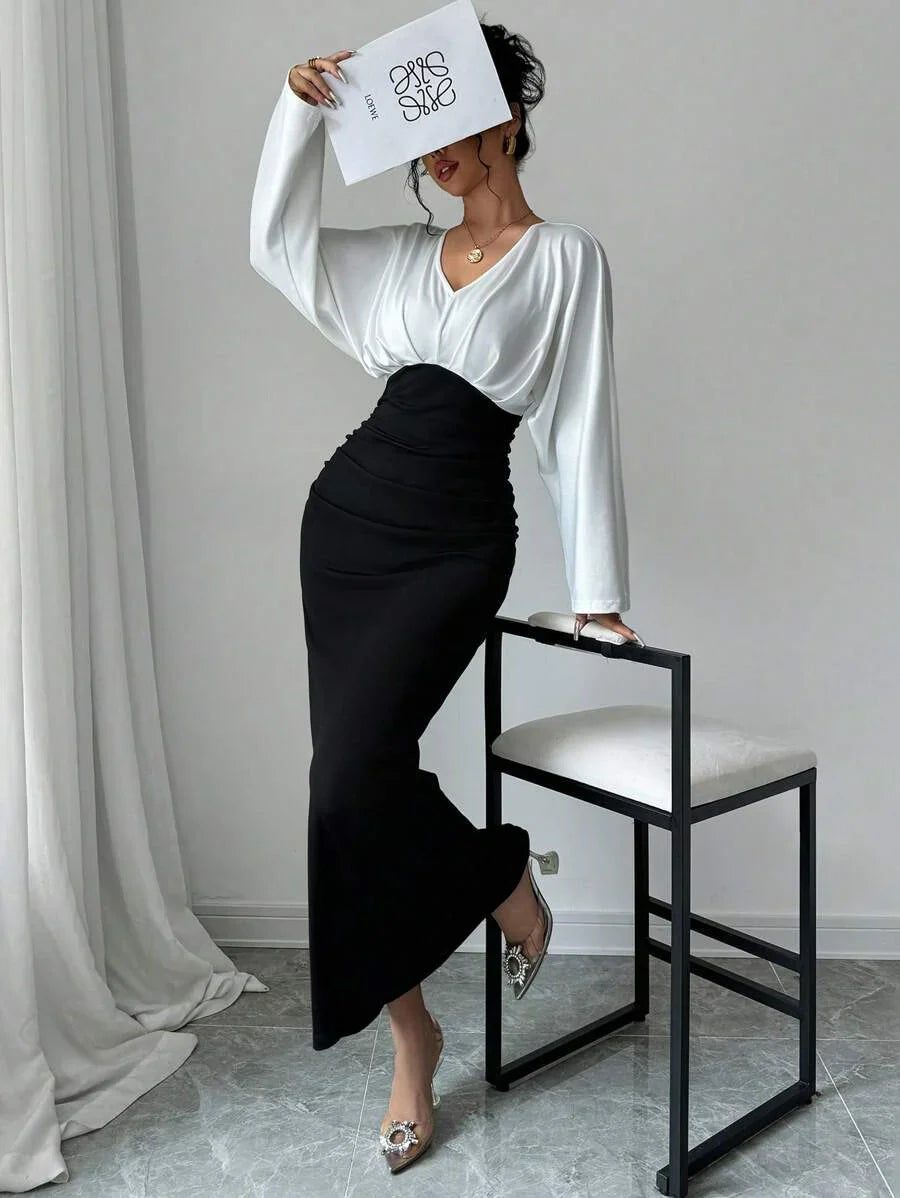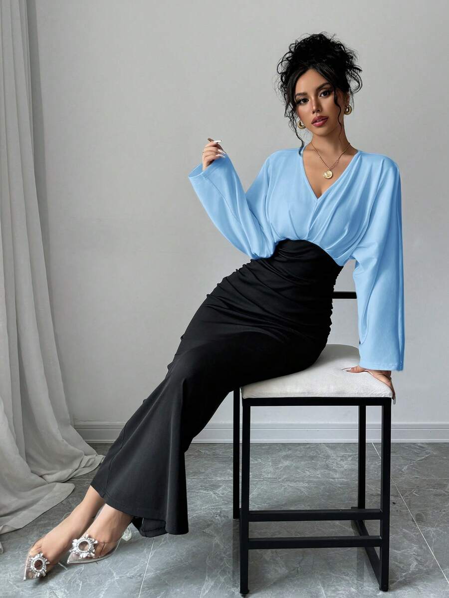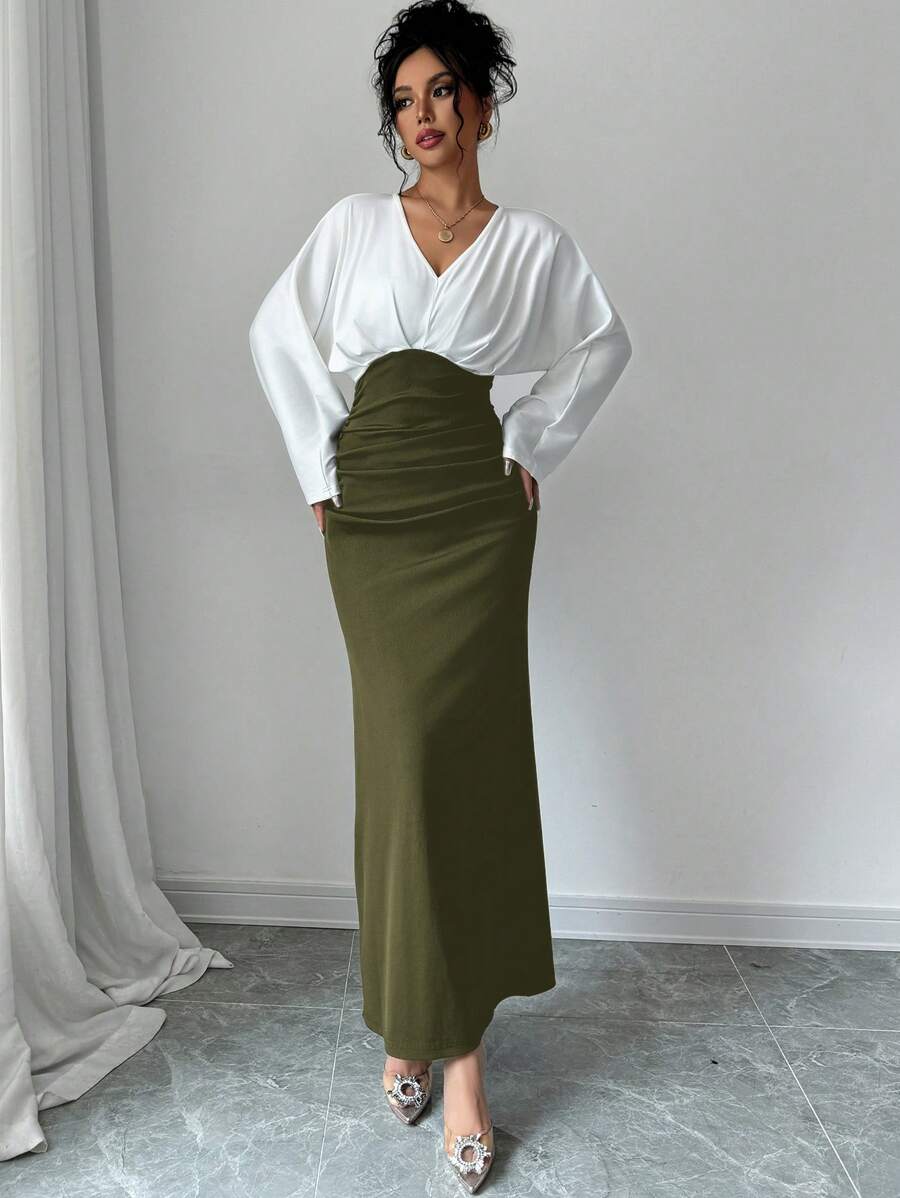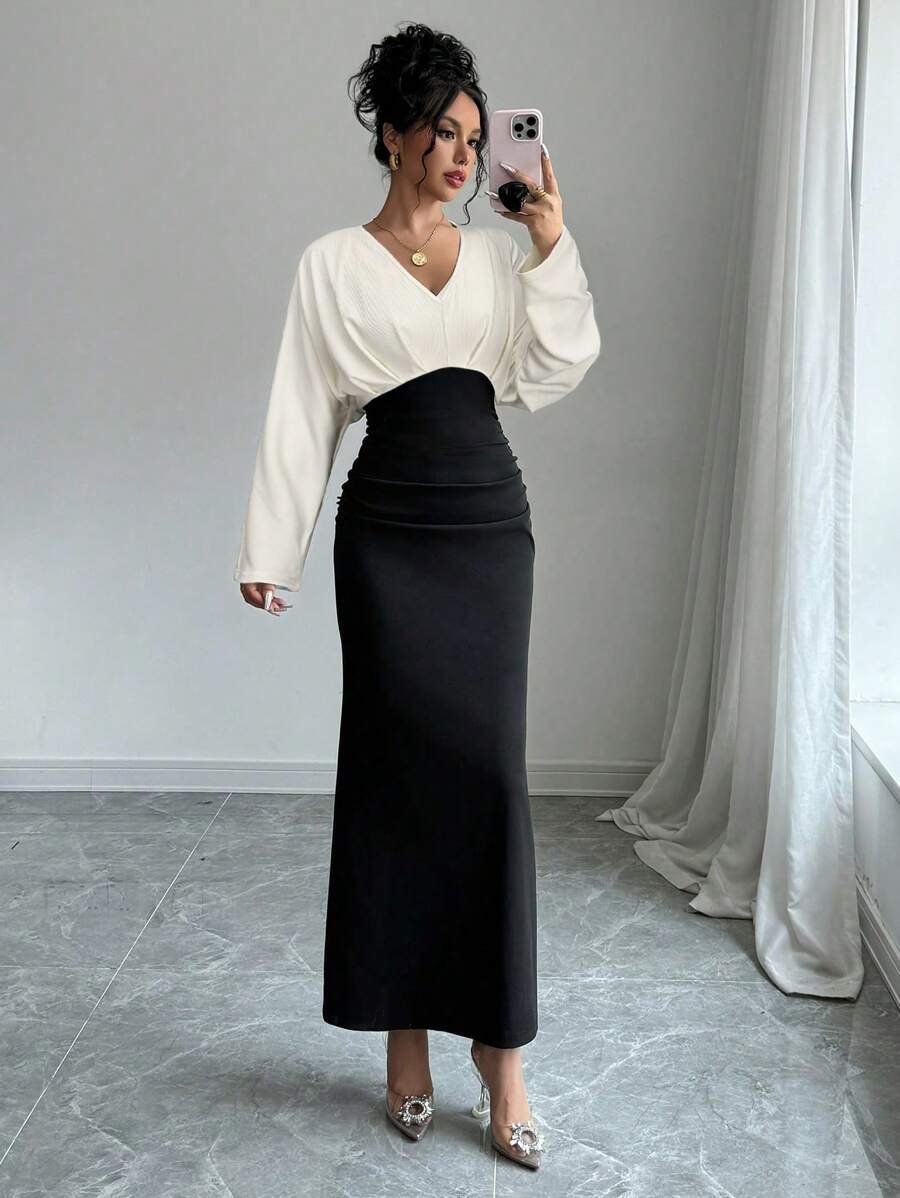Abito attillato da donna con scollo a V, maniche pipistrello e blocchi di colore