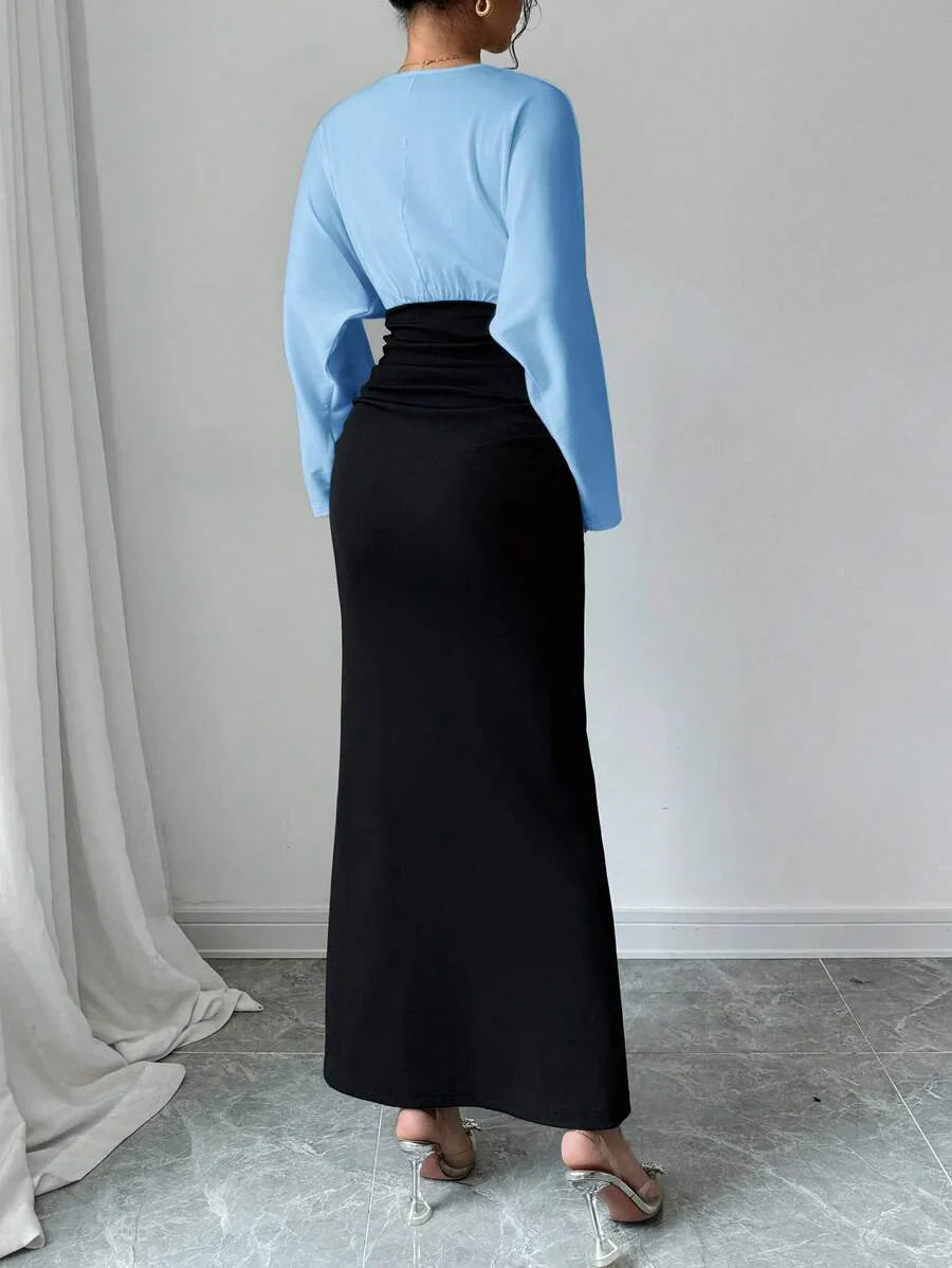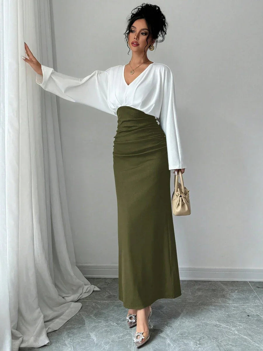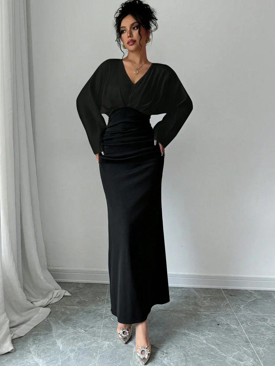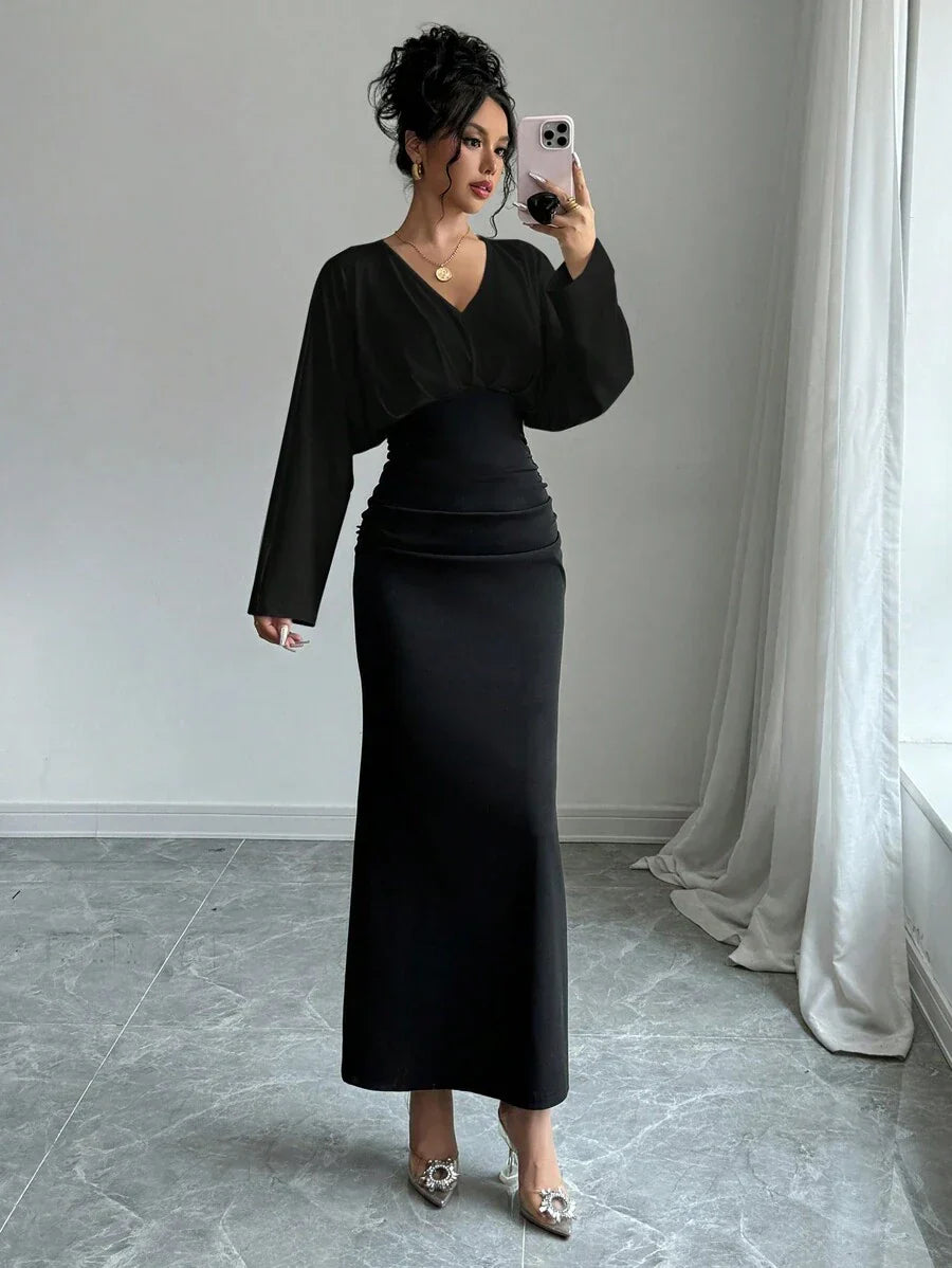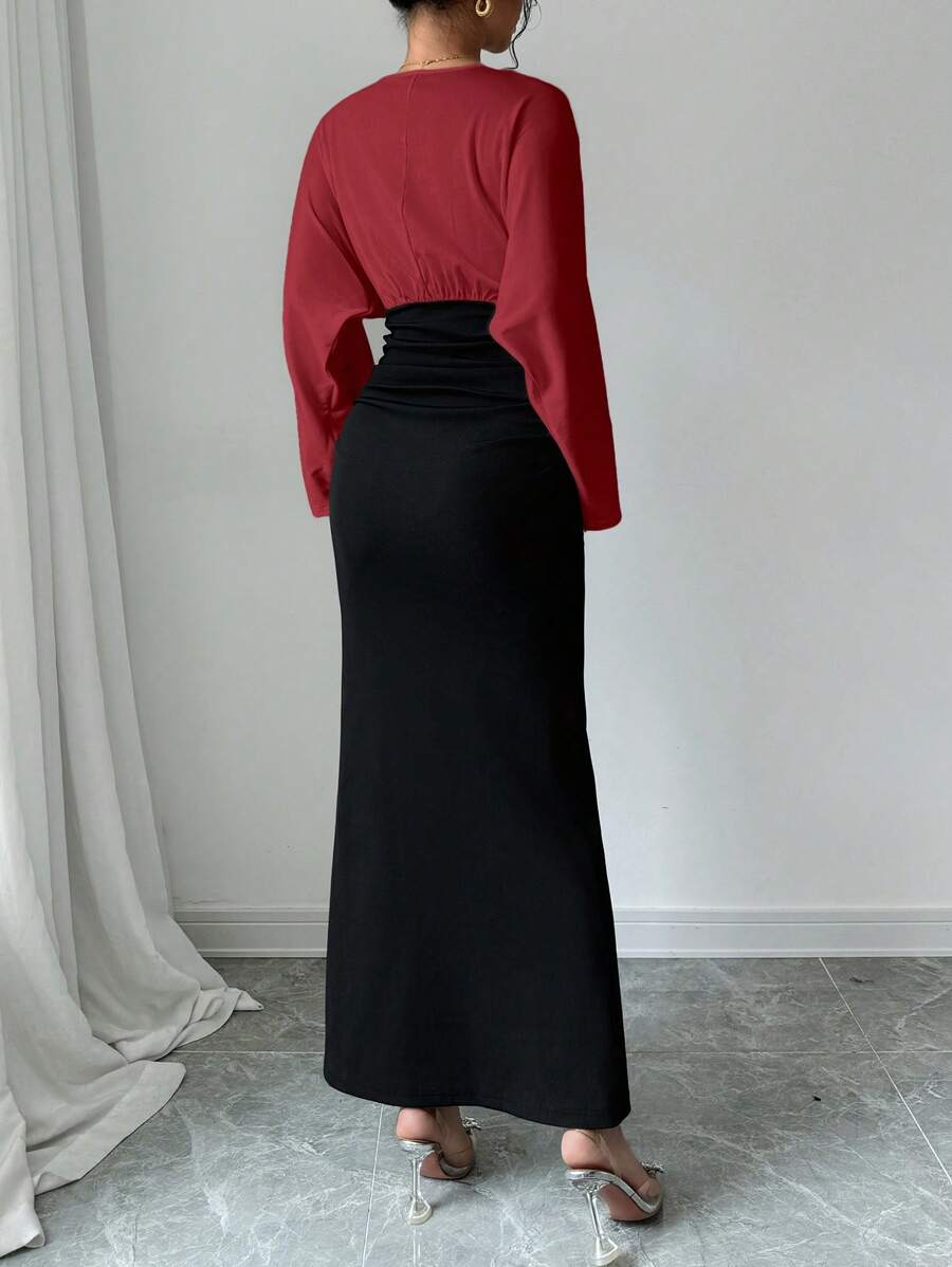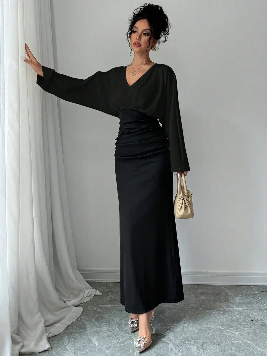 Abito attillato da donna con scollo a V, maniche pipistrello e blocchi di colore