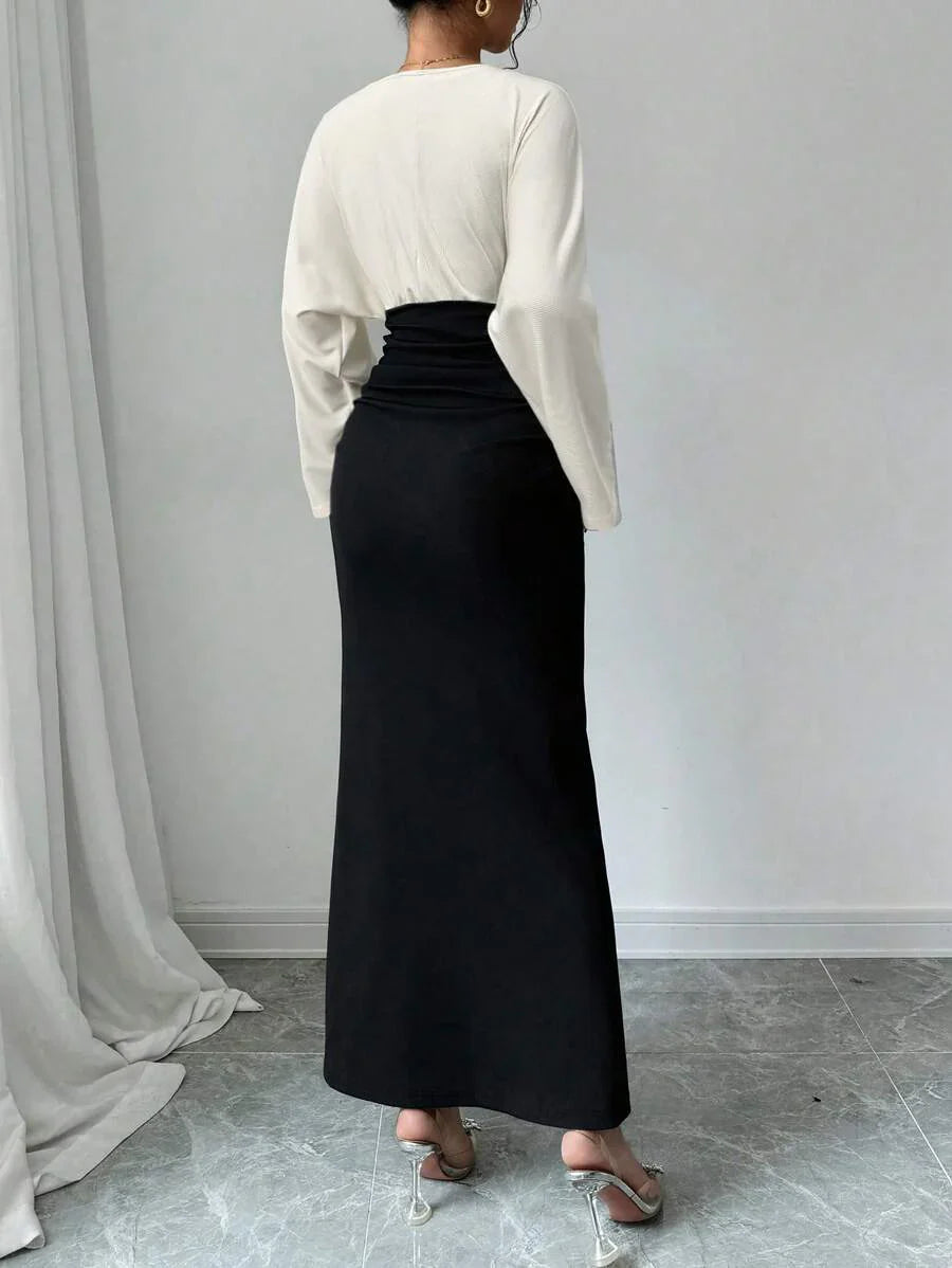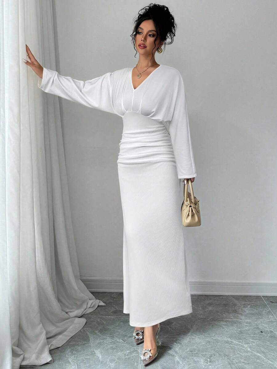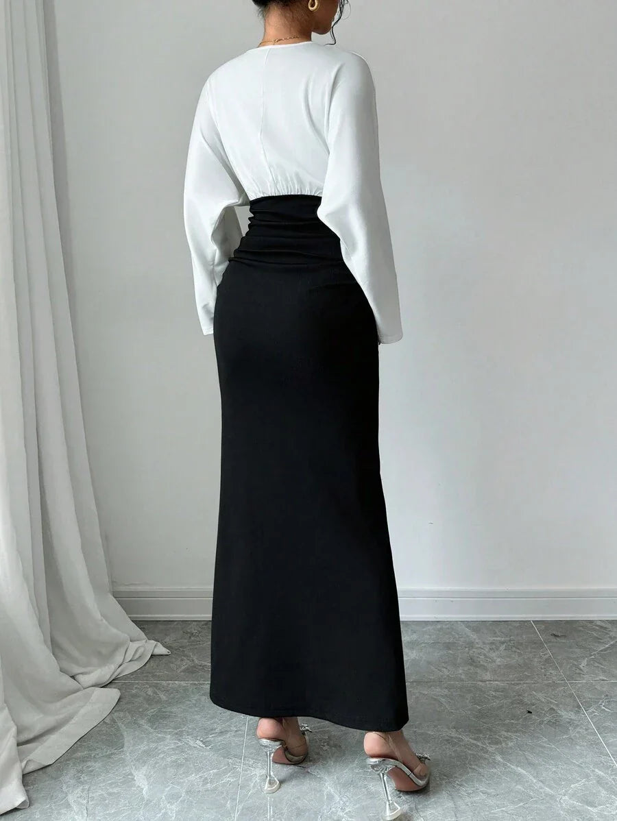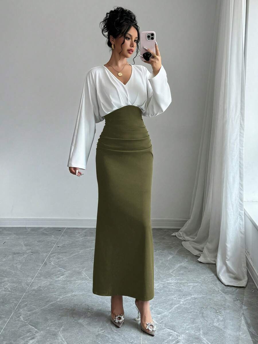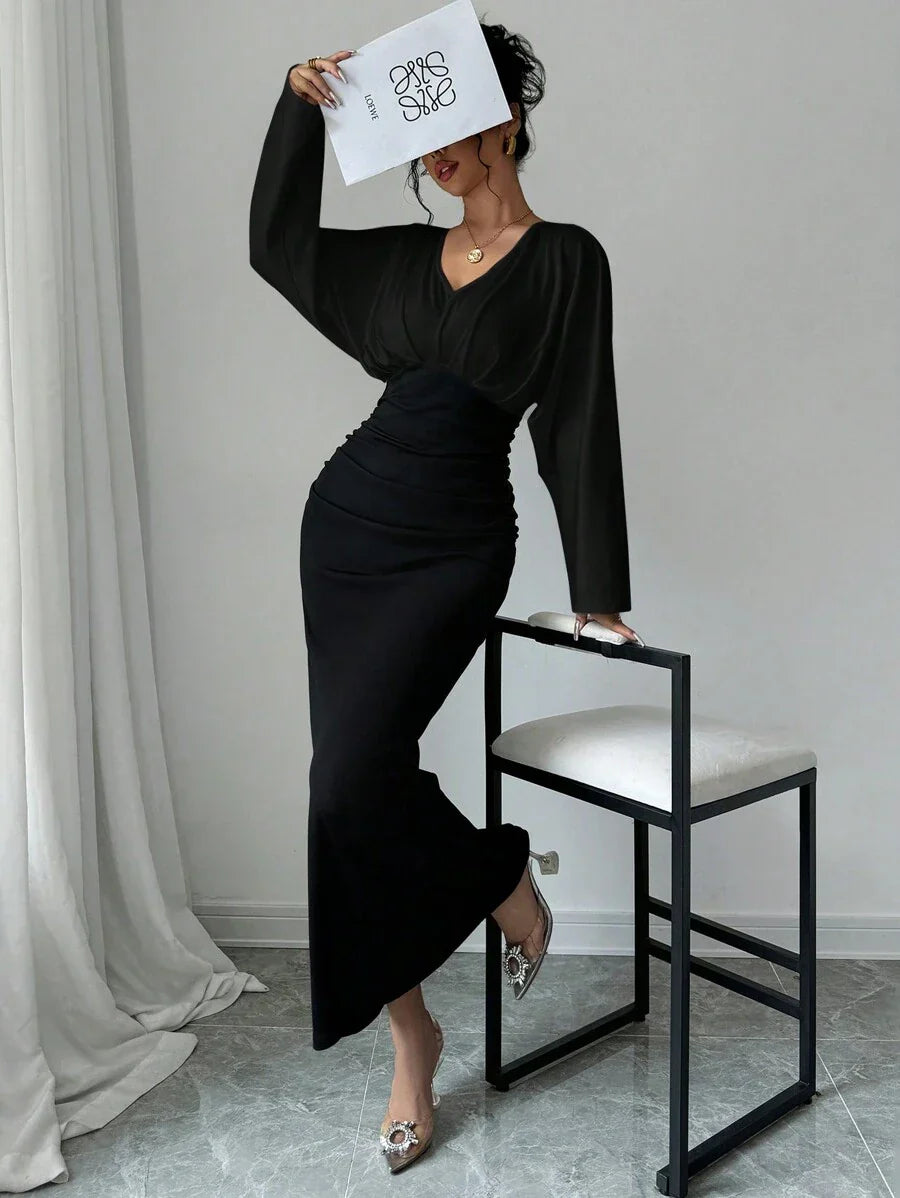 Abito attillato da donna con scollo a V, maniche pipistrello e blocchi di colore