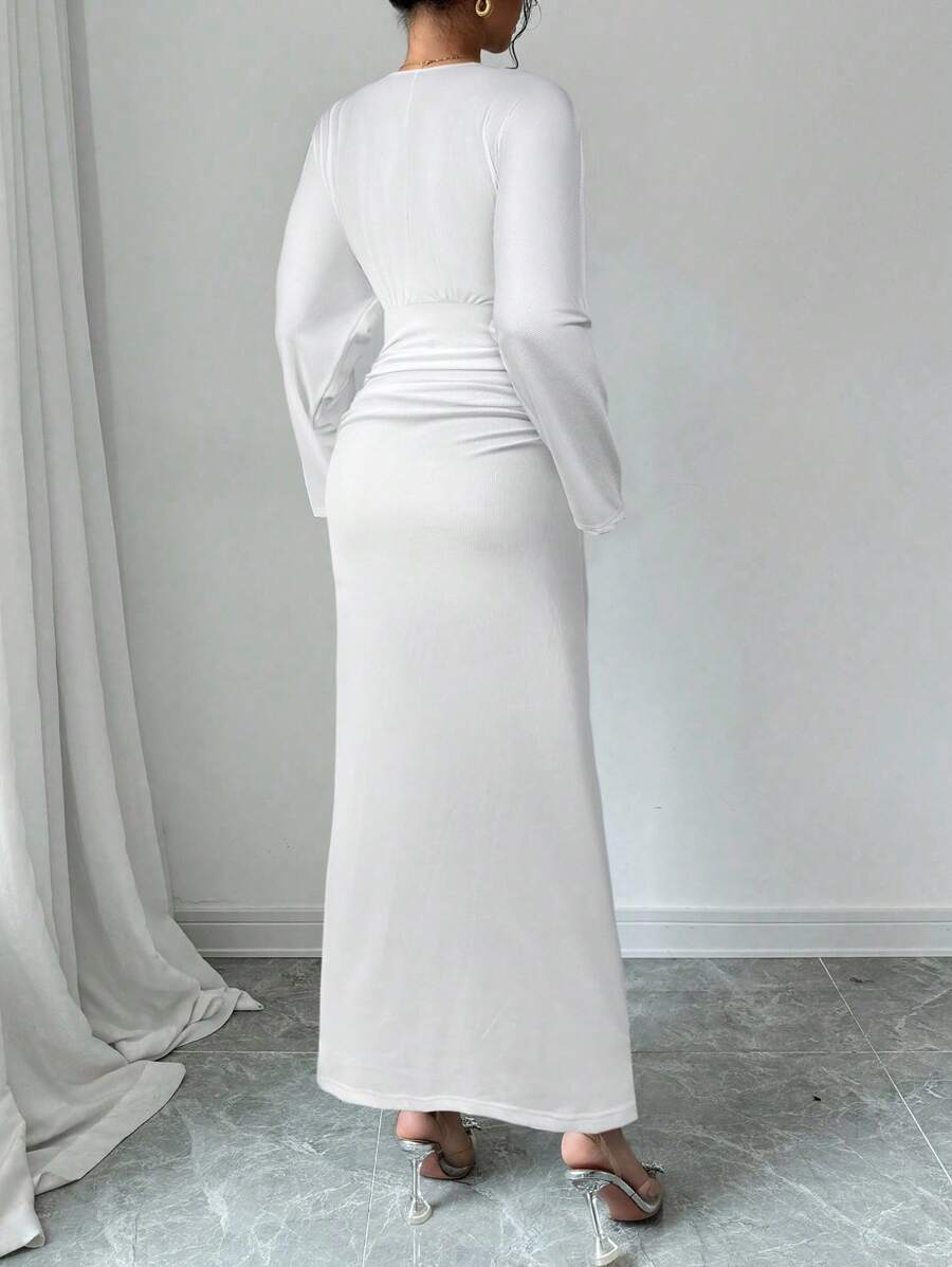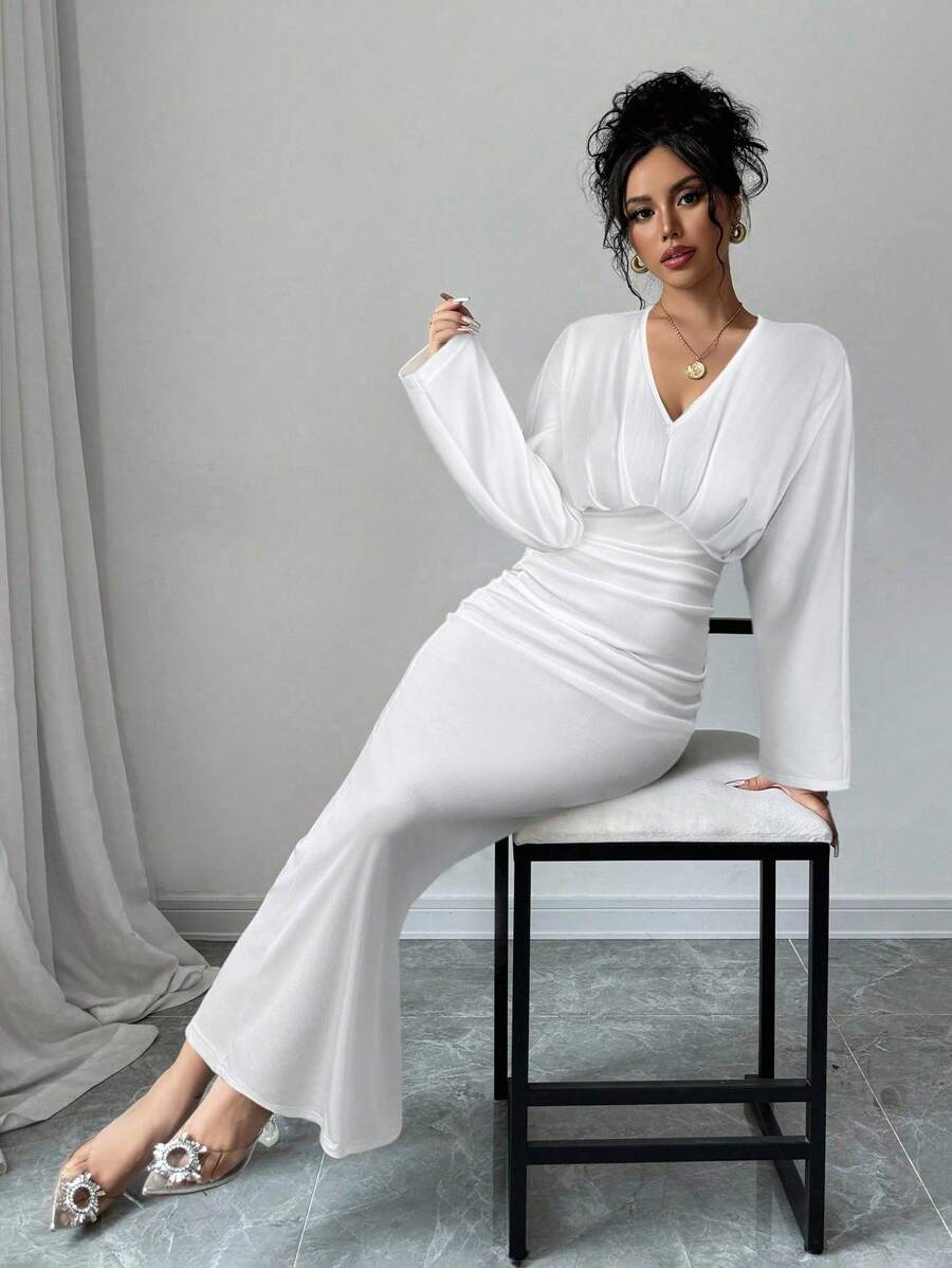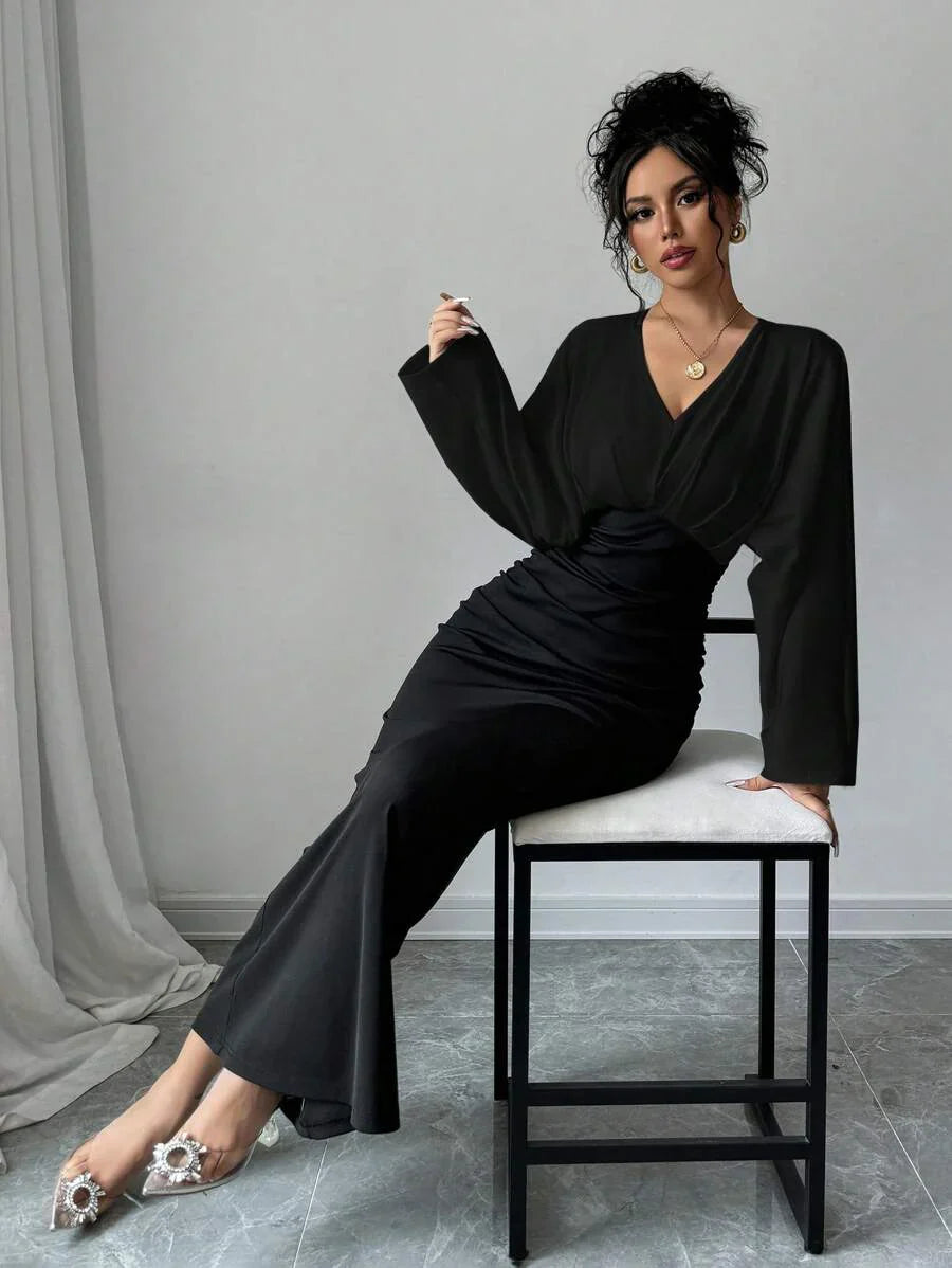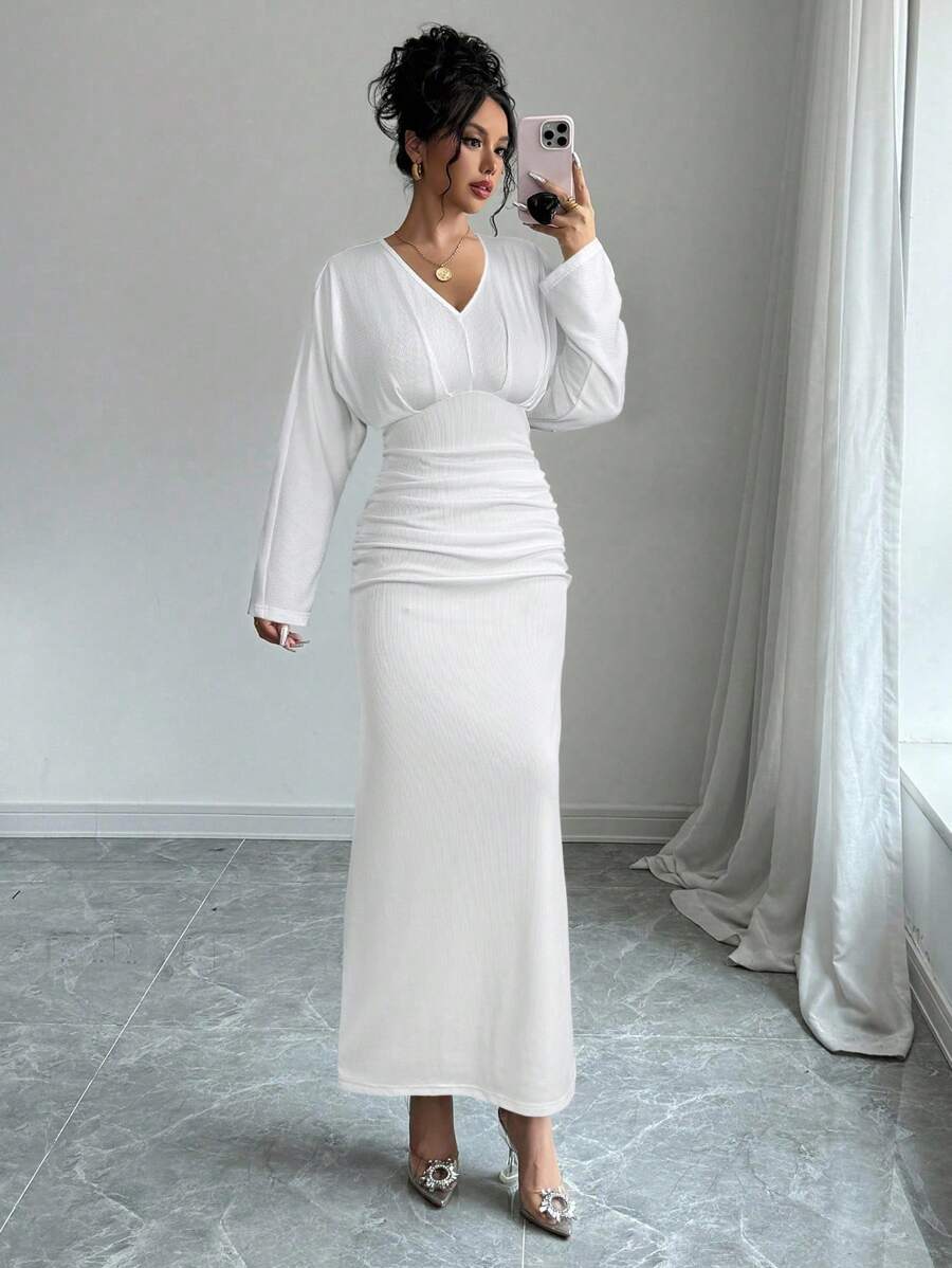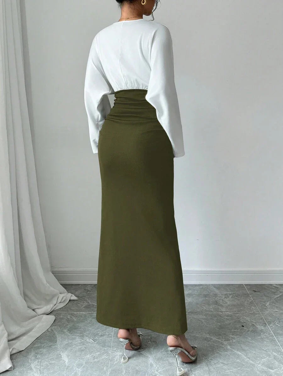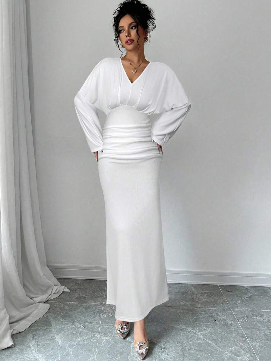 Abito attillato da donna con scollo a V, maniche pipistrello e blocchi di colore