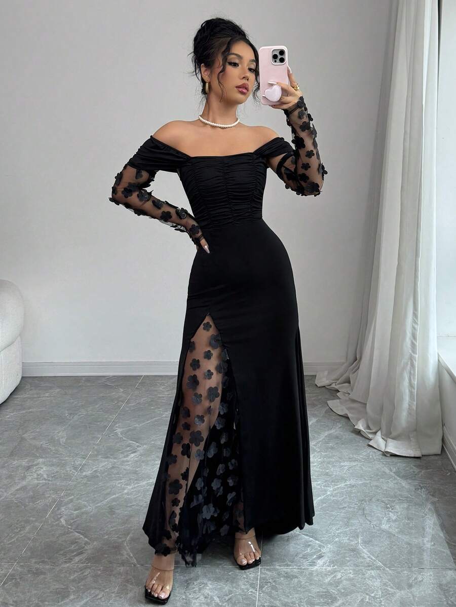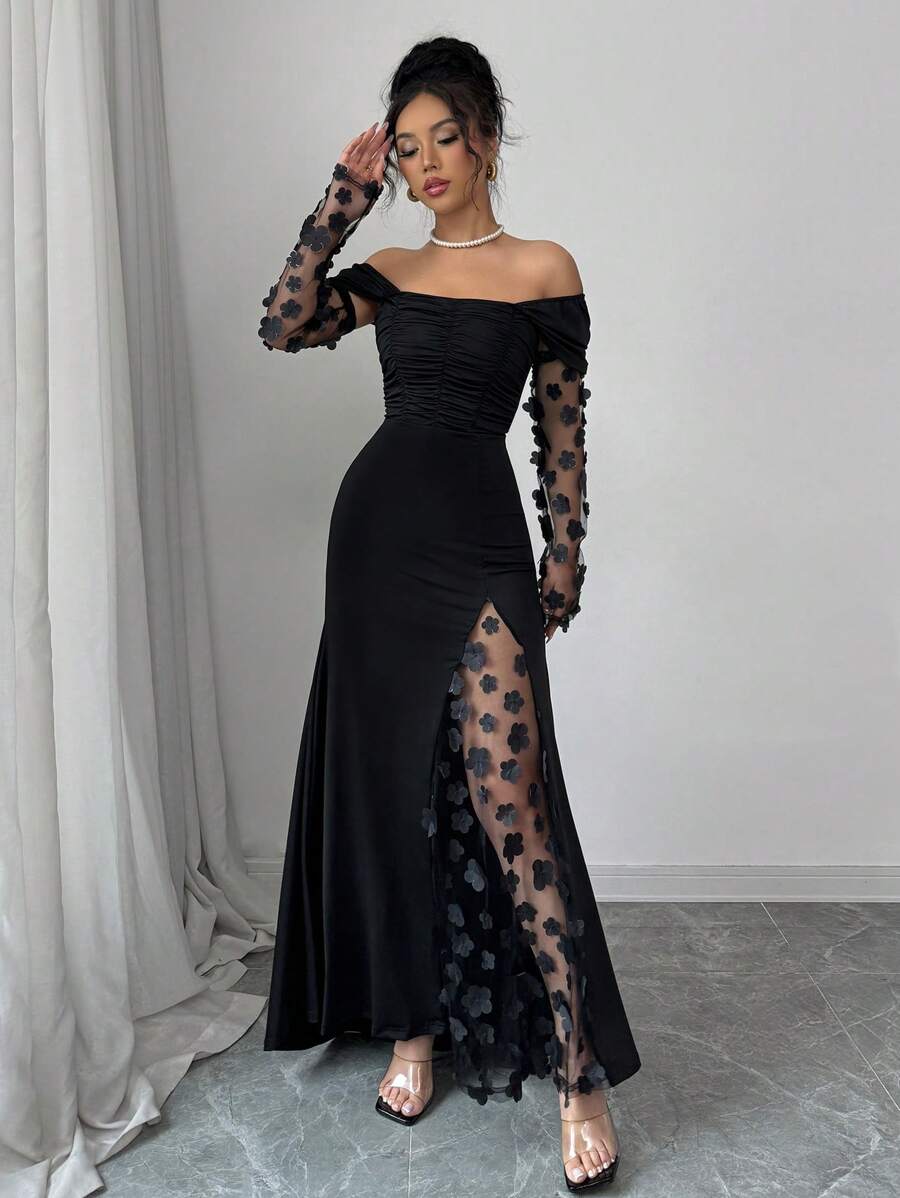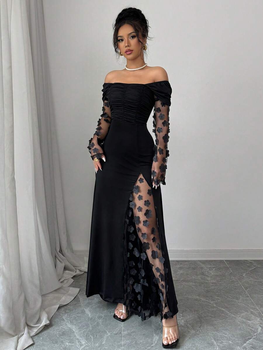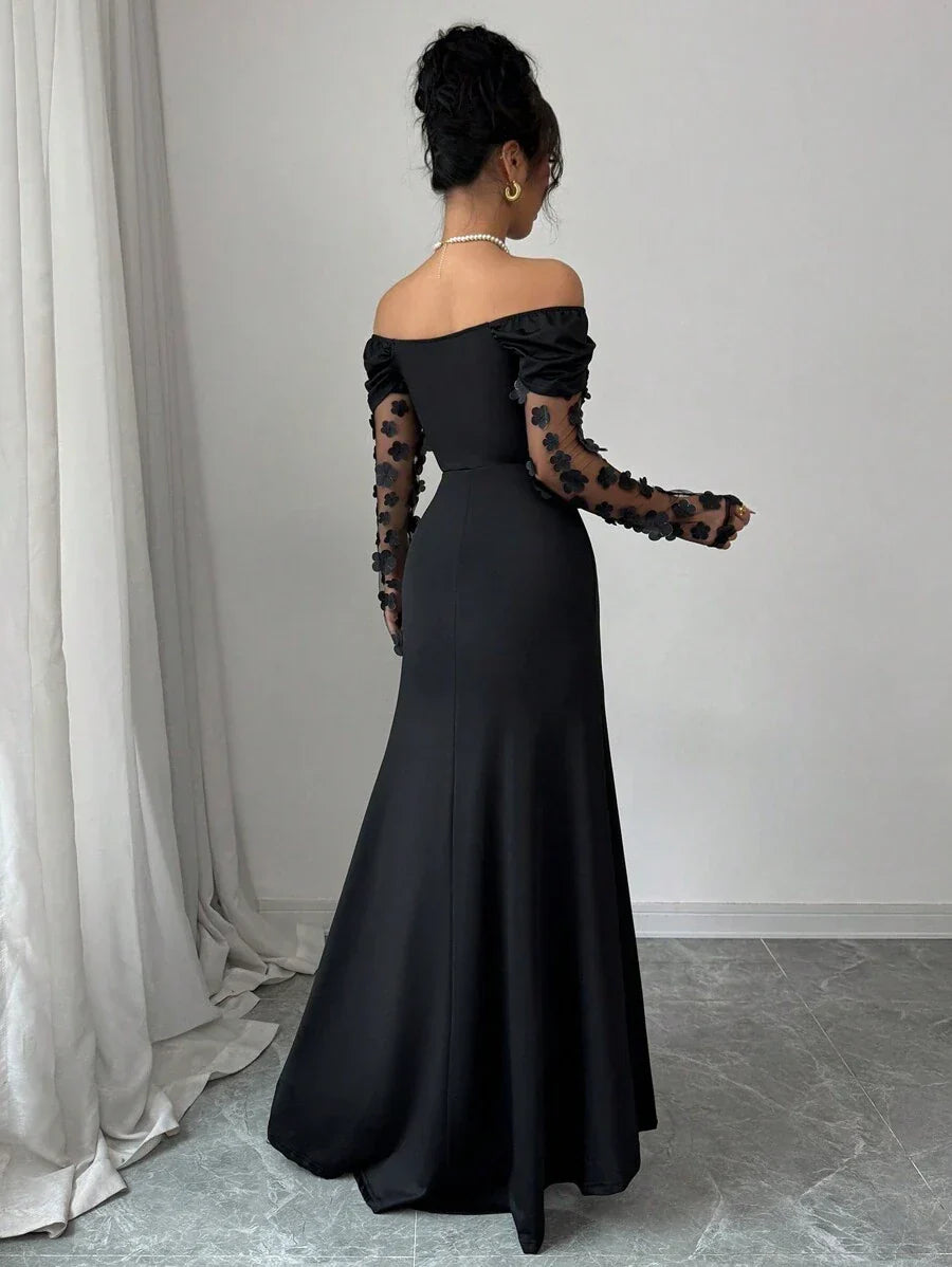 Abito elegante, romantico e di lusso da donna con fiori 3D sulle spalle scoperte