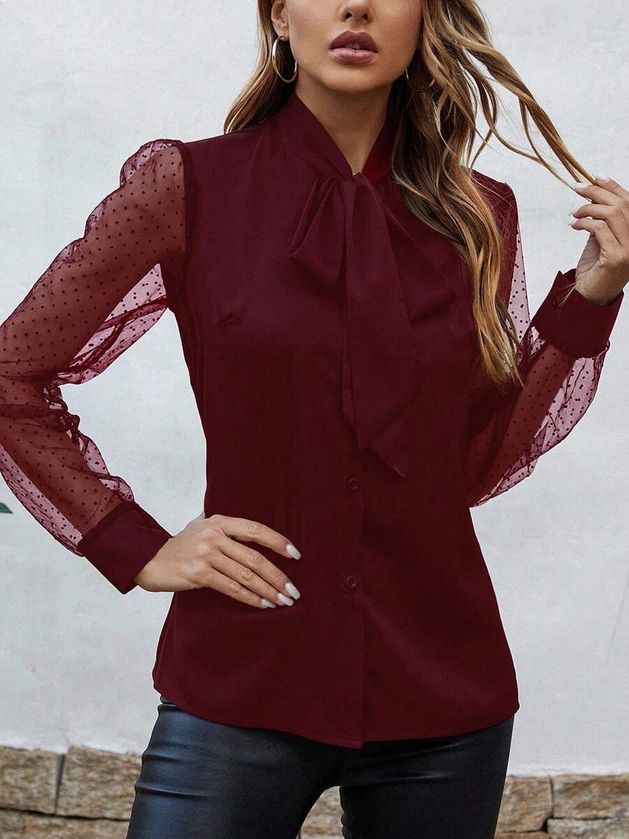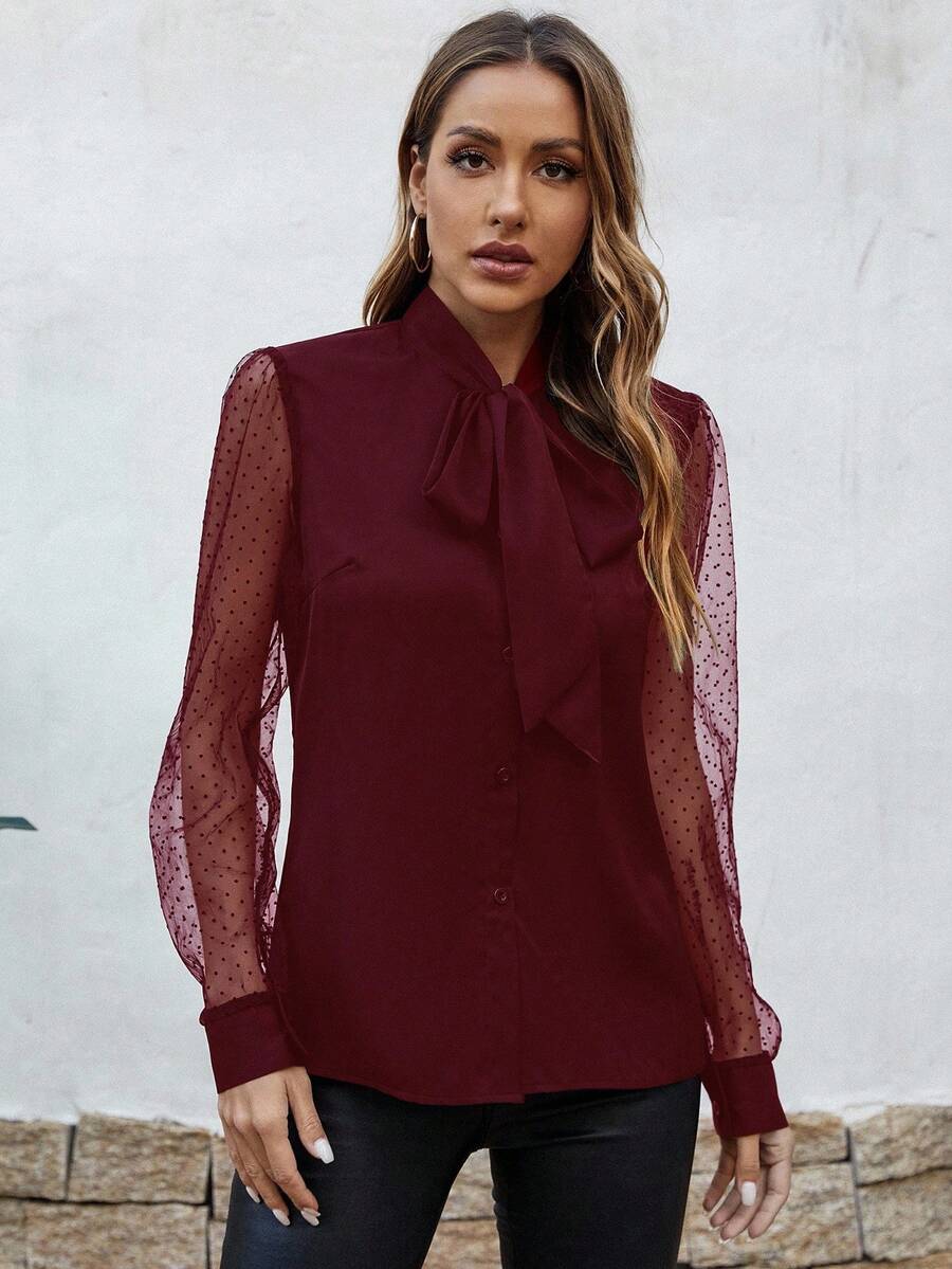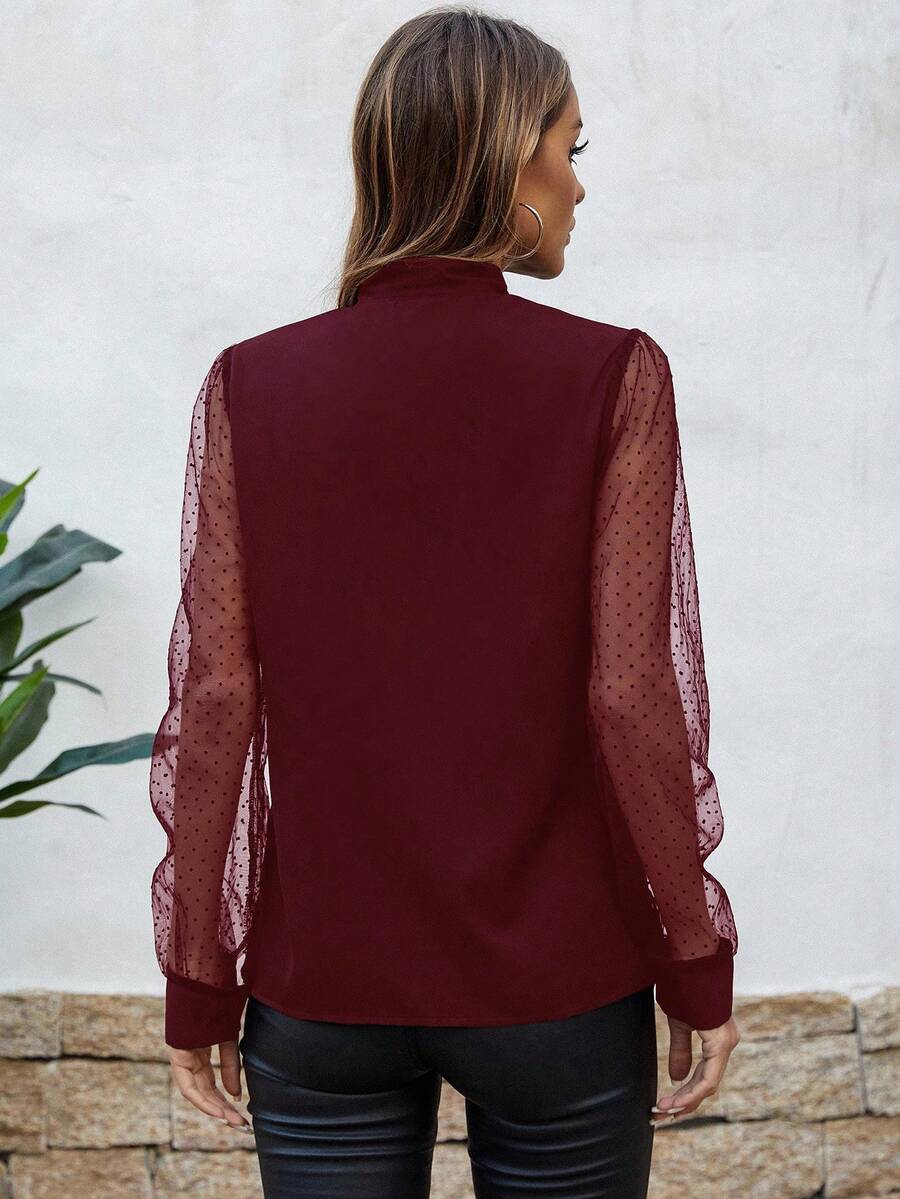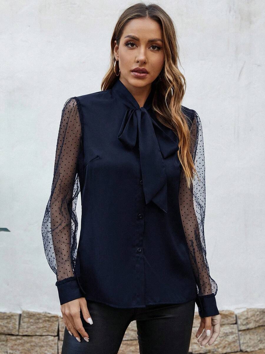 Camicetta da donna con collo a fiocco, con motivo a pois in contrasto e in rete
