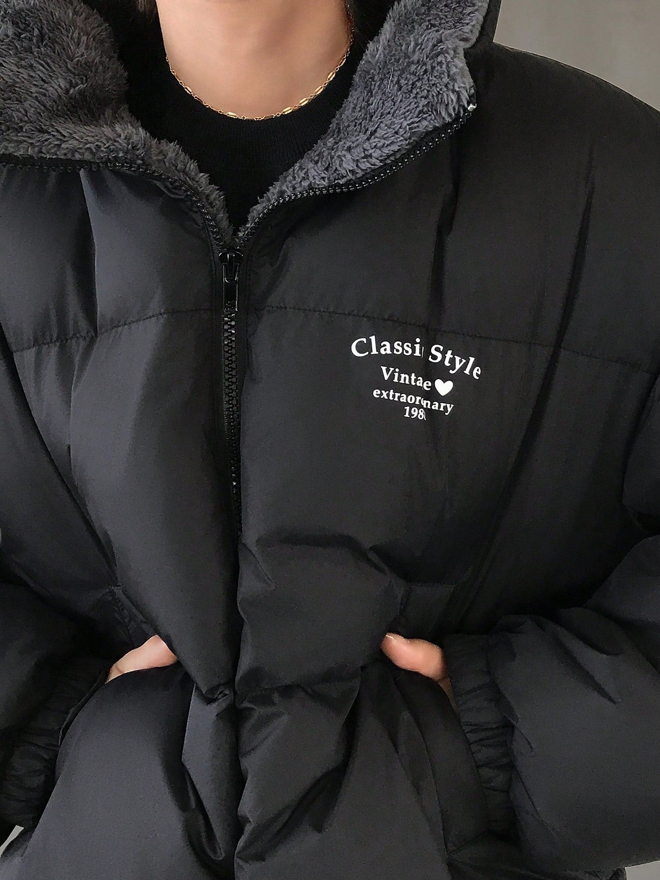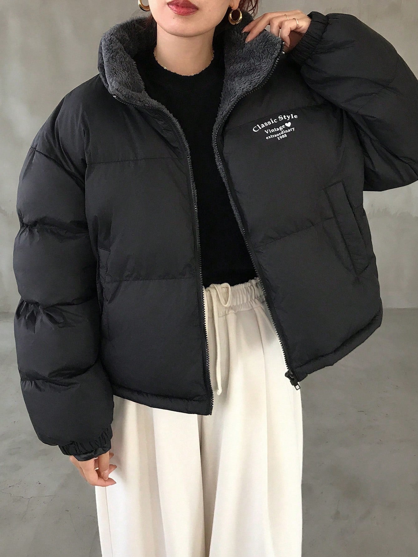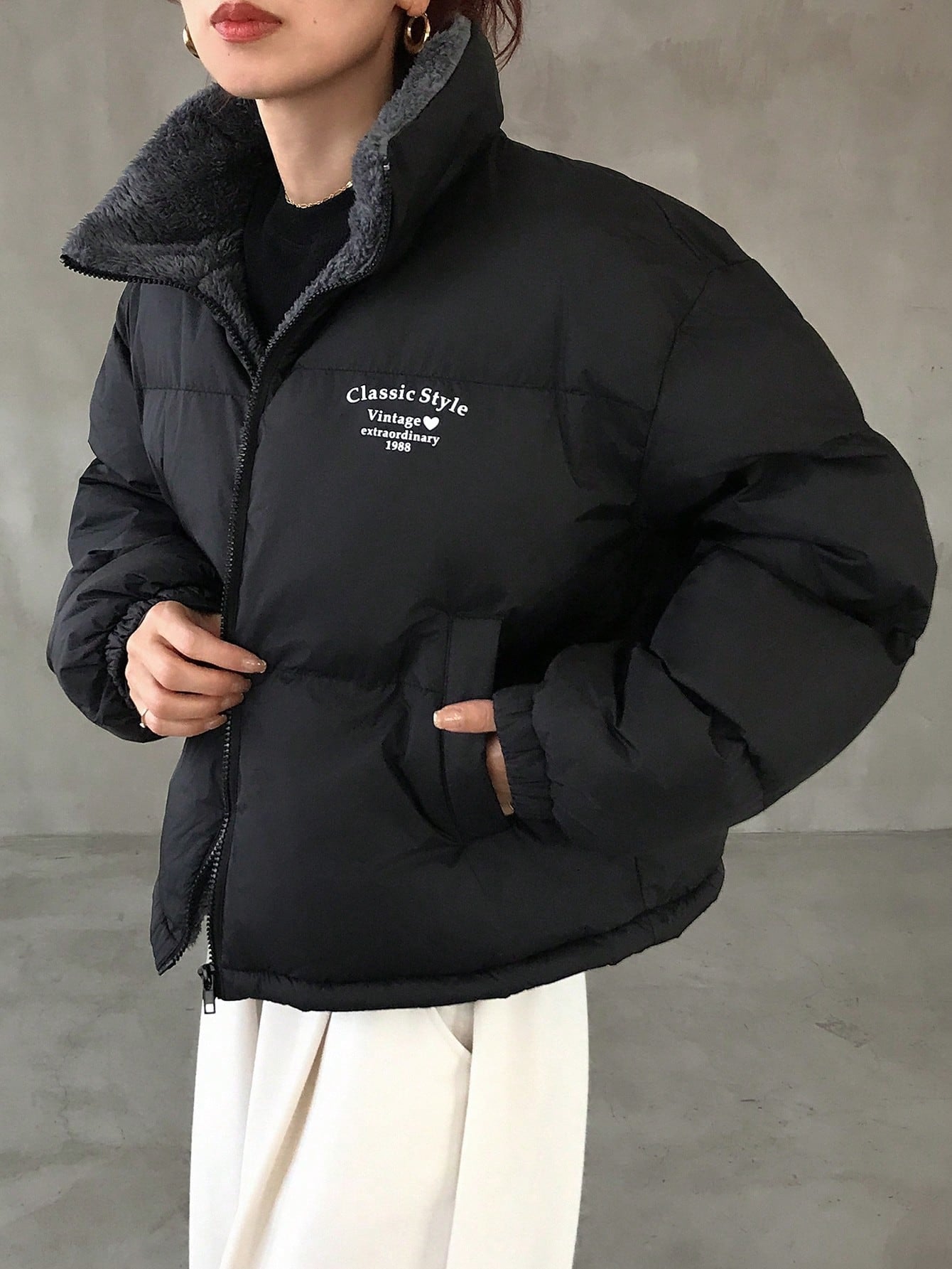 Cappotto casual versatile imbottito da donna, colore nero tinta unita, con stampa a lettere sul polsino e orlo