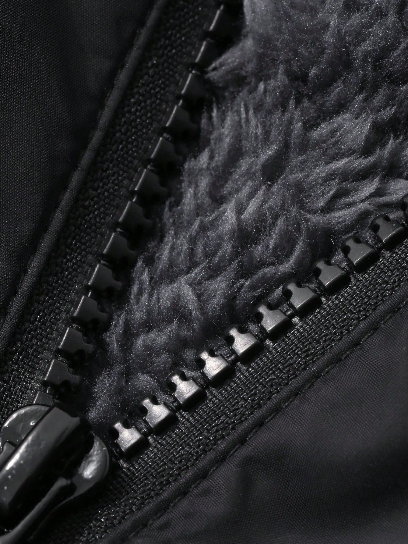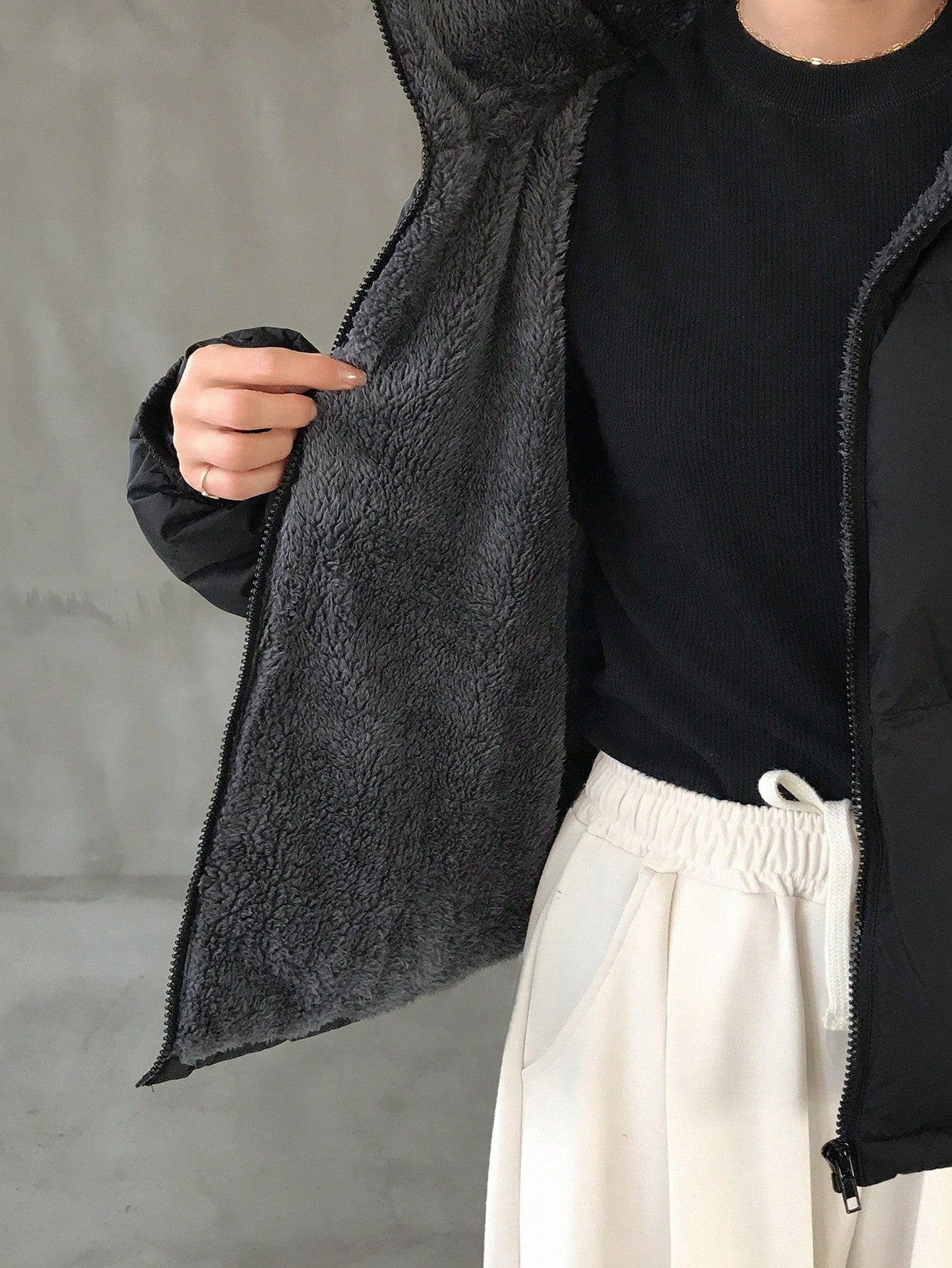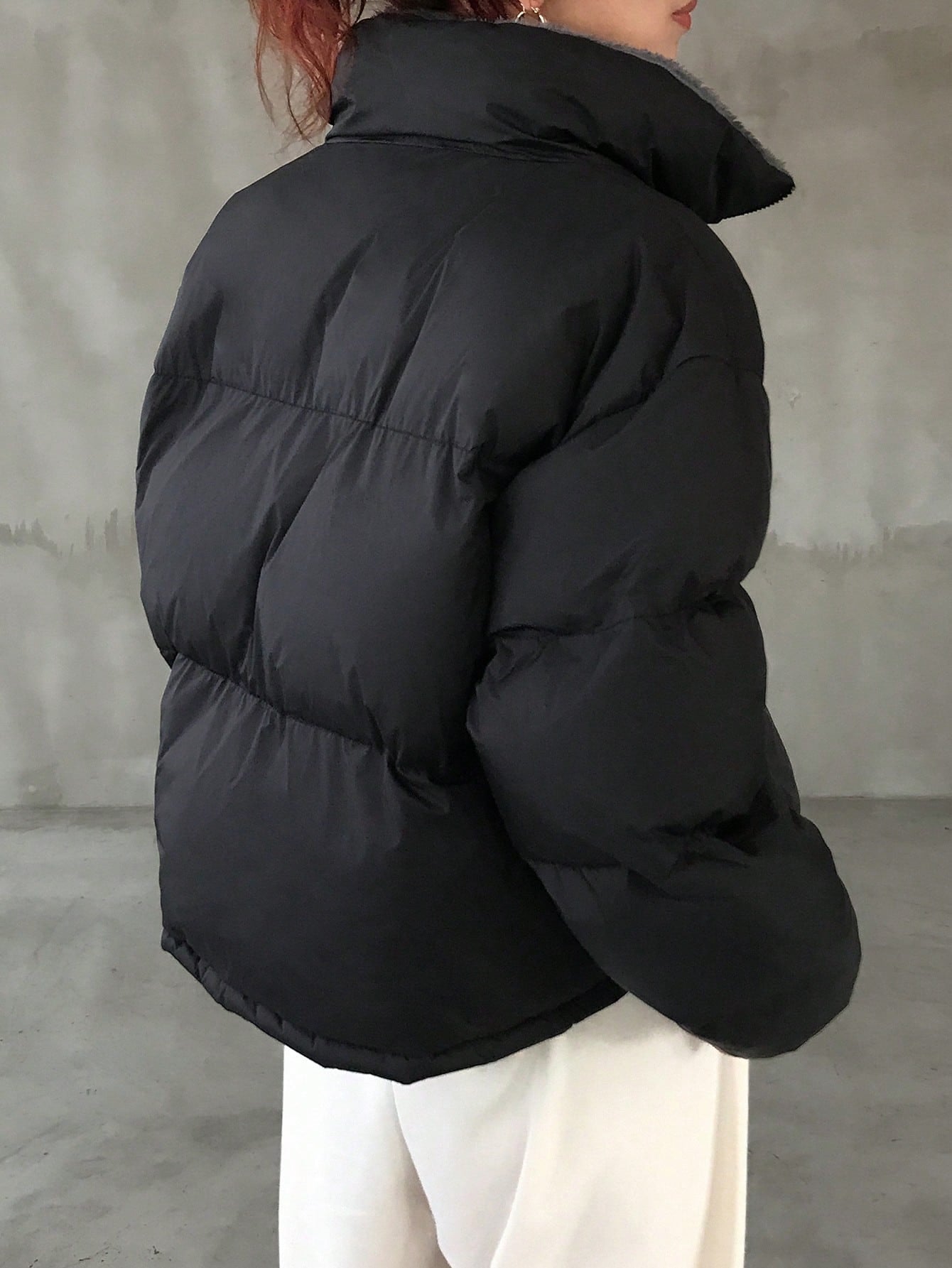 Cappotto casual versatile imbottito da donna, colore nero tinta unita, con stampa a lettere sul polsino e orlo