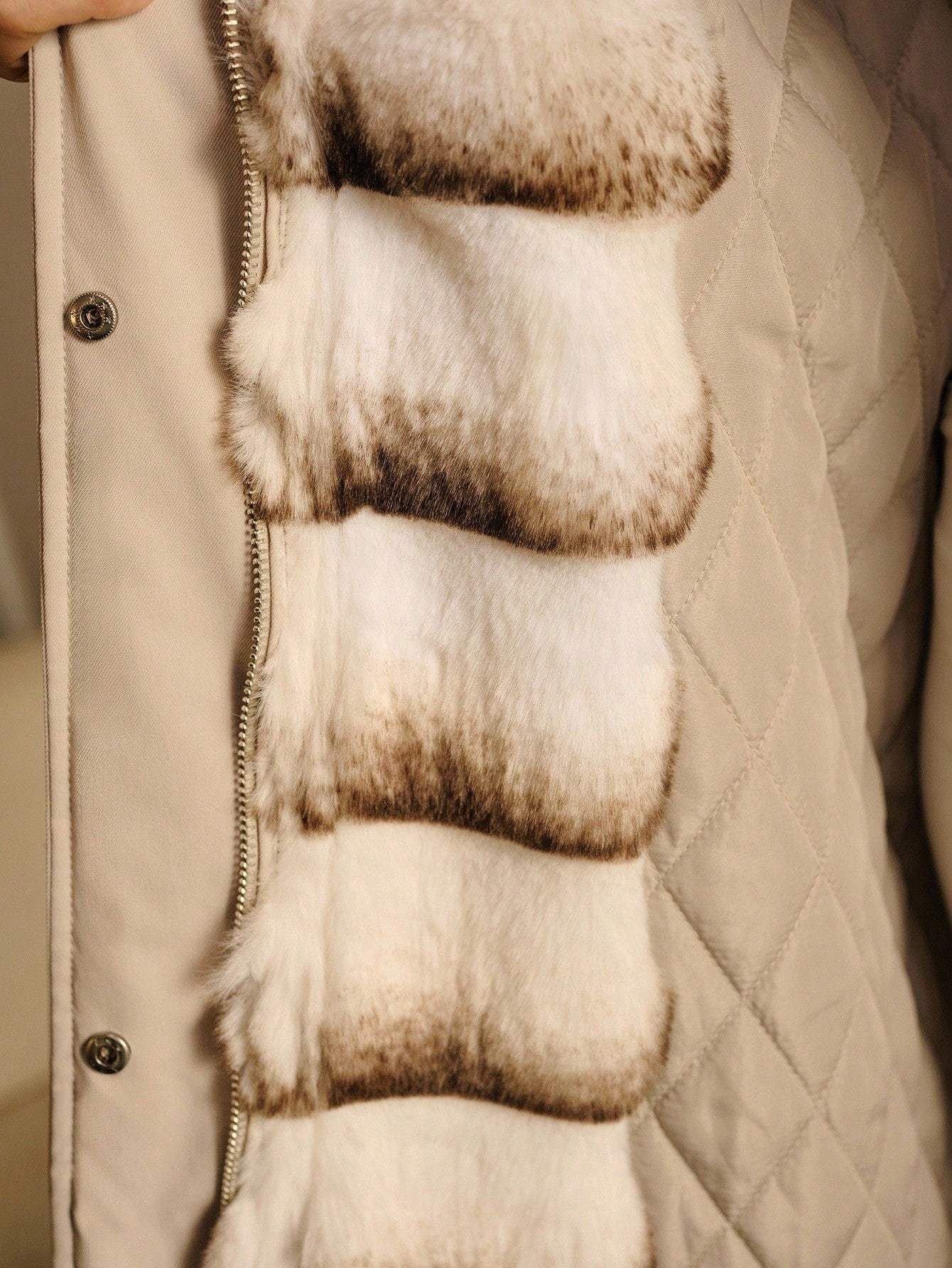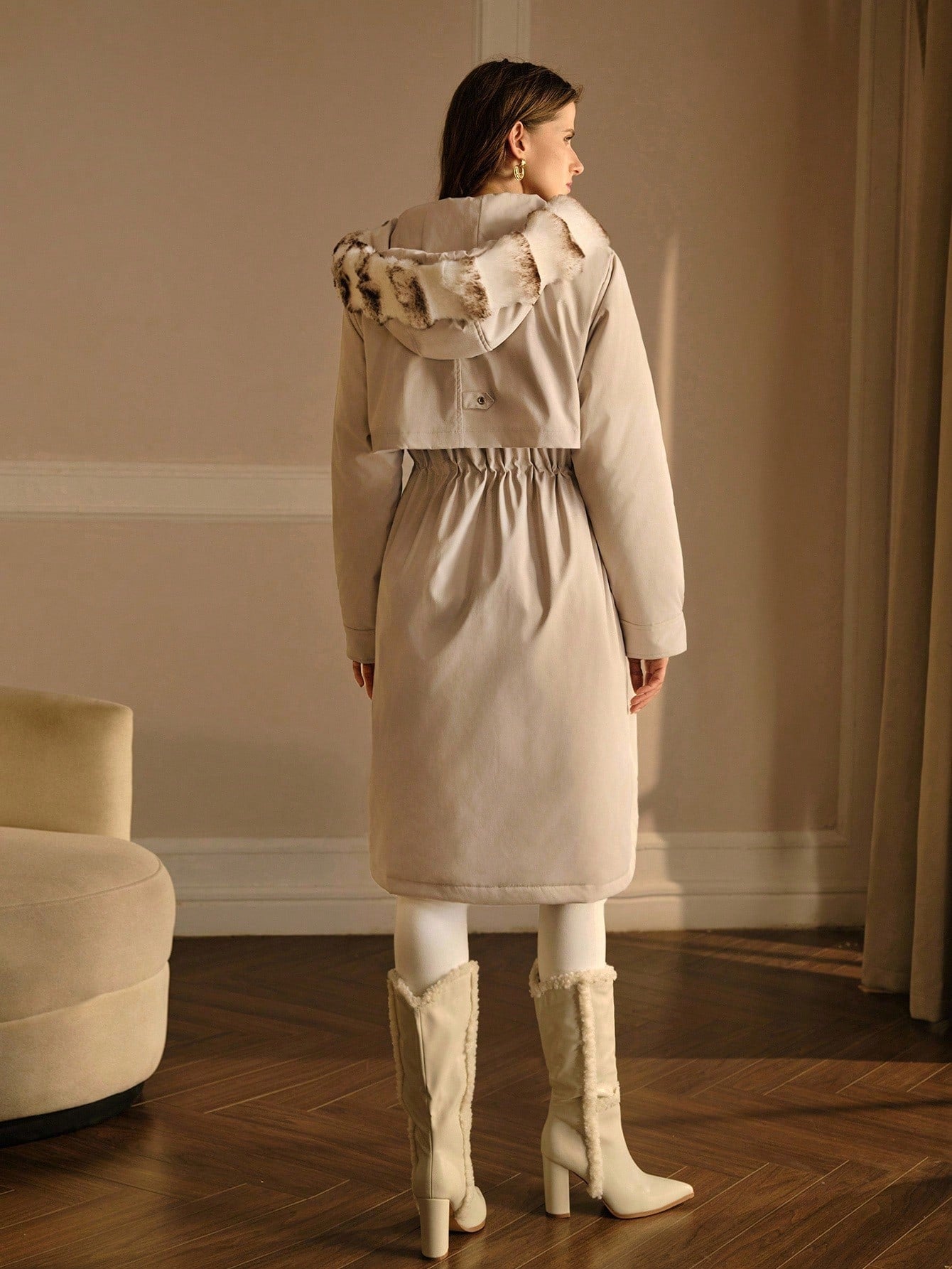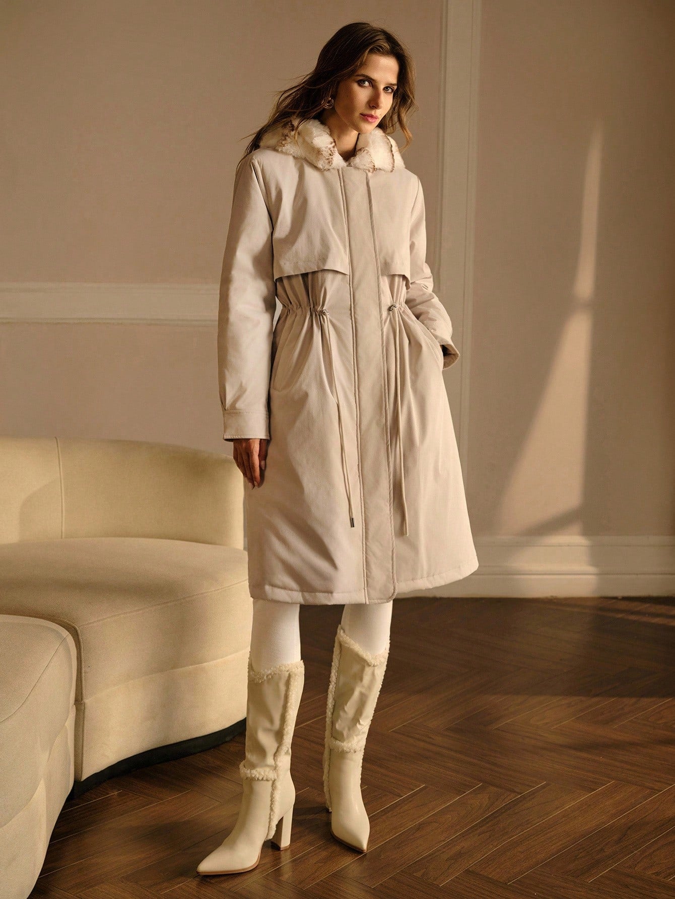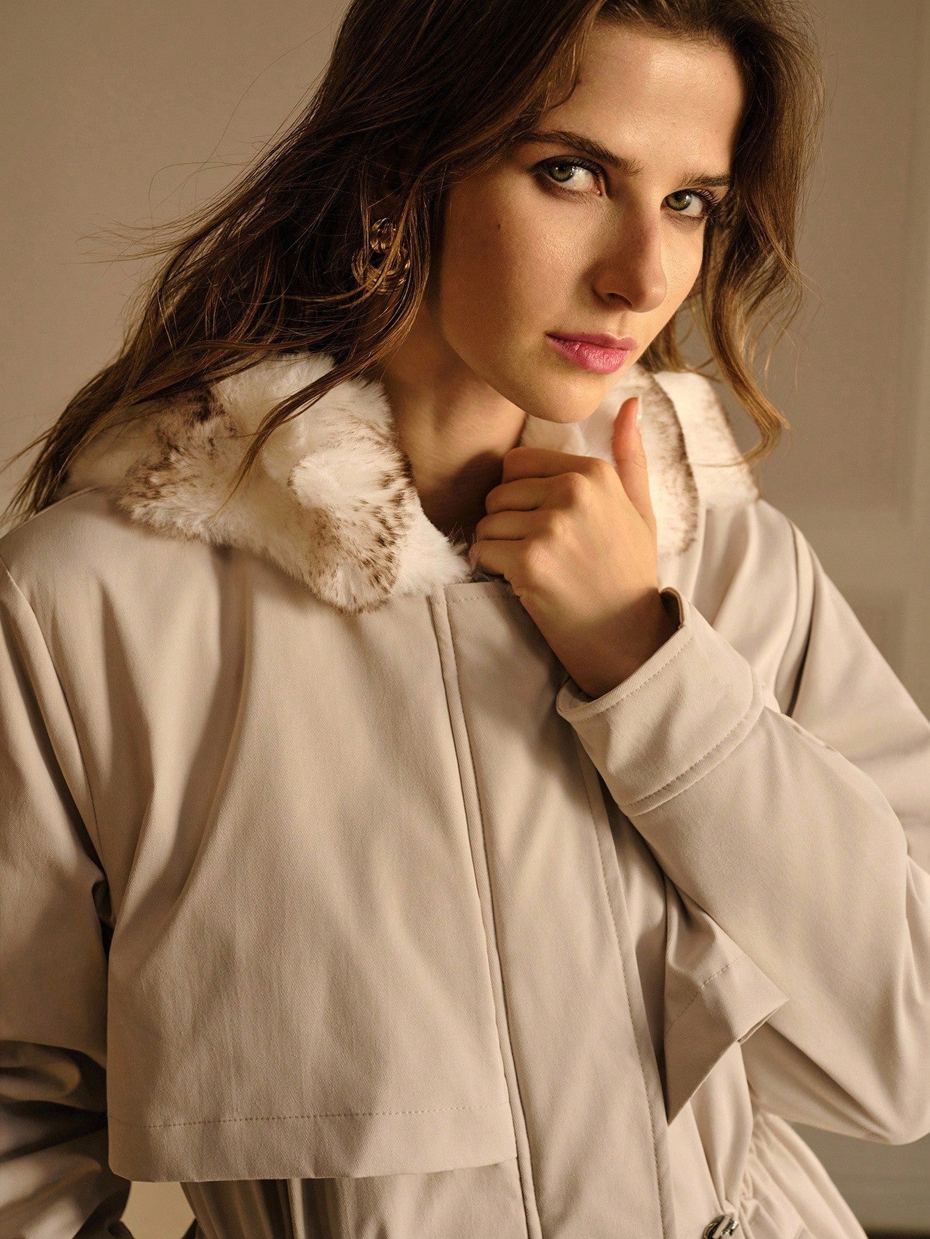 Cappotto con cappuccio e vita con coulisse, con colletto in pelliccia