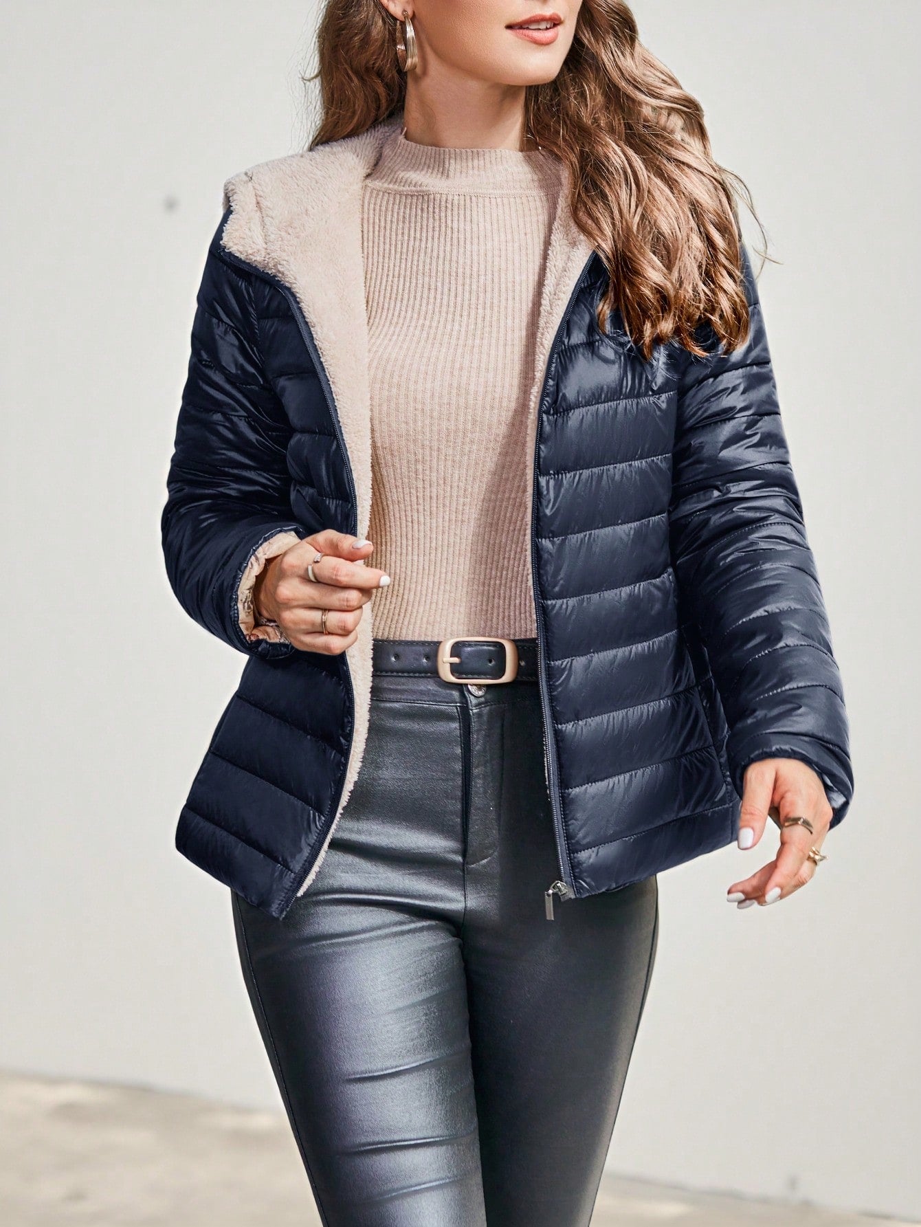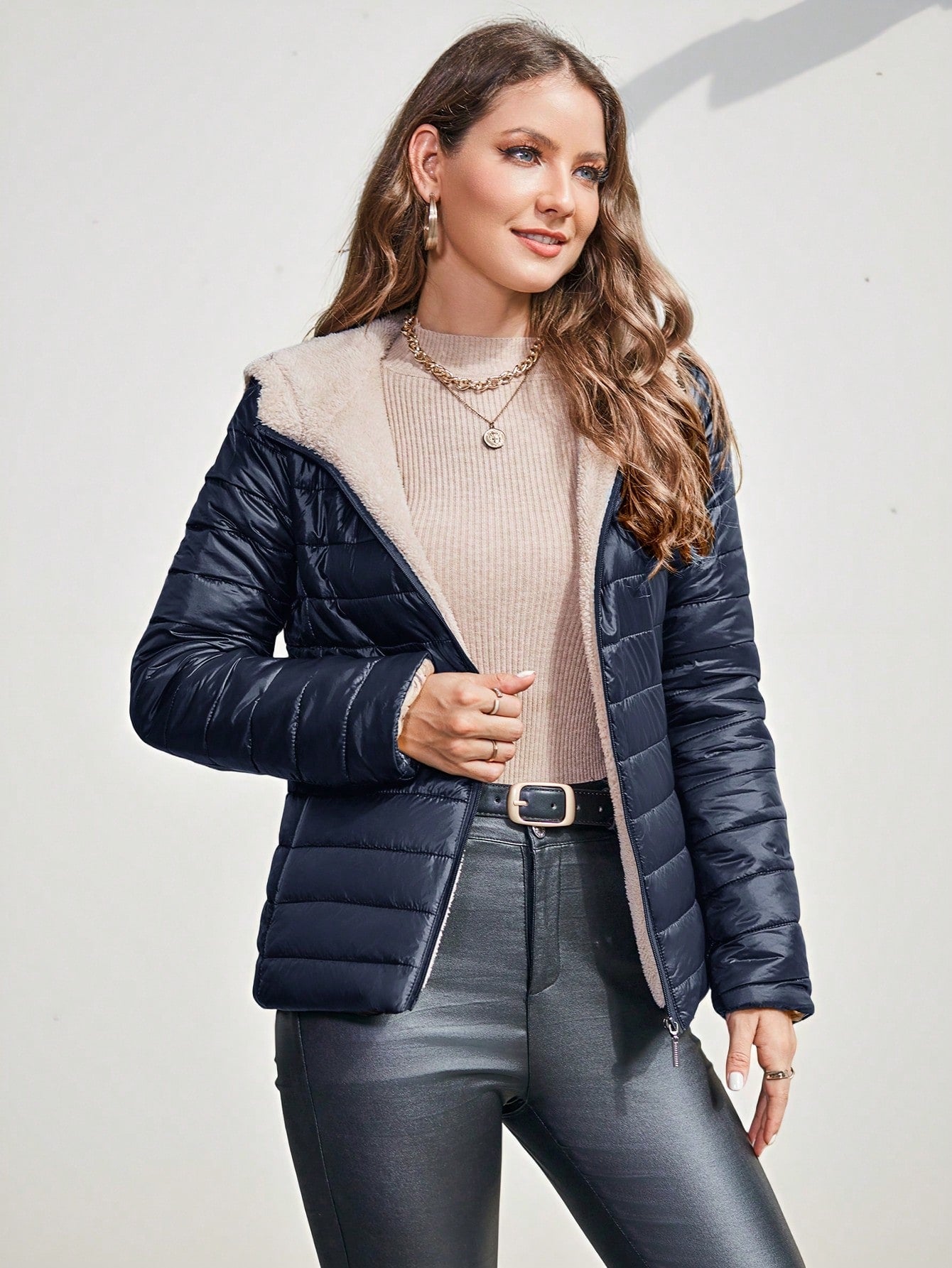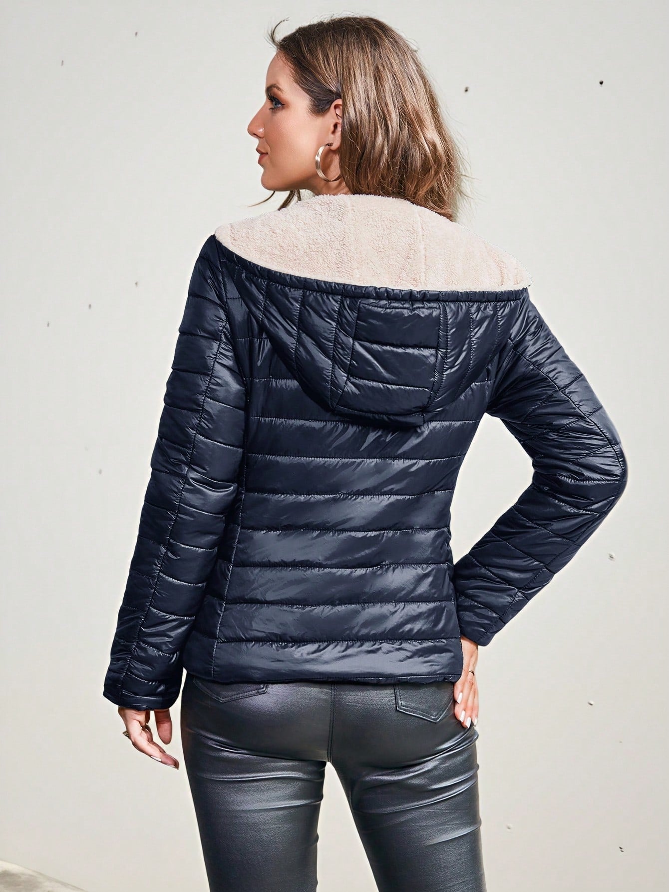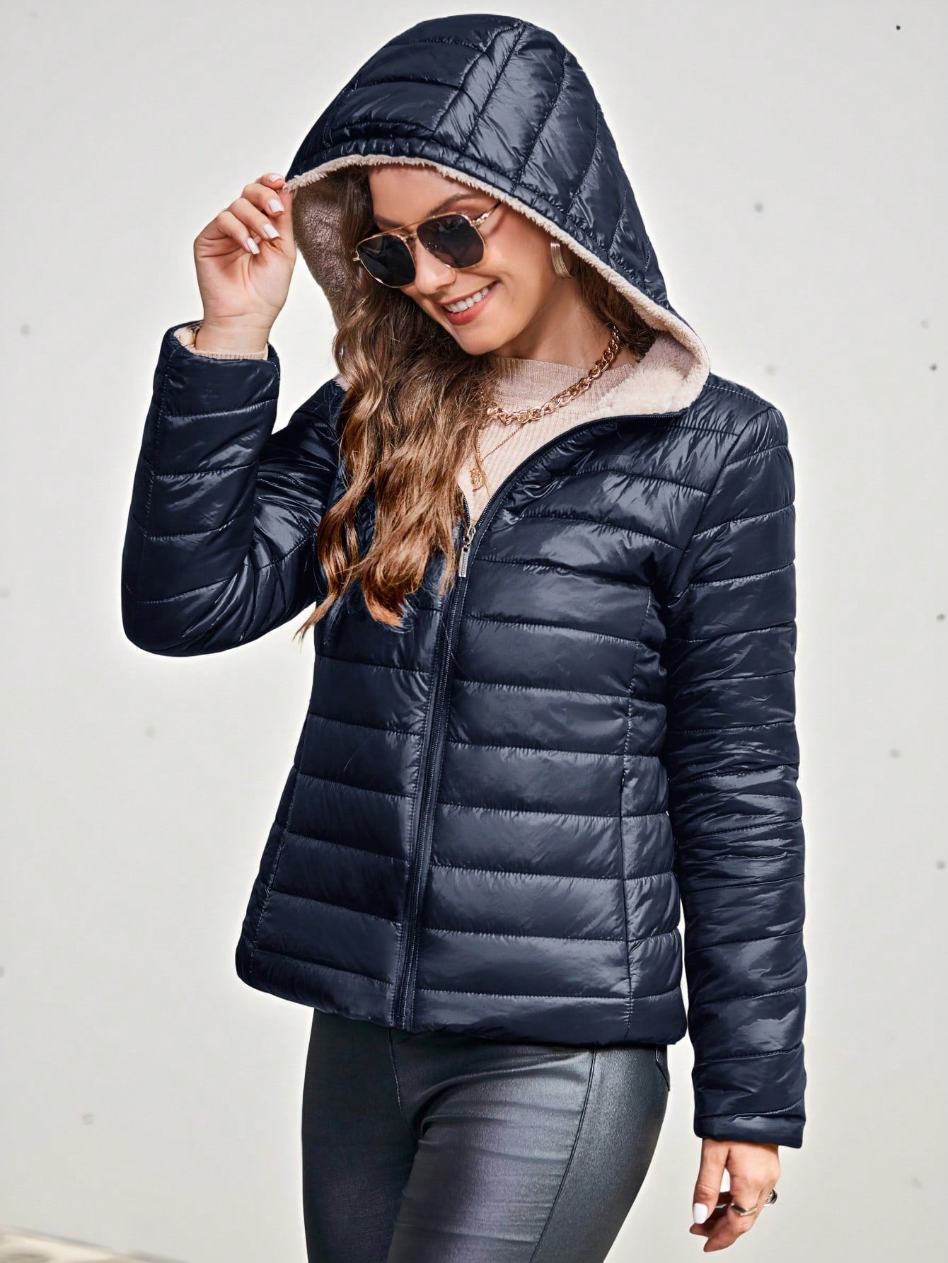 Cappotto imbottito con cappuccio, abbigliamento invernale casual e minimalista